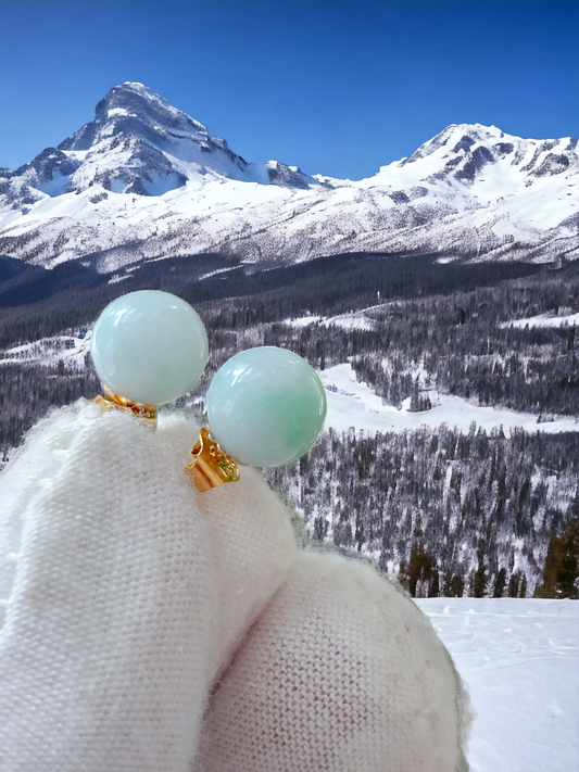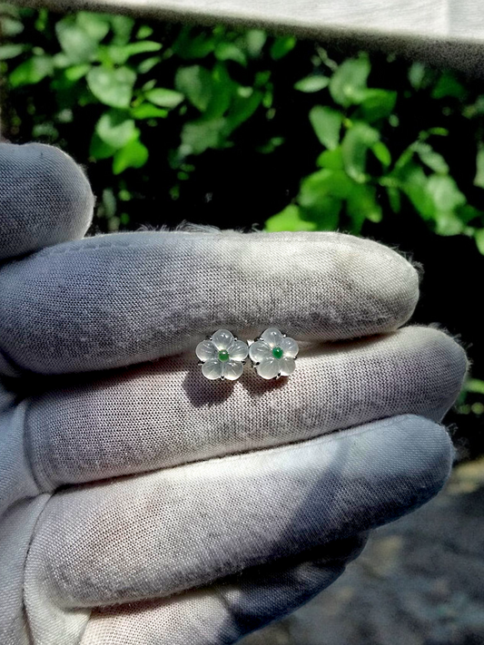 Hokkaido Flowers Burmese Green and White A-Jade Stud Earrings with Sterling Silver- Certified