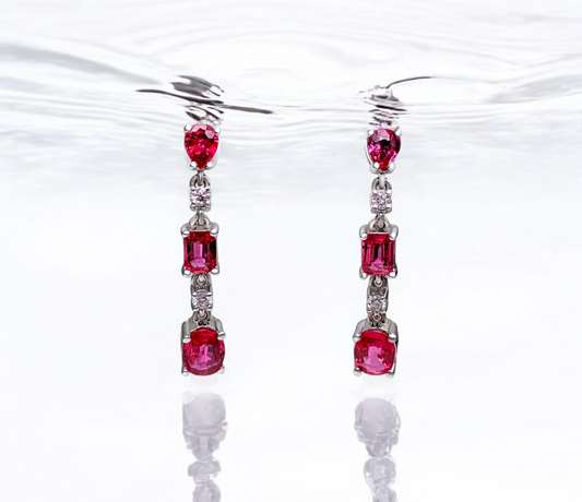 Alluring Drop and Dangle Red (No Heat) Ruby Link Earrings (with light pink Diamonds and 14K White Gold)