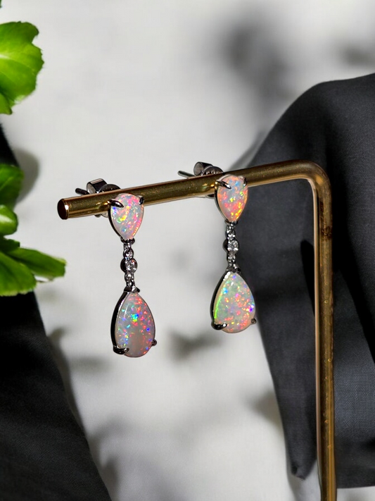 Australian Opal Drop and Dangle Earrings with 14K White Gold and White Diamonds - 3002