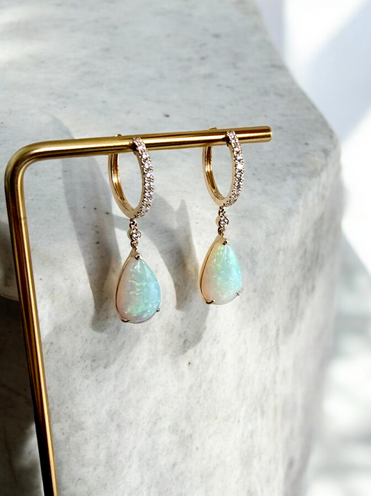 Australian Opal Drop and Dangle Earrings with 14K Yellow Gold and White Diamonds - 3003