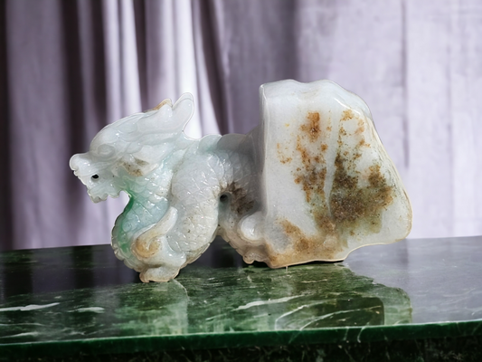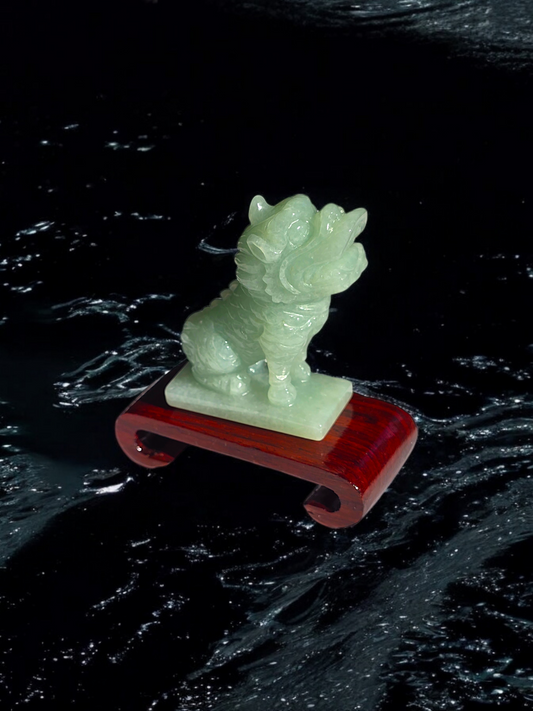 Japanese Kirin Carved Burmese A-Jadeite Ornament Showpiece with Stand