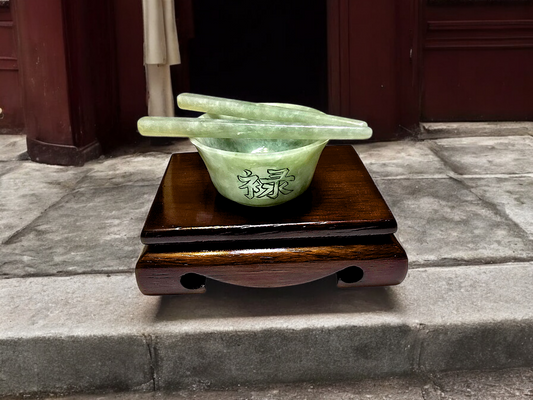 Oriental Fortune Carved Burmese A-Jadeite Bowl Set Ornament Showpiece with Stand