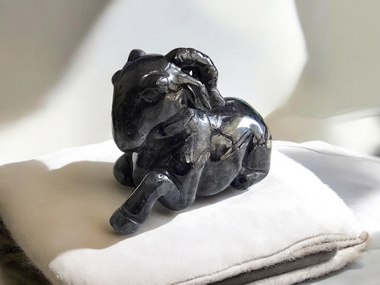 Relaxed Ram Black Burmese A-Jadeite Ornament Showpiece with a Wooden Stand