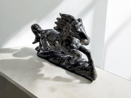 Galloping Horse Black Burmese A-Jadeite Ornament Showpiece with a Wooden Stand