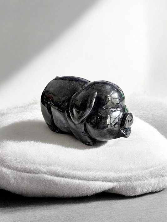 Playful Pig Black Burmese A-Jadeite Ornament Showpiece with a Wooden Stand
