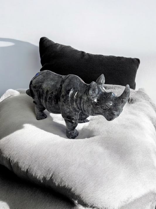 Poised Rhino Black Burmese A-Jadeite Ornament Showpiece with a Wooden Stand
