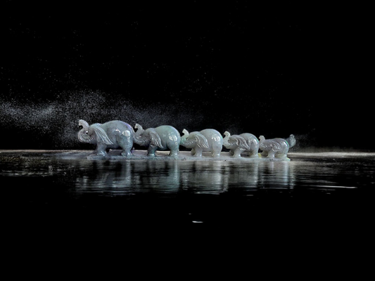 The Growth of Elephants Grey and Green Burmese A-Jadeite Ornament Showpiece with a Wooden Stand
