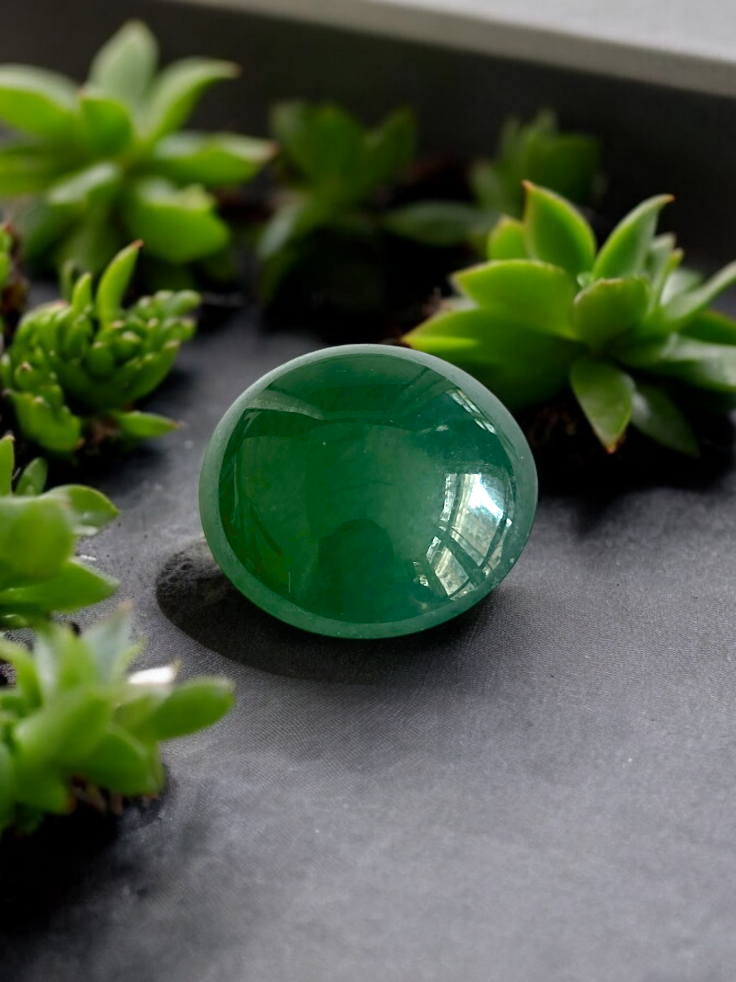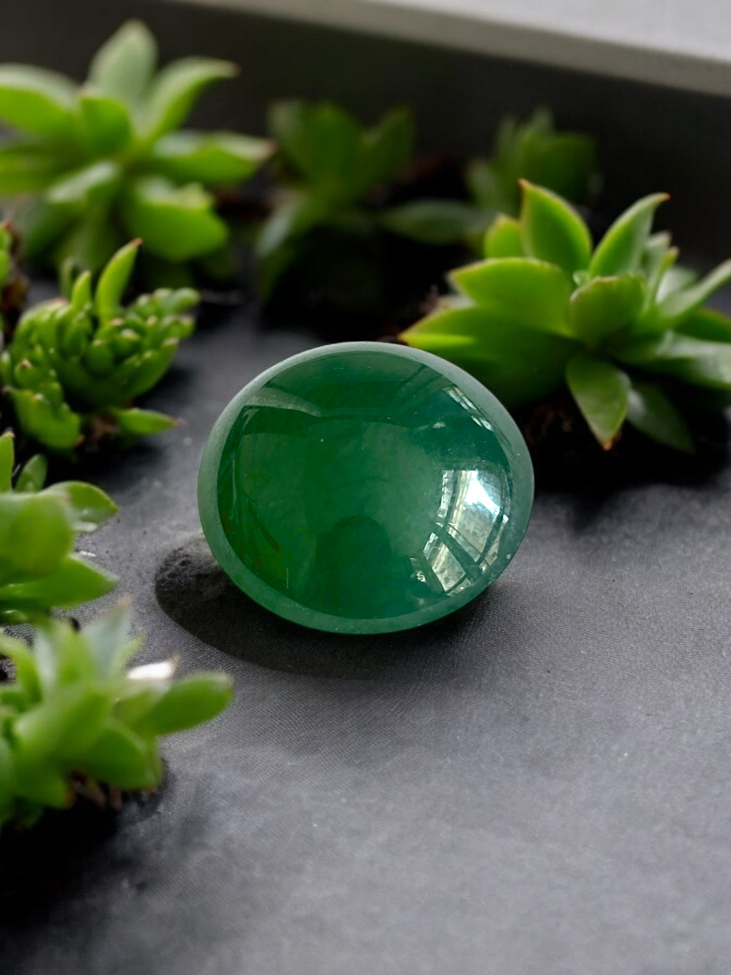 This Gem is a completely natural Burmese A-Jadeite, with no treatments or enhancements. We curate a single stone with high optical properties, Deep Bluish-Green Hues, and optimum translucency where the depth of color and transparency are balanced. Each Cabochon is a piece-unique, one-of-a-kind. No two Jadeite stones are ever created the same by nature, perfect for something truly exclusive. A great addition to any investment collection.