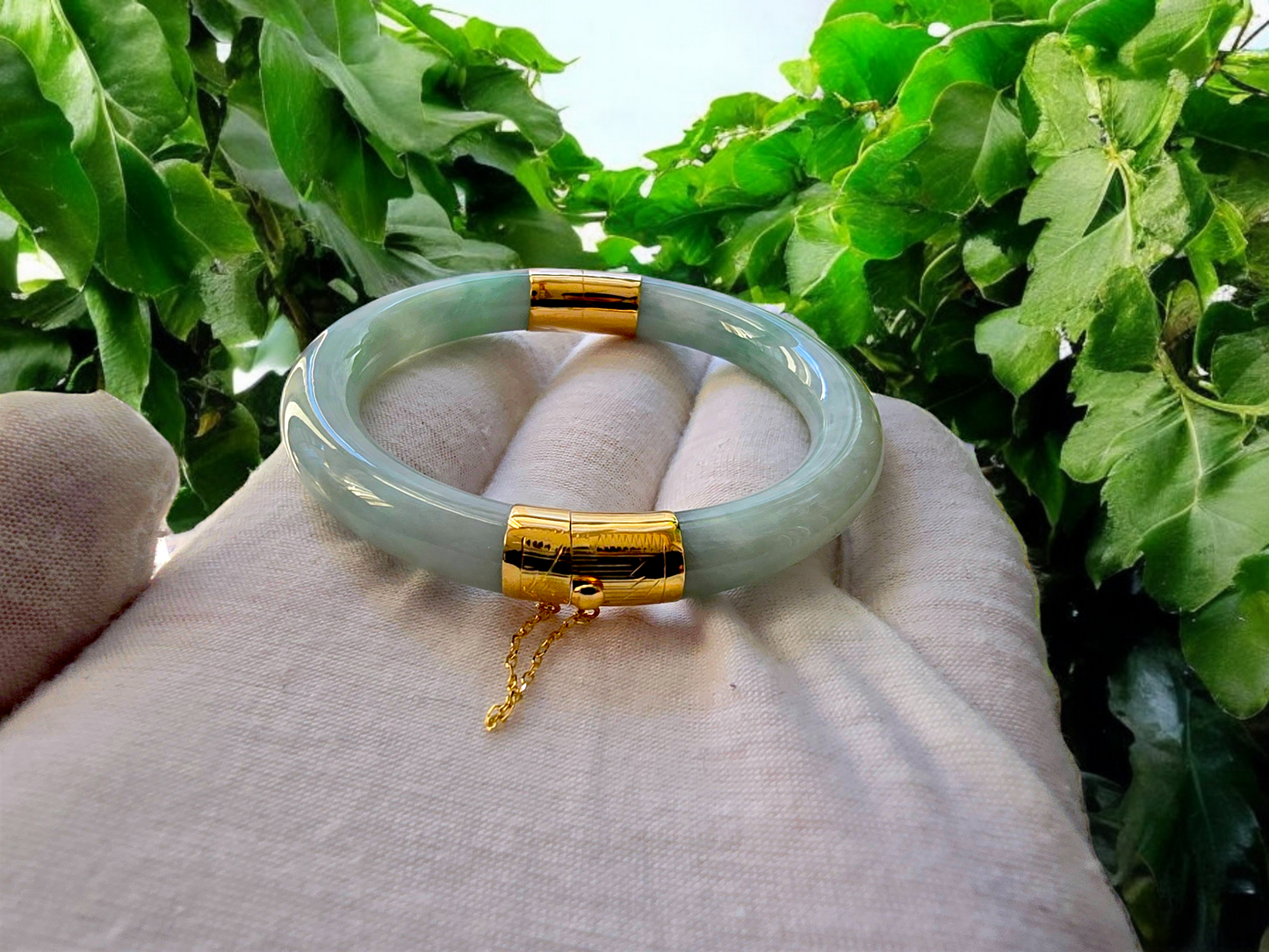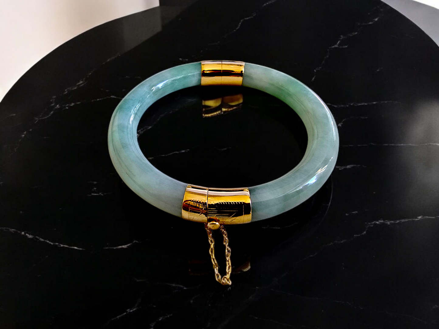 We picked Jadeite with superior optical properties, quality, translucency, hues and patterns. The 'Viceroy's Circular Burmese Jade Bangle Bracelet' uses an ergonomic circular shape to fit one's wrists at an angle that accentuates the Yellow Gold and Jade Elements. We incorporate our signature Clasp with a chain for the best wearing experience.