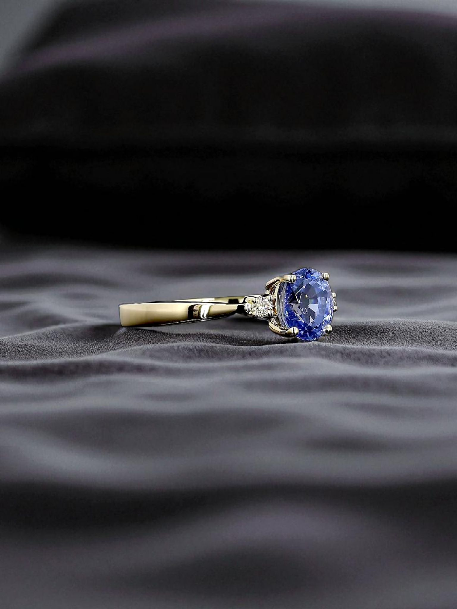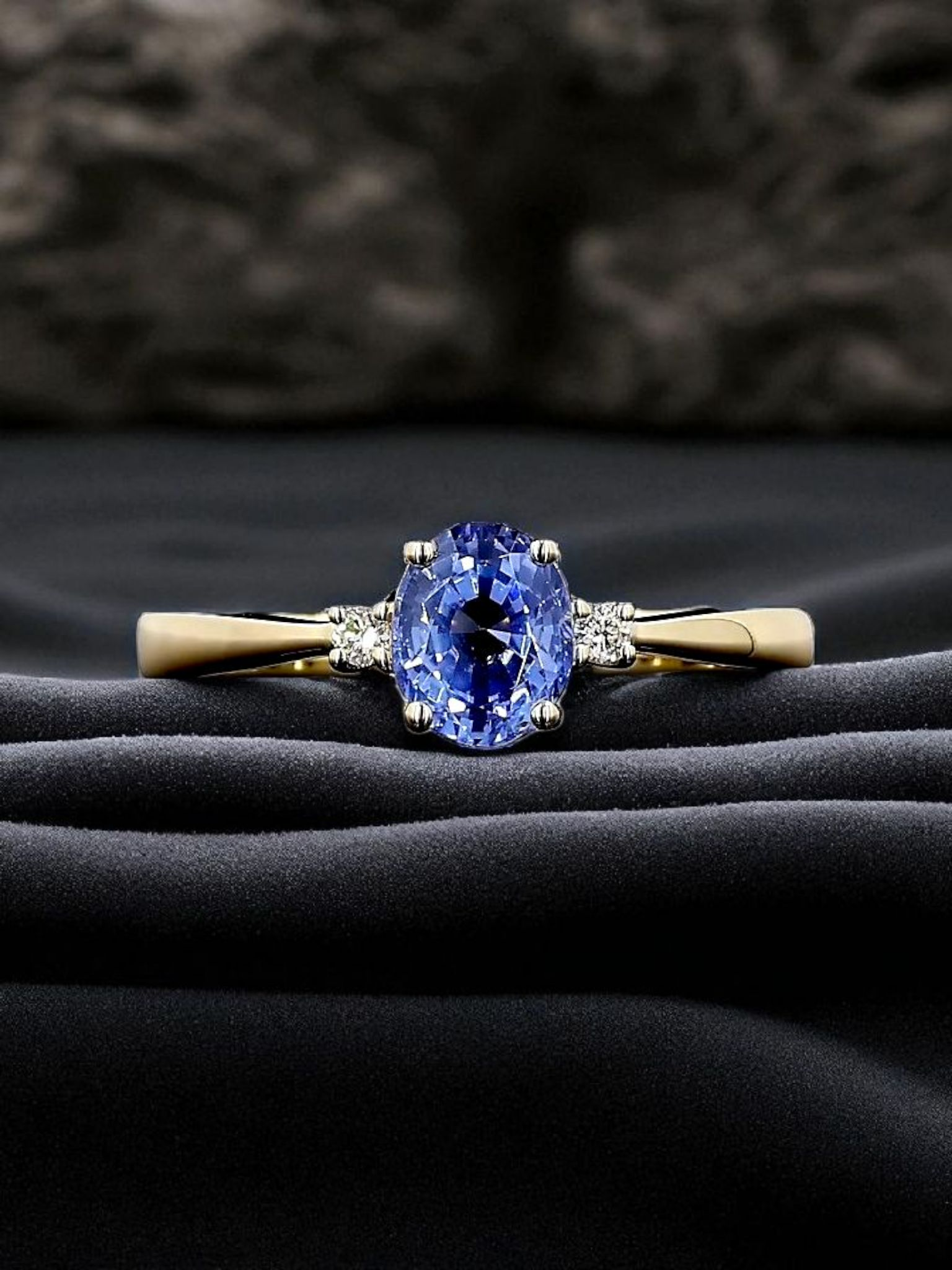 Materials: Certified Oval Shape 1.17cts. Natural Blue No Heat Sapphire, Natural Round VS Diamonds, 1.99g Solid 14K Yellow Gold