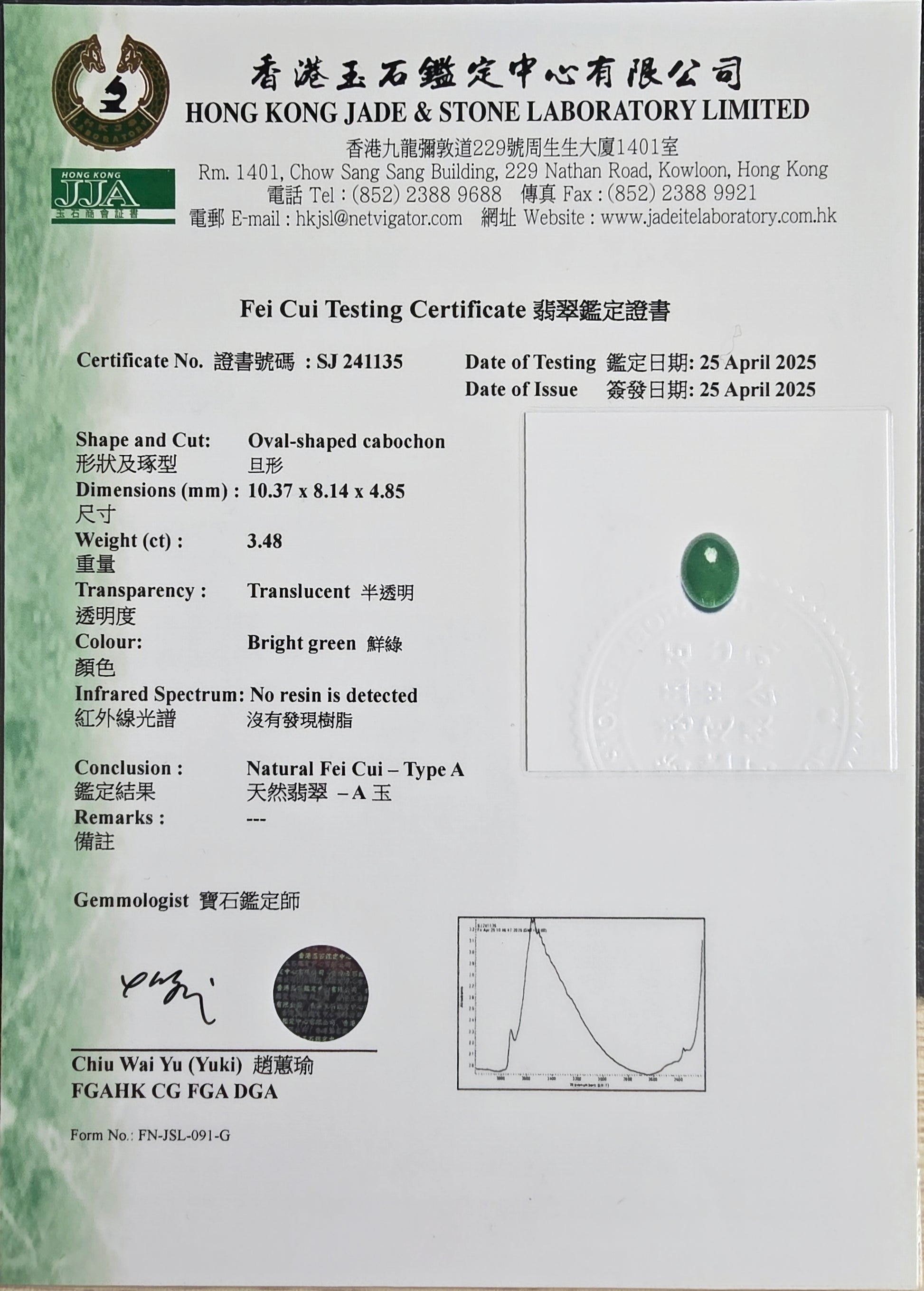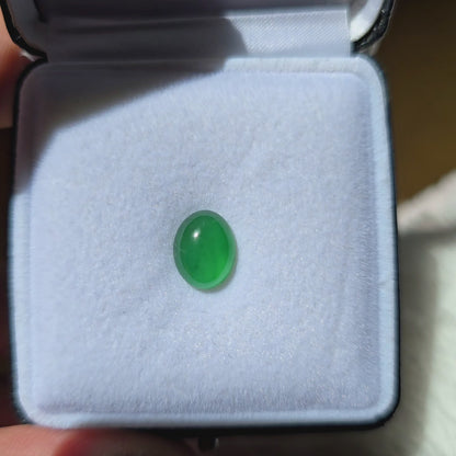 HKJSL Certified 3.48 cts. MADE IN JAPAN Intense Vivid Bright Green Burmese A-Jadeite Oval Shaped Cabochon stone.