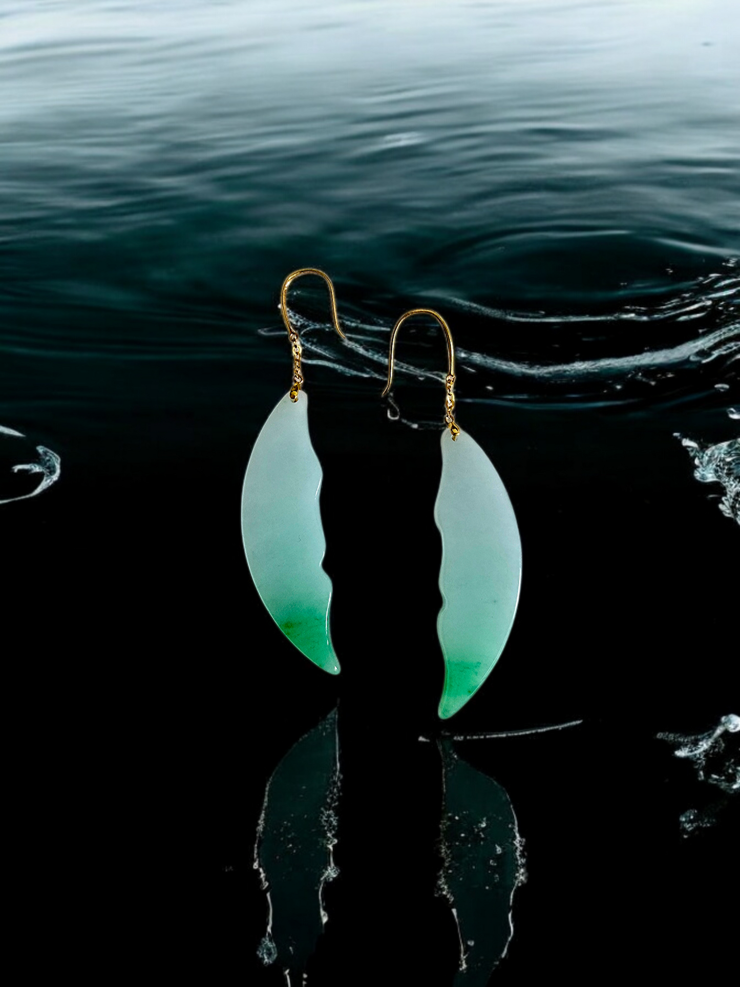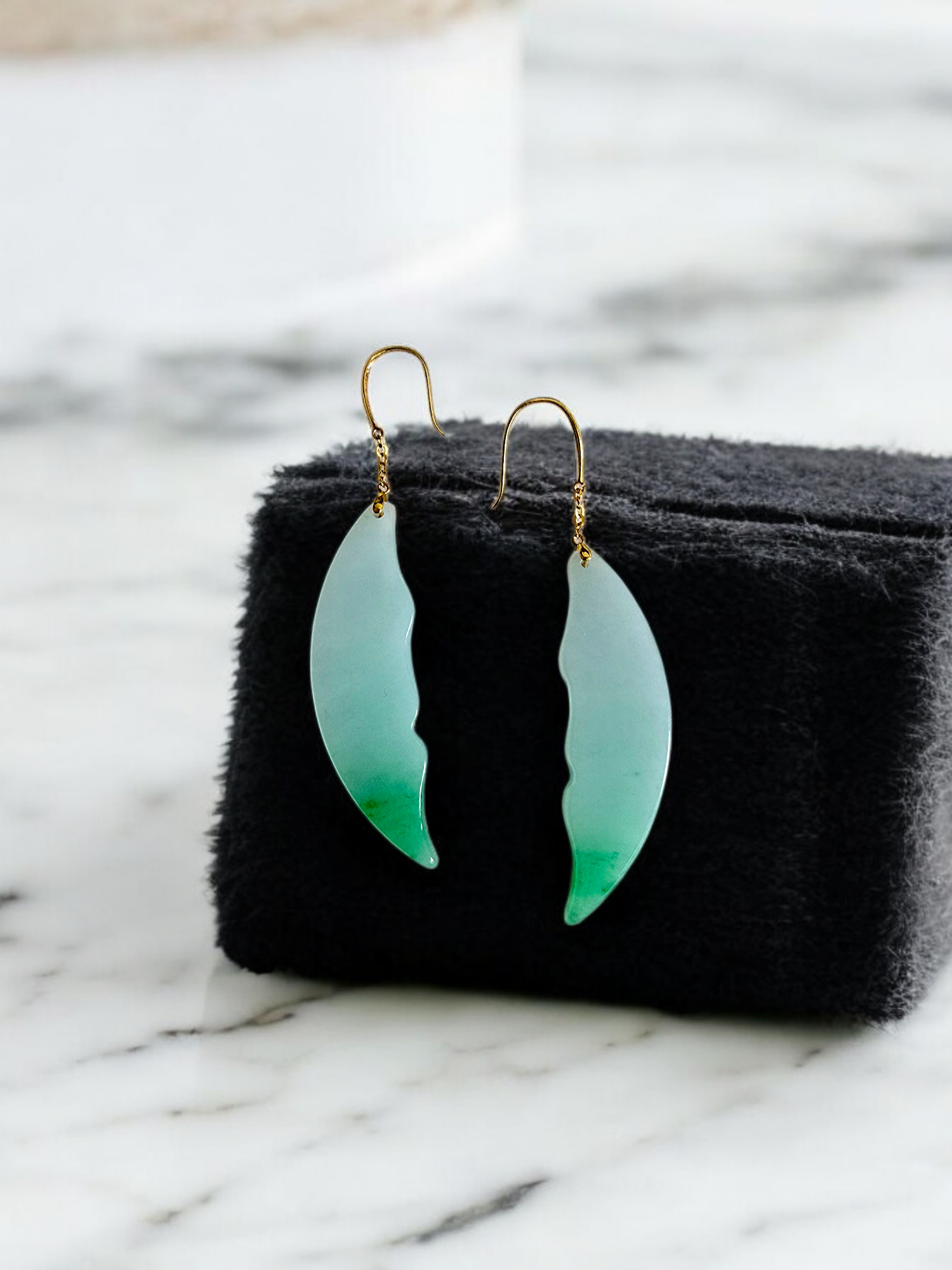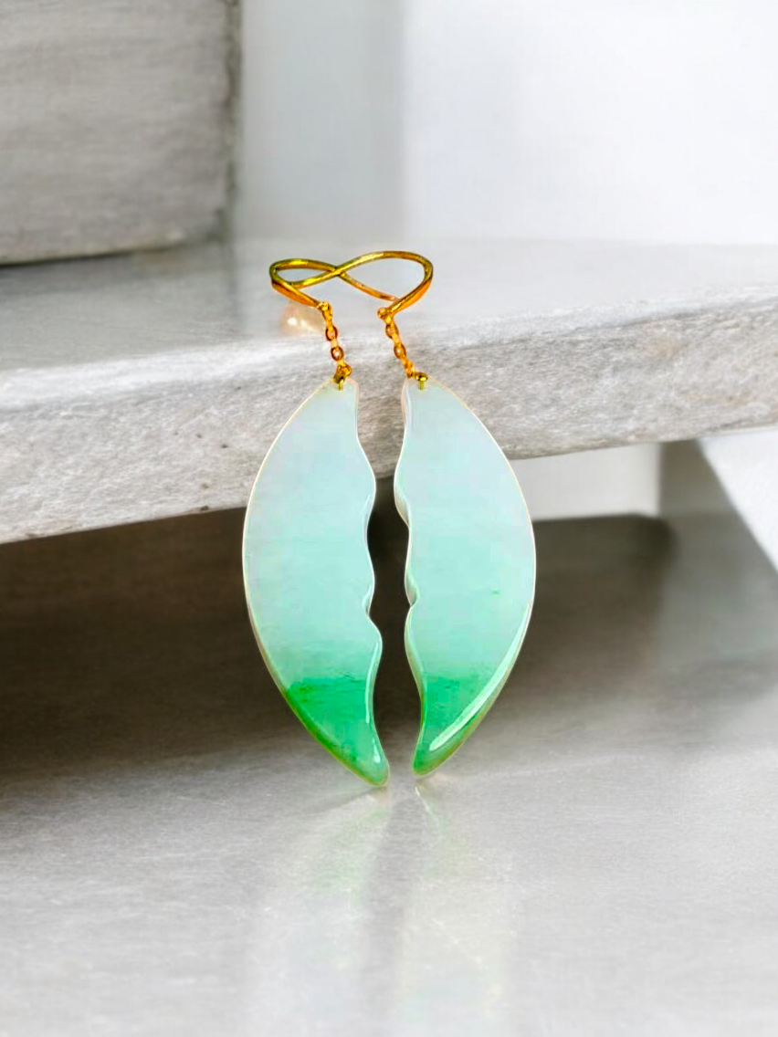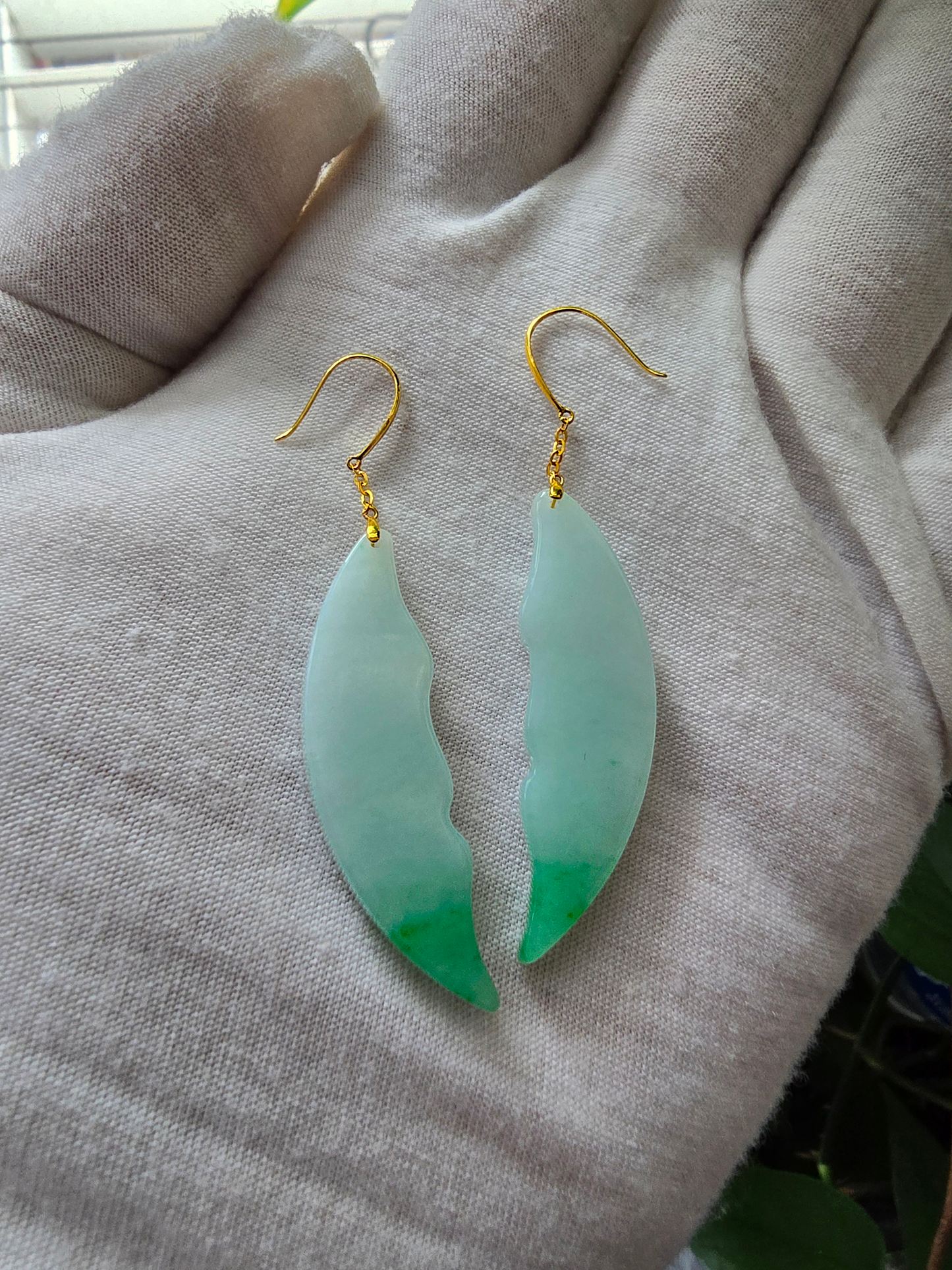 Our Certified Shingetsu Crescent Drop and Dangle French Hook Burmese A-Jade Earrings (with 18K Yellow Gold) are made from handpicking Green Burmese A-Jadeite, with superior translucency, hues and optics. 'Shingetsu' means New Moon, symbolising new beginnings and prosperity.