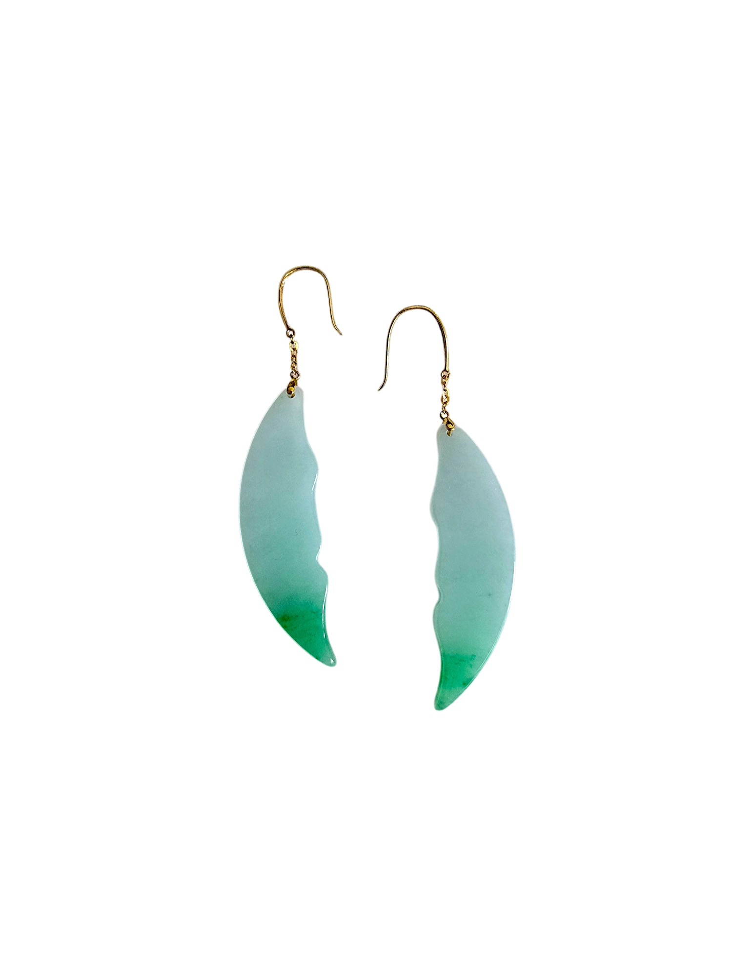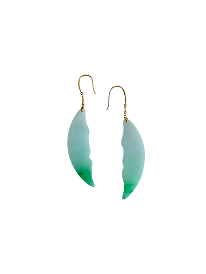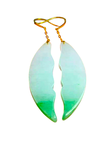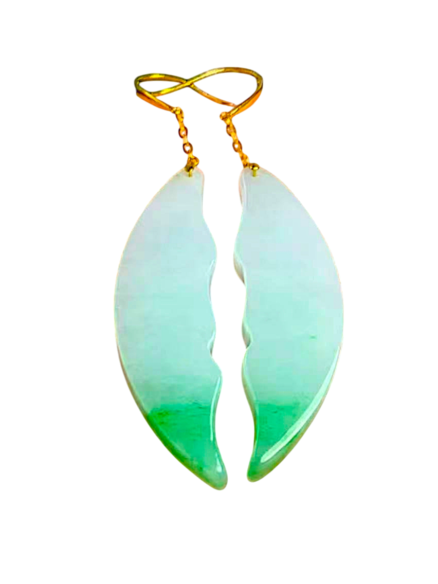 With streaks and patches of Imperial Green, the highest desirability in Jadeite, this creation displays gorgeous light effects. We create stunning drop and dangle earrings with perfectly matched carved crescent Moons. We use one block of jade and carve it into two identical earrings for the best quality look. Paired with 18K Solid Yellow Gold Bales and French Hooks.