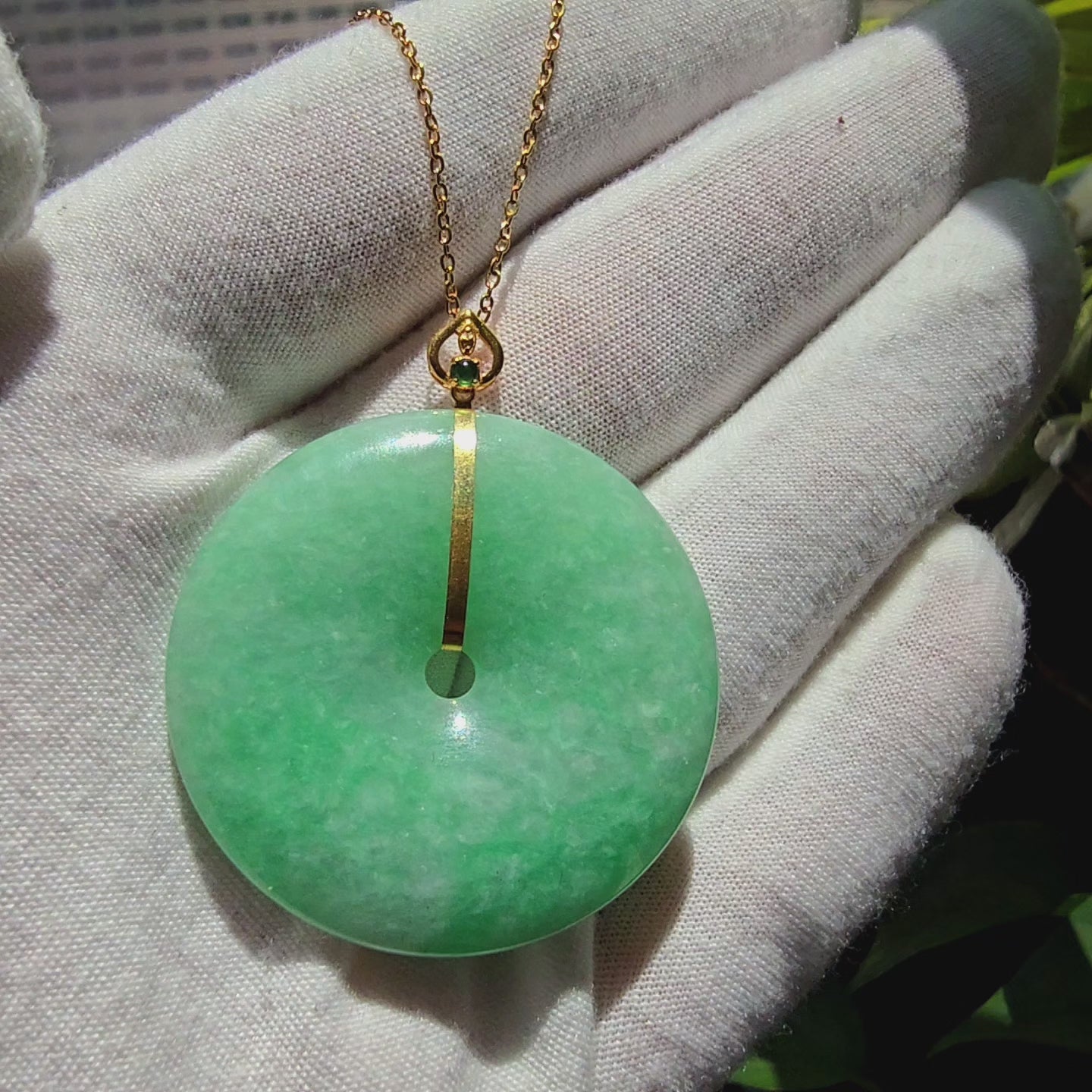 Certified 40mm Cheung's Round Donut Burmese Green A-Jade Jadeite Pendant (with 18K Solid Yellow Gold)