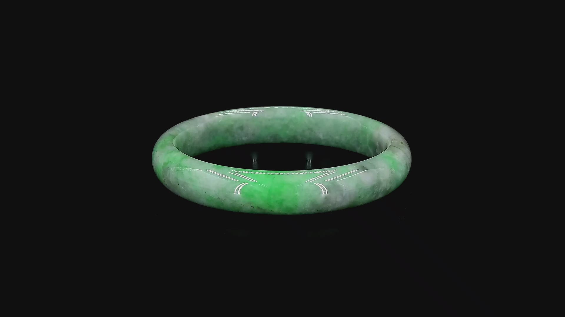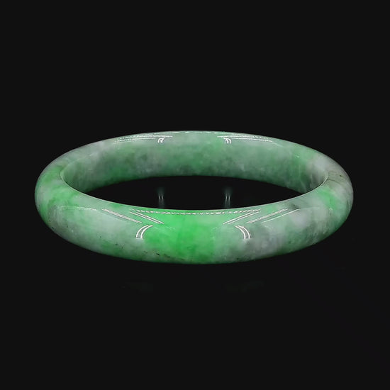 Using the best Handpicked untreated natural A-Jadeite from Burma, we created an authoritative and classy statement bangle bracelet. This unique block of Jadeite has Vivid Imperial Green marbling, patches and splashes of Vibrant Green, Deep Green, Black and White. Interlaced with fibrous white patterns, the optical effect is stunning. The Fibrous and splashy texture and icy translucency in parts, are blended with depth of color and splashes of pattern.