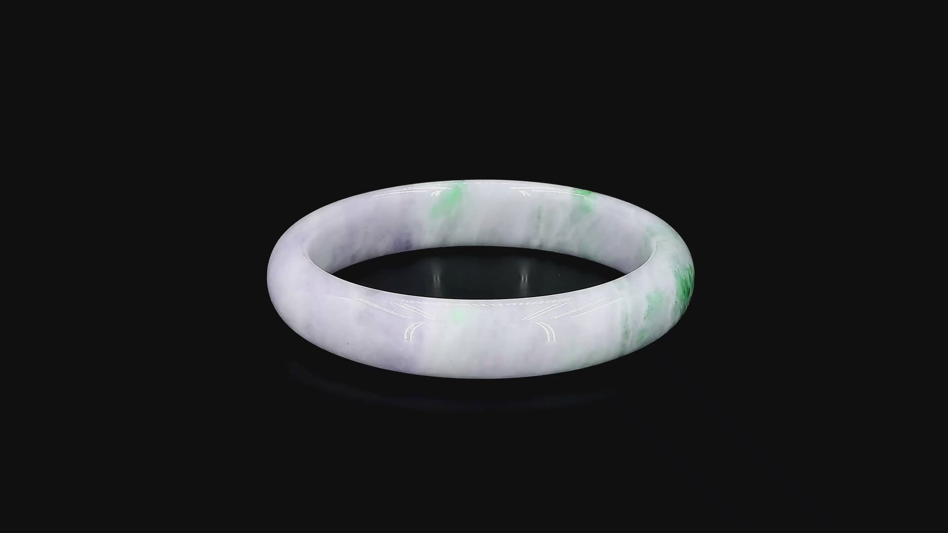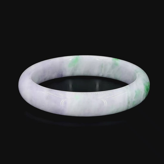 Using the best Handpicked untreated natural A-Jadeite from Burma, we created an authoritative and classy statement bangle bracelet. This unique block of Jadeite is a two-tone Green and Lavender rarity, and has a base of Lavender, with Bright Green marbling, patches and splashes of Vibrant Green, Deep Green, Deep Lavender, and White. Interlaced with fibrous interwoven patterns, the optical effect is stunning. The Fibrous texture and icy translucency in parts, are blended with depth of color and splashes of pattern.
