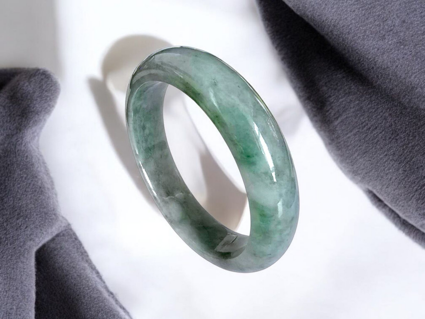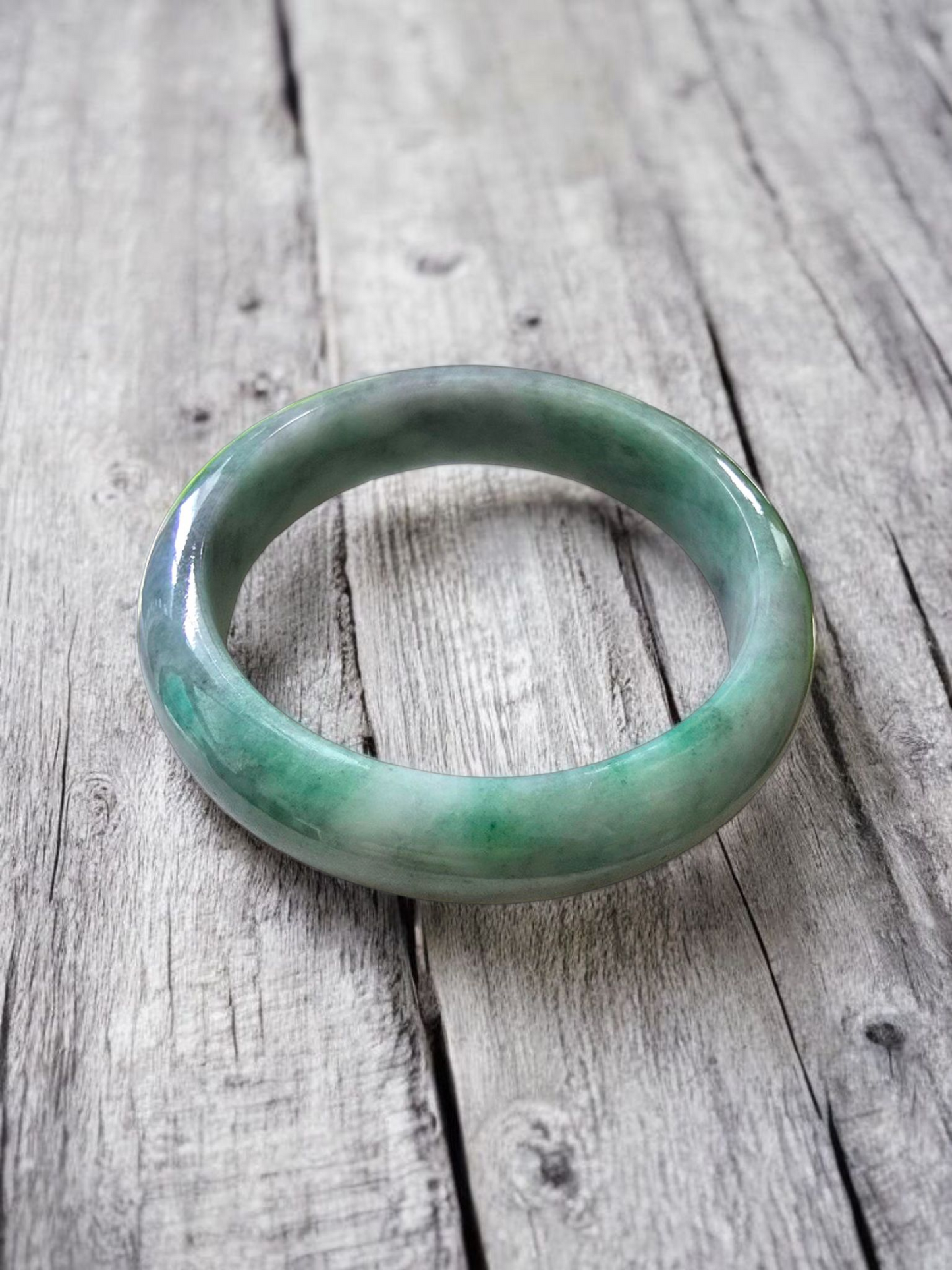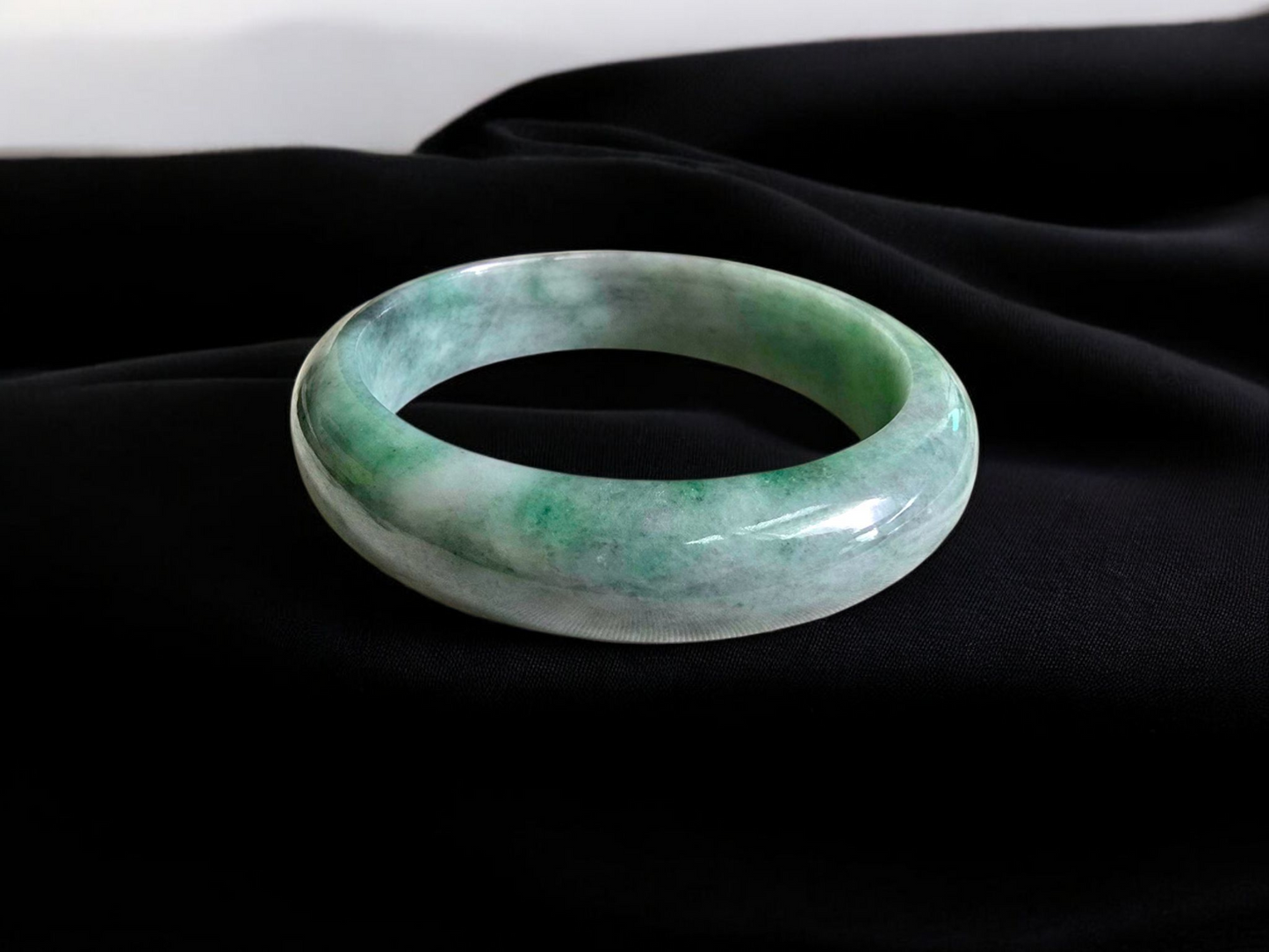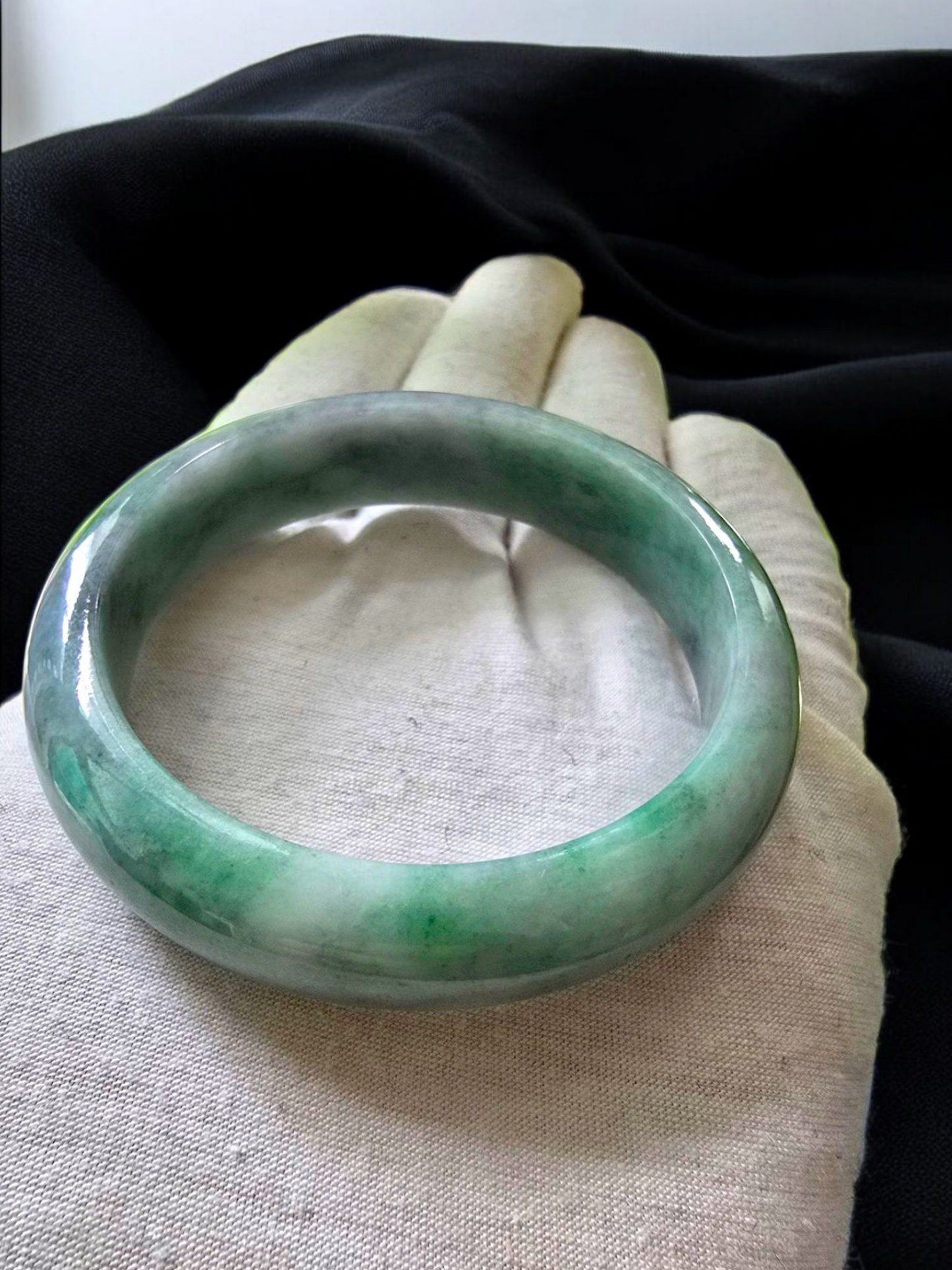 Using the best Handpicked untreated natural A-Jadeite from Burma, we created an authoritative and classy statement bangle bracelet. This unique block of Jadeite has a Green base hue, with marbling, patches and splashes of Deep Green, White, and Black. Interlaced with fibrous and patchy interwoven green patterns, the optical effect is stunning. The Fibrous texture and icy translucency in parts, are blended with depth of color and splashes of pattern.