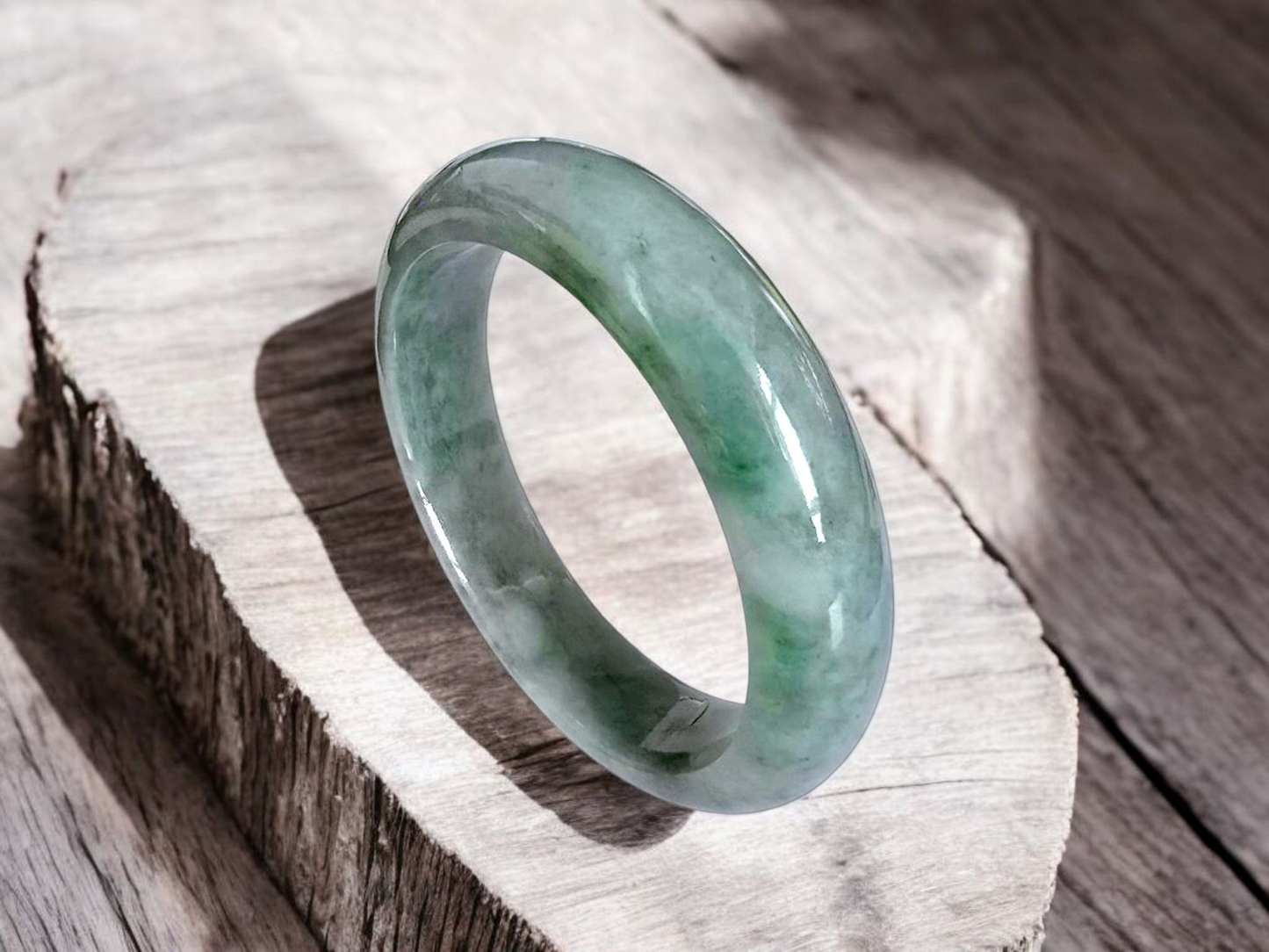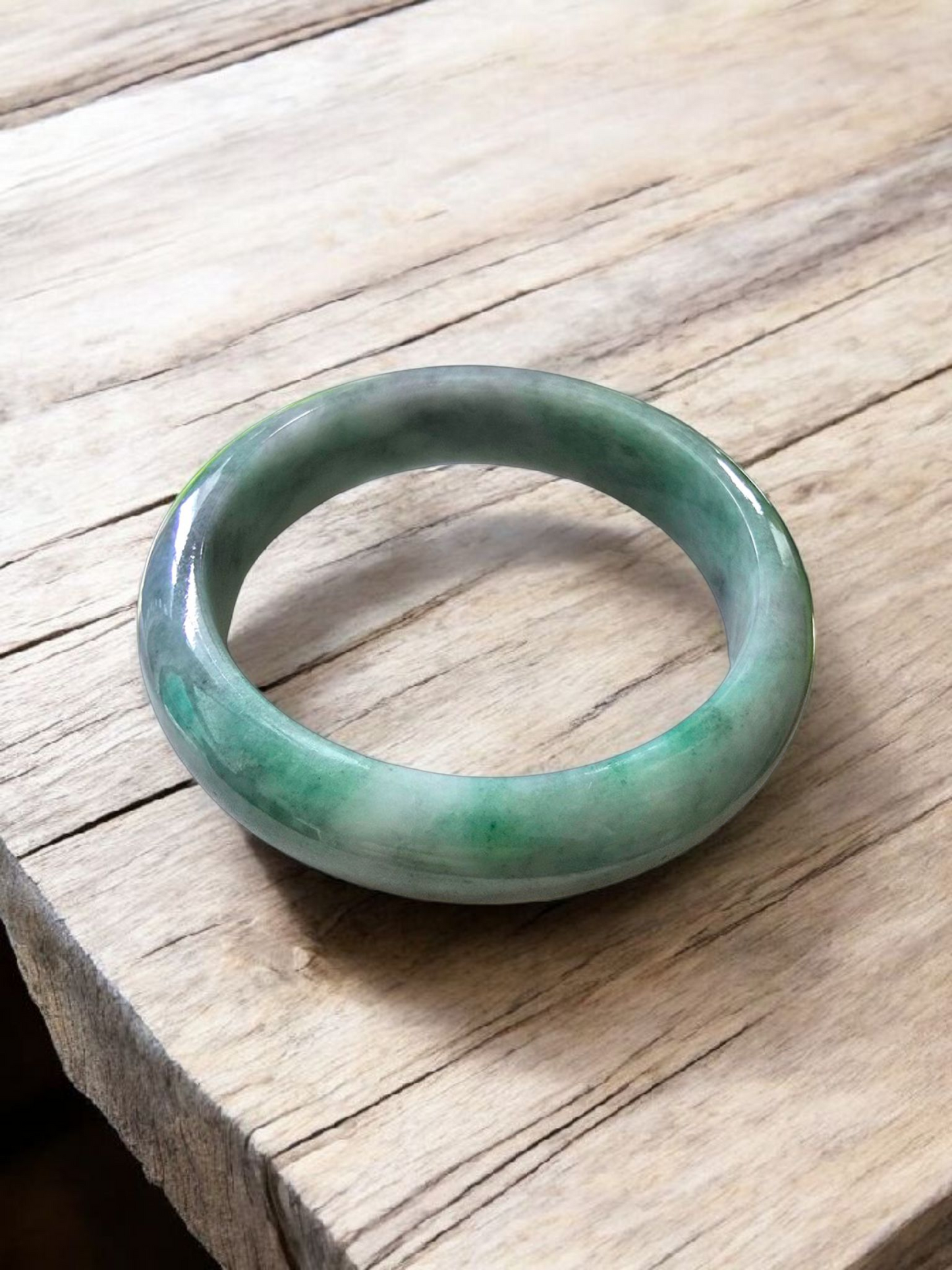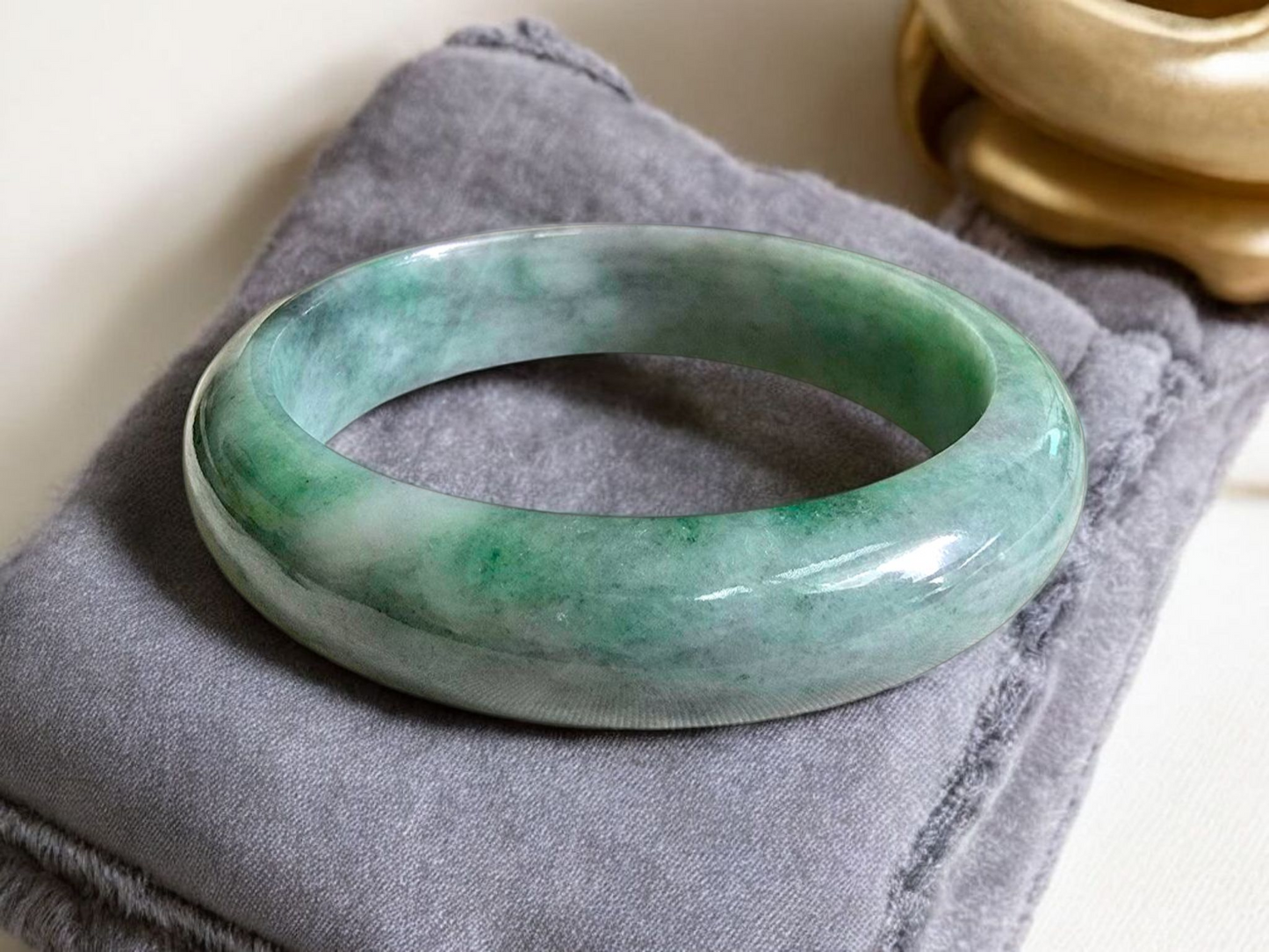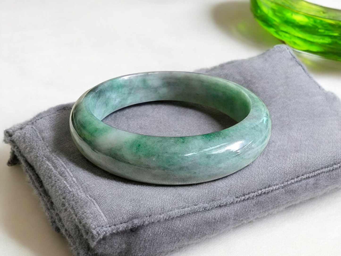 Using the best Handpicked untreated natural A-Jadeite from Burma, we created an authoritative and classy statement bangle bracelet. This unique block of Jadeite has a Green base hue, with marbling, patches and splashes of Deep Green, White, and Black. Interlaced with fibrous and patchy interwoven green patterns, the optical effect is stunning. The Fibrous texture and icy translucency in parts, are blended with depth of color and splashes of pattern.
