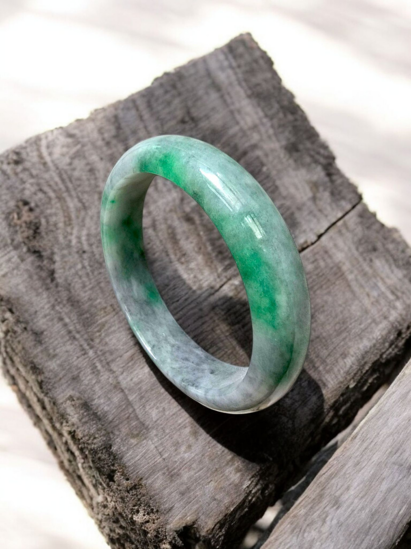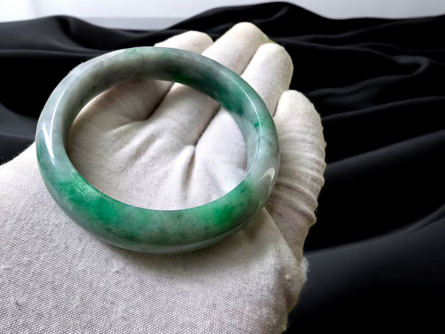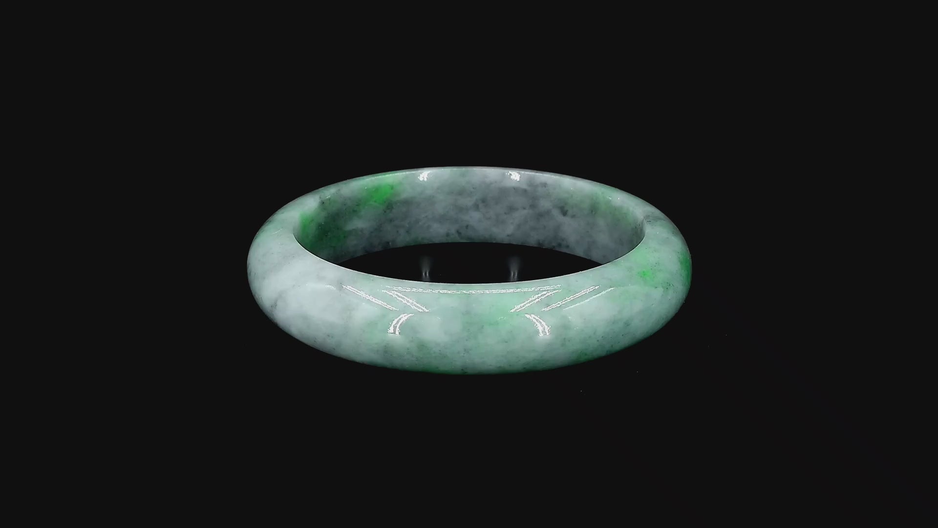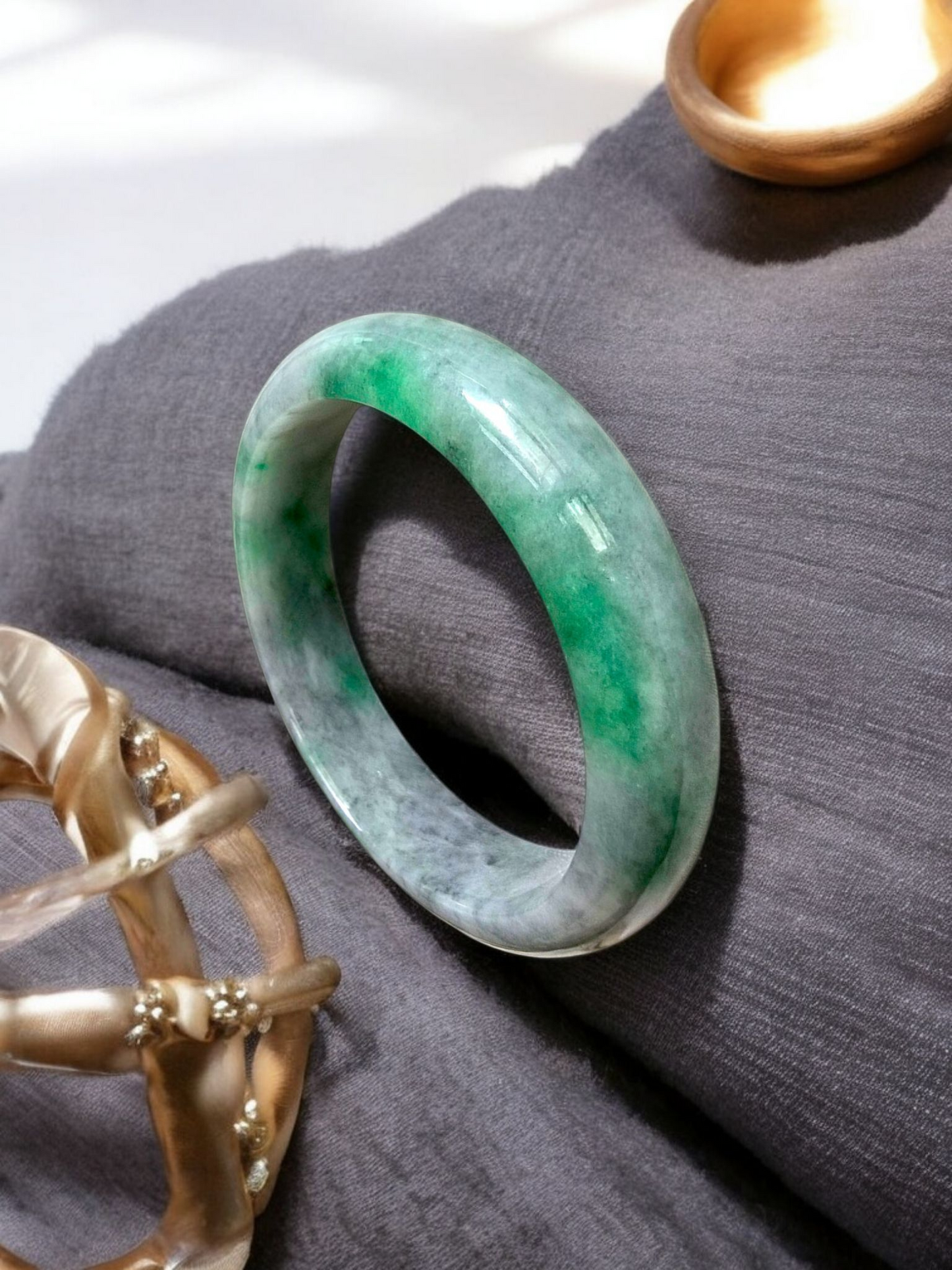Using the best Handpicked untreated natural A-Jadeite from Burma, we created an authoritative and classy statement bangle bracelet. This unique block of Jadeite has a Green and Black base hue, with marbling, patches and splashes of Imperial Intense Green, Vibrant Green, Deep Green, White, and Black. Interlaced with fibrous and patchy interwoven green patterns, the optical effect is stunning. The Fibrous texture and icy translucency in parts, are blended with depth of color and splashes of pattern.