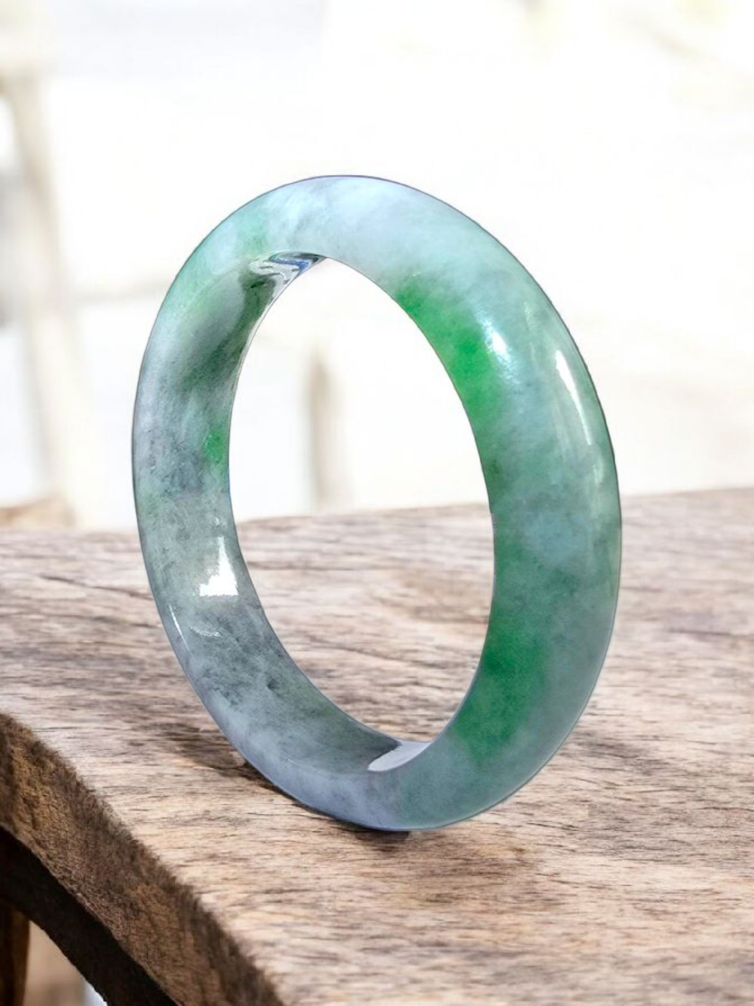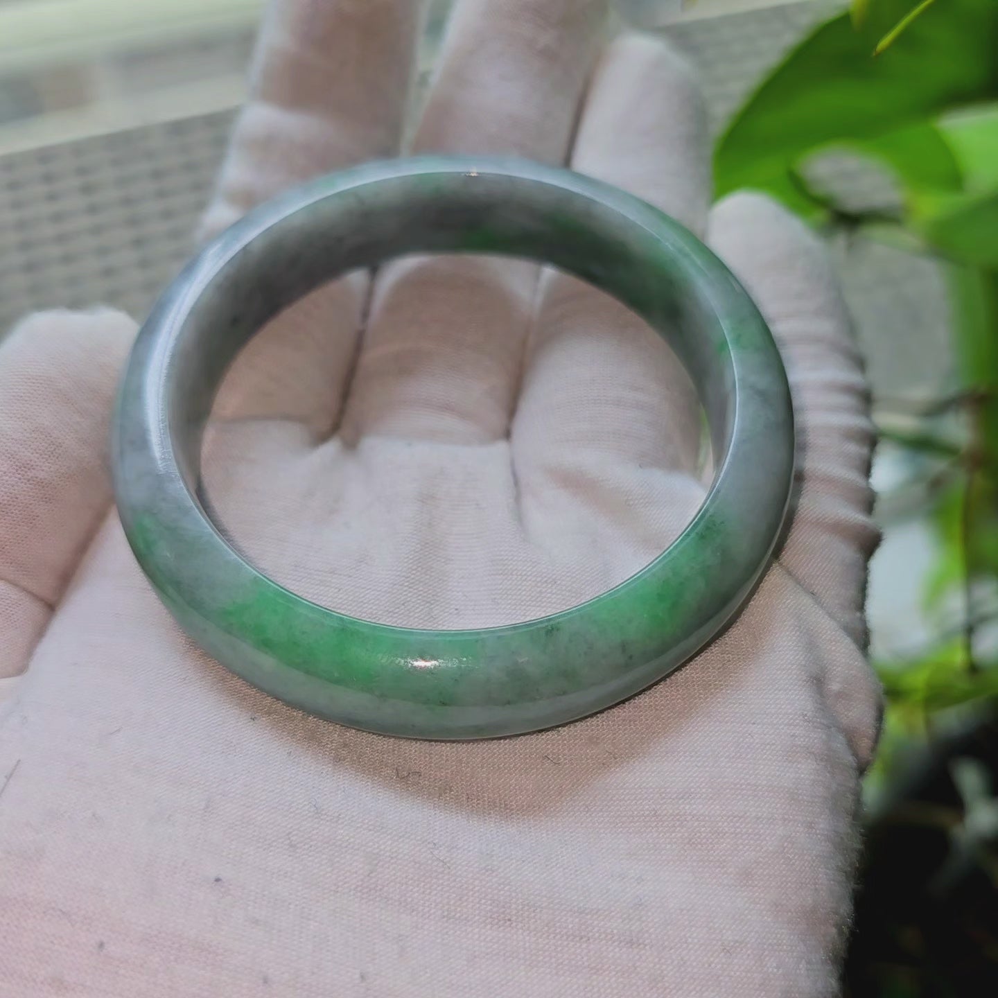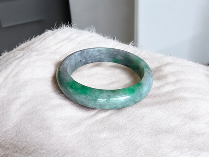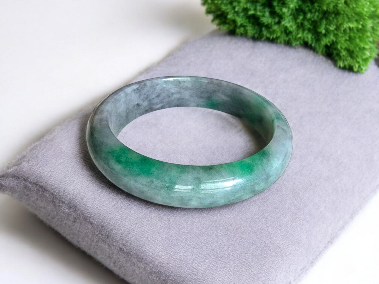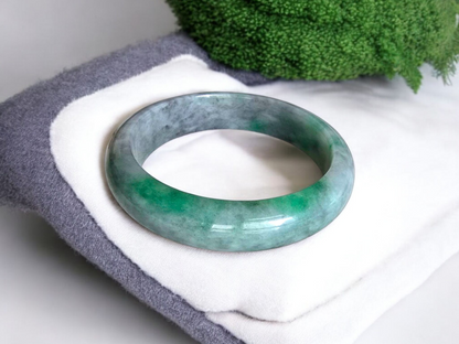 Using the best Handpicked untreated natural A-Jadeite from Burma, we created an authoritative and classy statement bangle bracelet. This unique block of Jadeite has a Green and Black base hue, with marbling, patches and splashes of Imperial Intense Green, Vibrant Green, Deep Green, White, and Black. Interlaced with fibrous and patchy interwoven green patterns, the optical effect is stunning. The Fibrous texture and icy translucency in parts, are blended with depth of color and splashes of pattern.