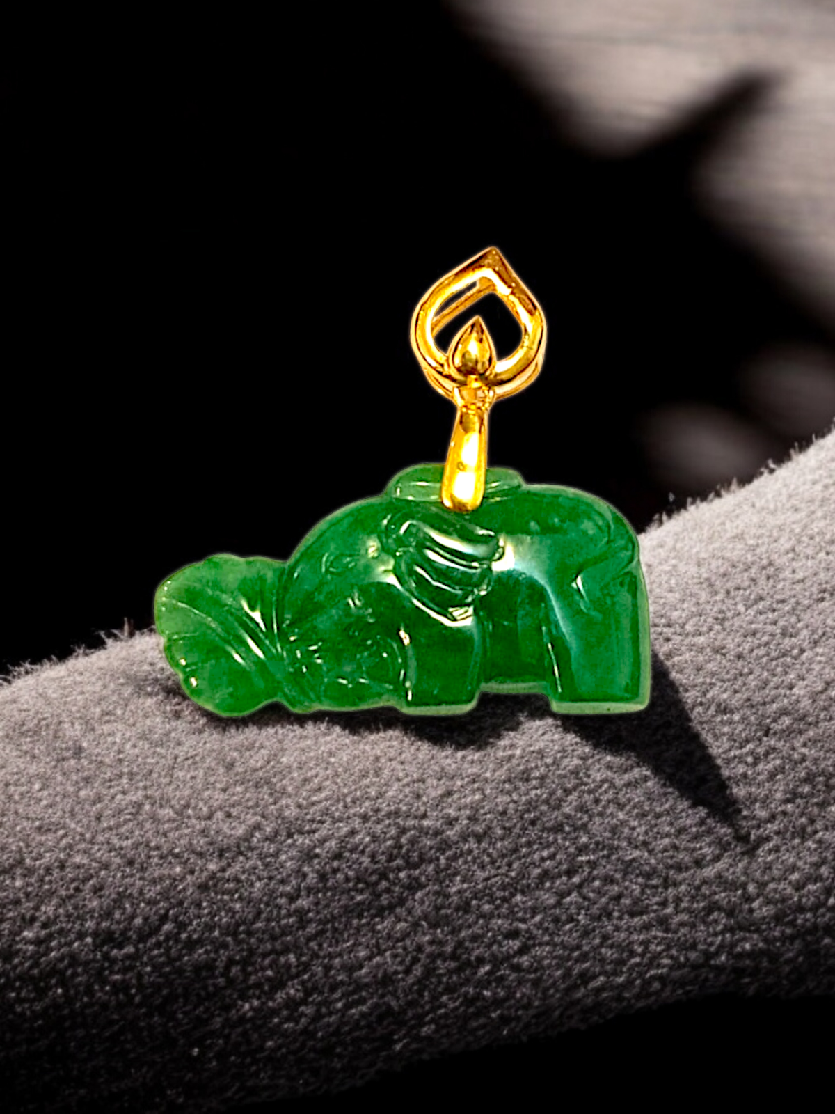This pendant is made from handpicking the rarest Burmese A-Jadeite, with the optimal translucency, fiery imperial hues, tones and saturation of green. We use the natural and most desirable vivid vibrant Imperial green within to create a stunning carved pendant. We create a crown-esque clasp with 18K Yellow Gold.