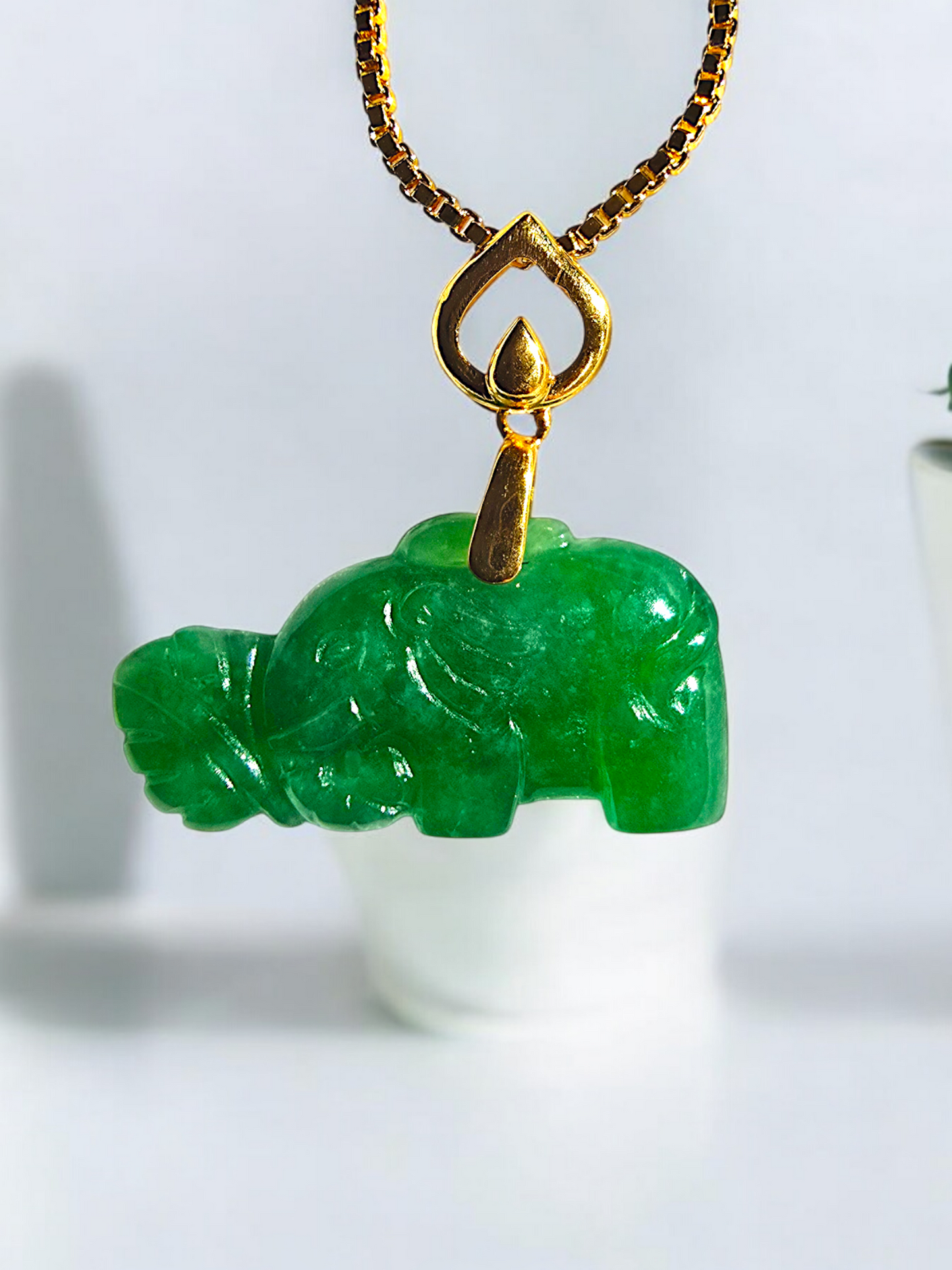 A piece-unique, one-of-a-kind creation. This pendant is hand carved by our expert artisans where an elephant is eating a plant; the pinnacle of design and craftsmanship.