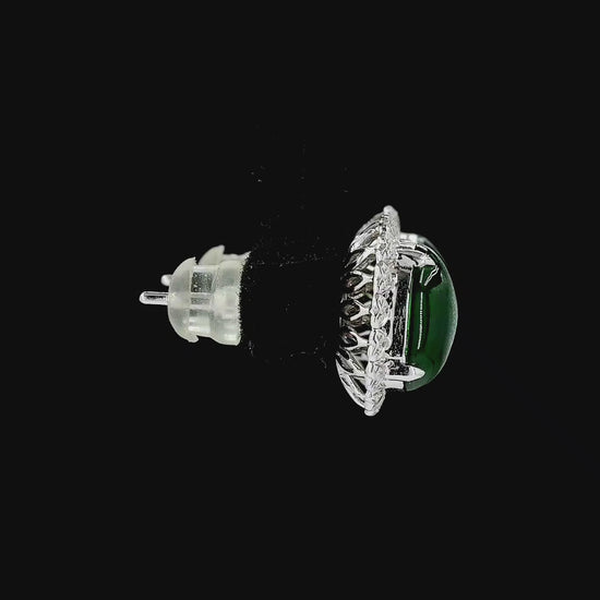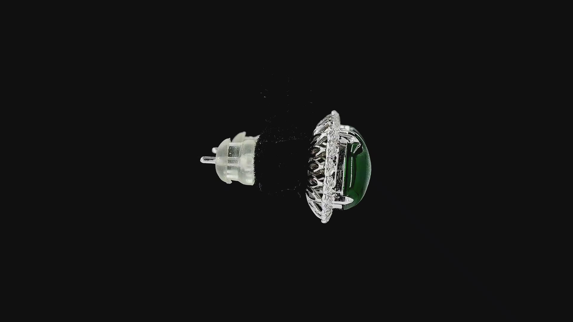 Our Eternal Sunshine Imperial Green Burmese A-Jade Stud Earrings with Diamond Halo and 18K White Gold are made from handpicking the best Imperial Green Burmese A-Jadeite Cabochons, with top of the line translucency, hues and optics. With solid Imperial Green Color, we created stud earrings with highly engineered settings and prong to bring out the optimum vivid green optics. We create stud earrings with calibrated cabochons, a white diamond halo, paired with 18K Solid White Gold.