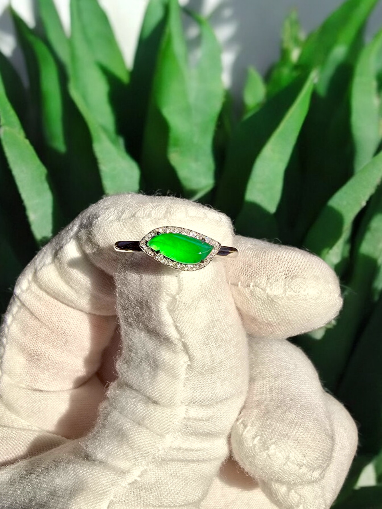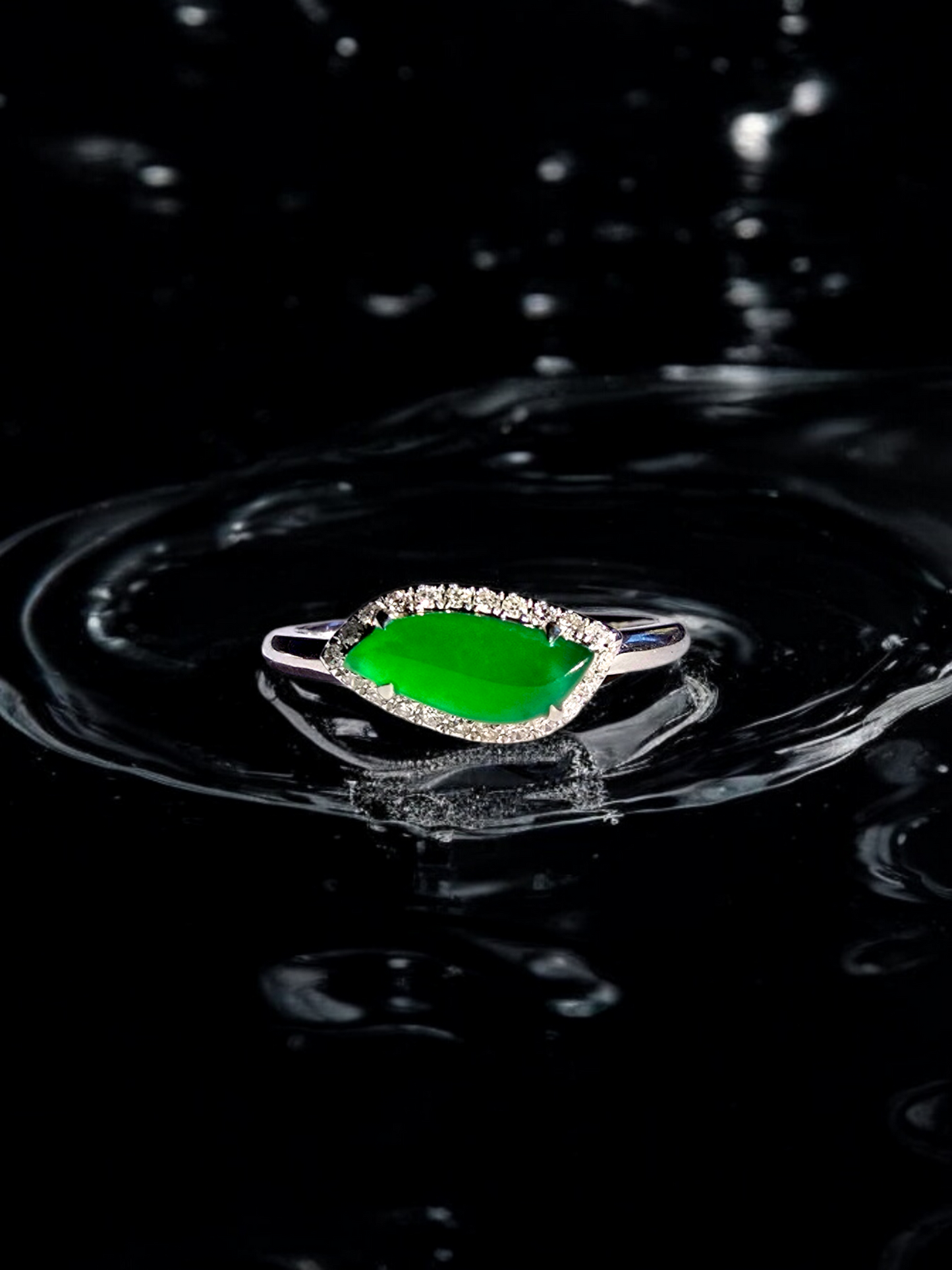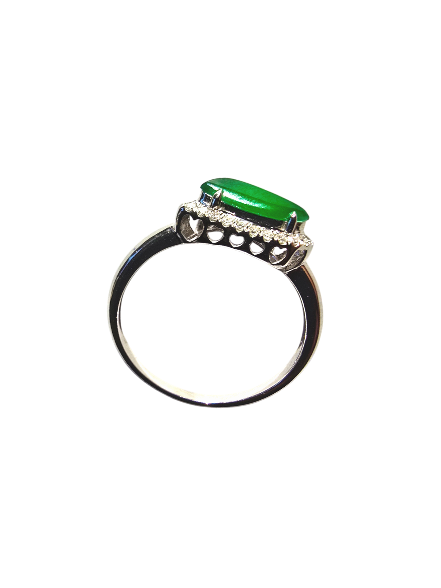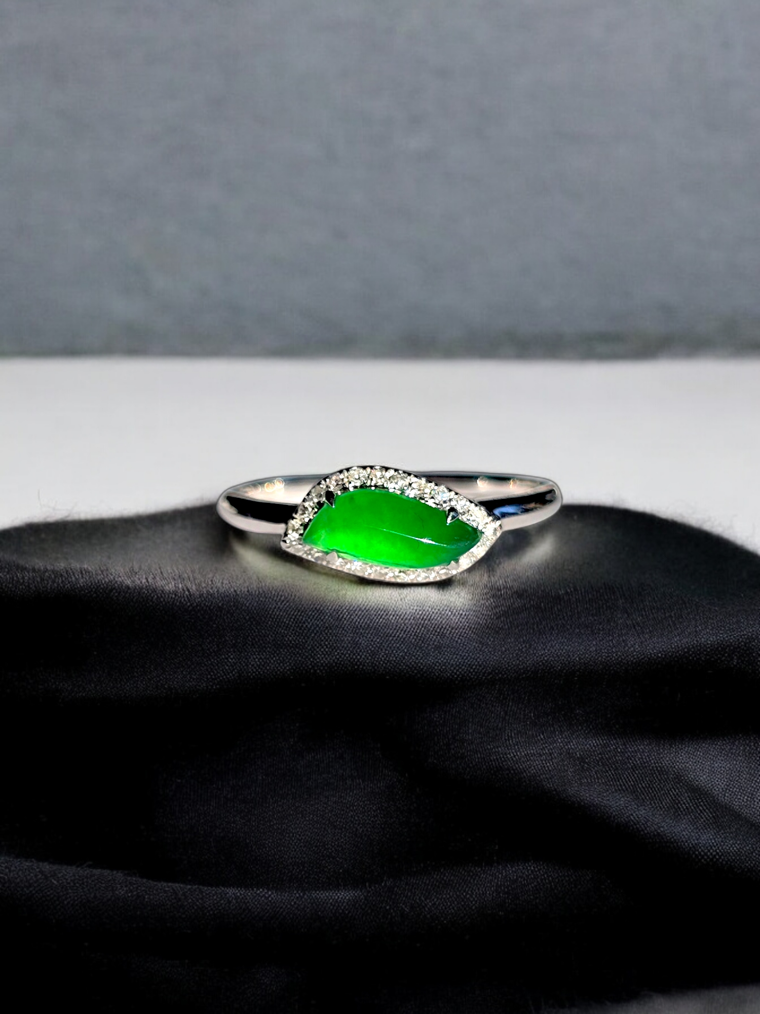 Flow Leaf Burmese A Jade Ring, with White Diamonds, and 18K White Gold - HKJSL Certified