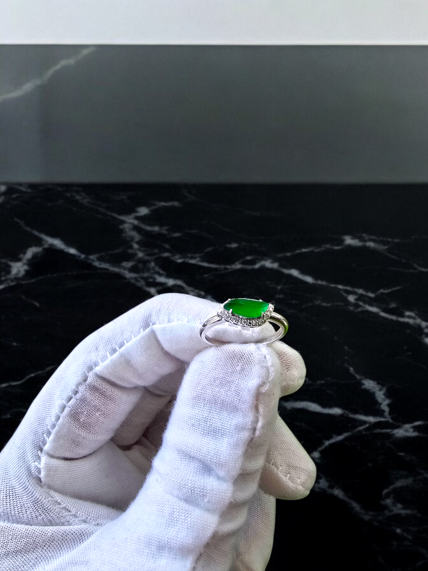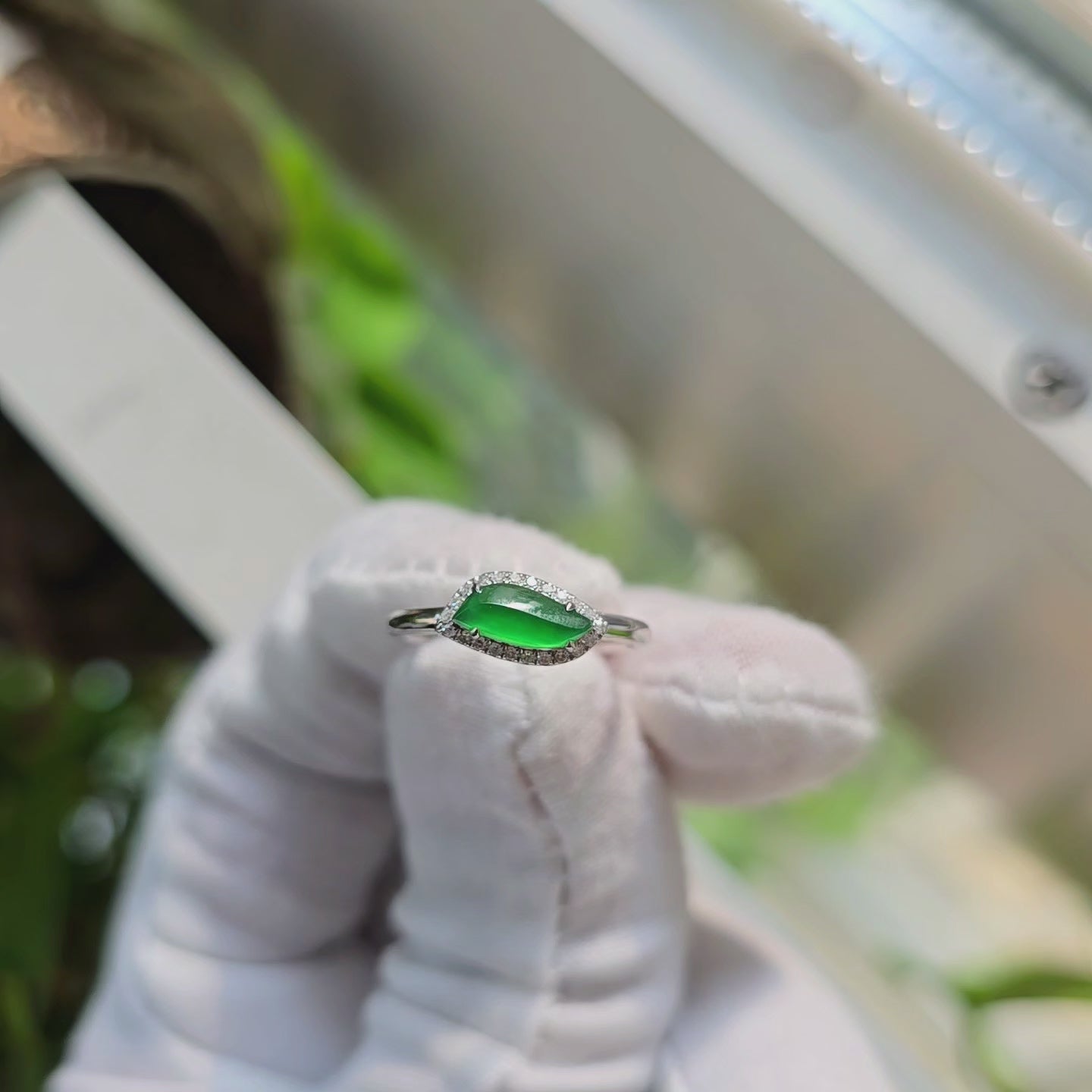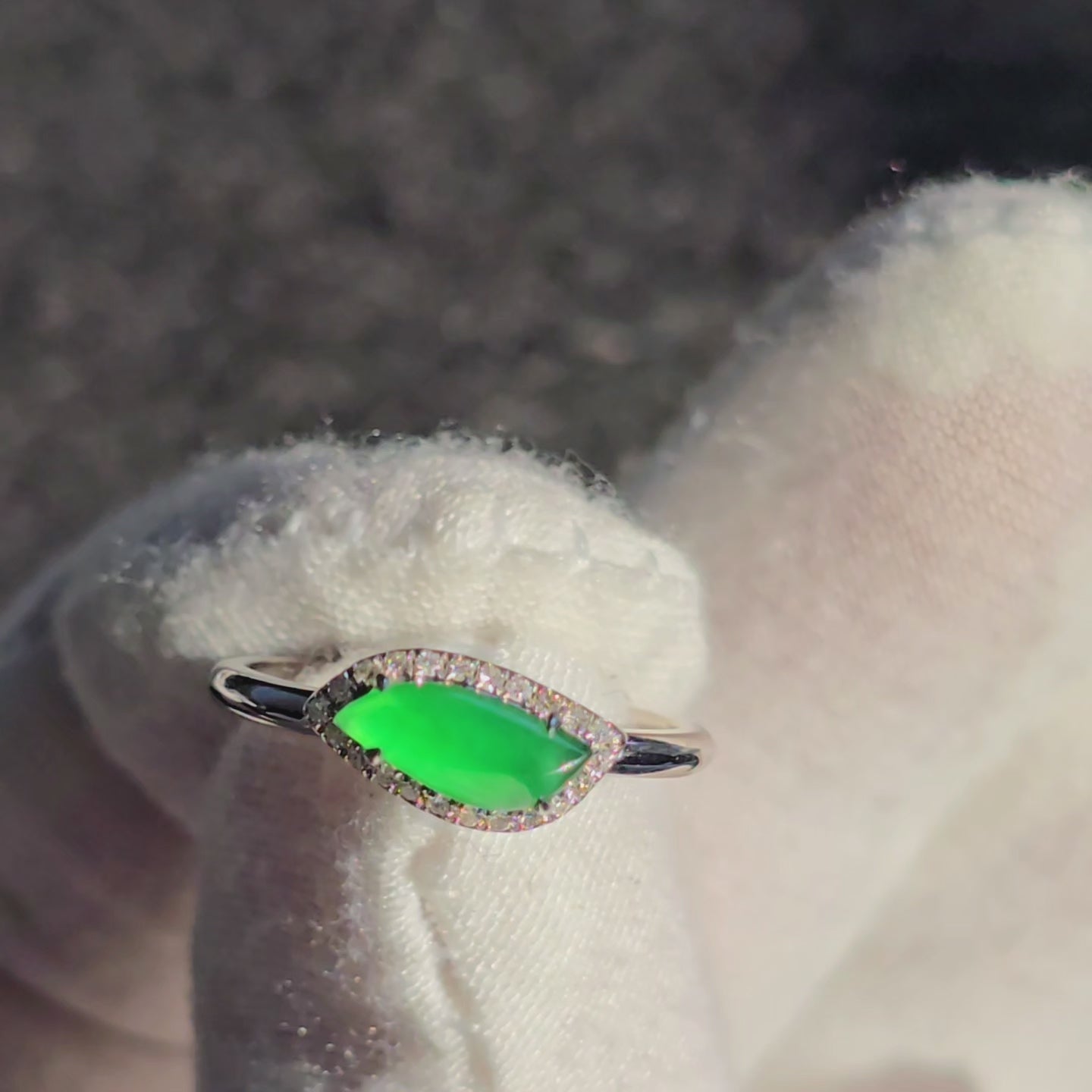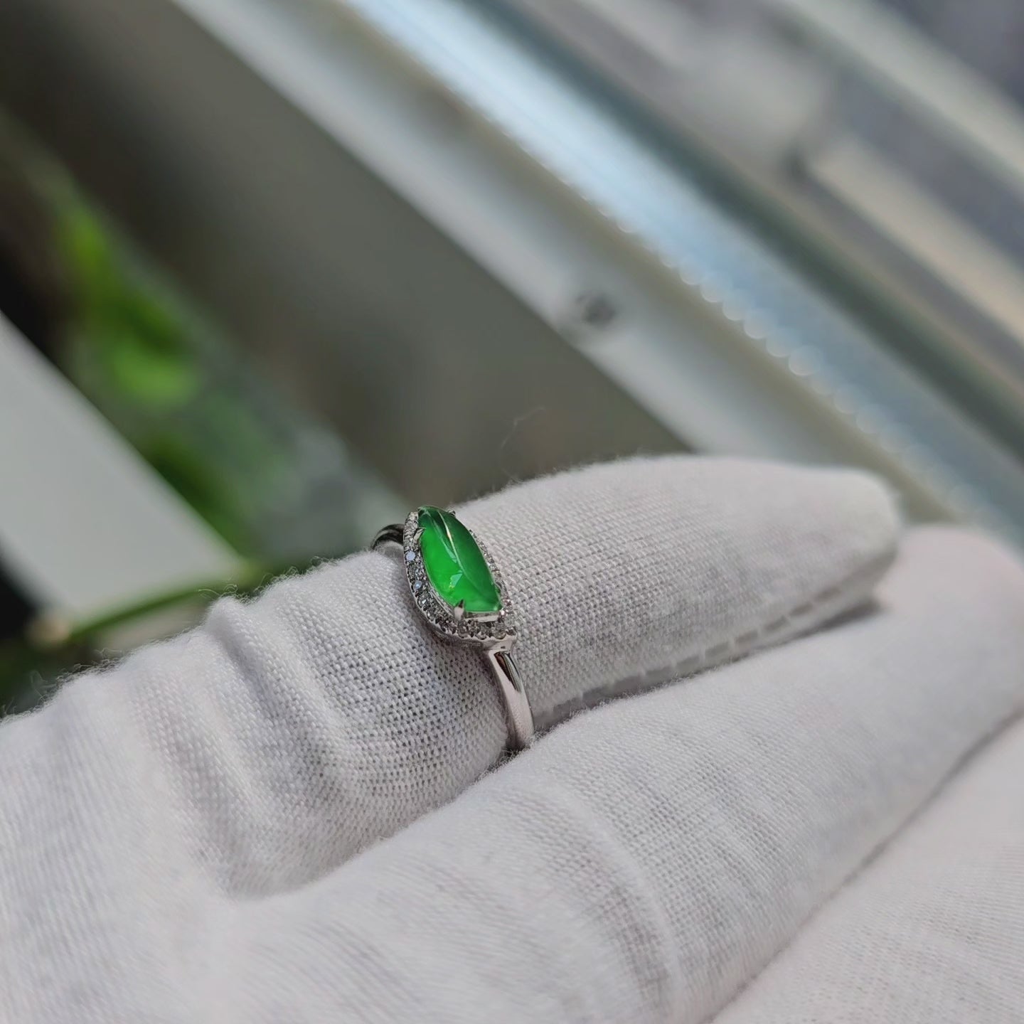 Flow Leaf Burmese A Jade Ring, with White Diamonds, and 18K White Gold - HKJSL Certified