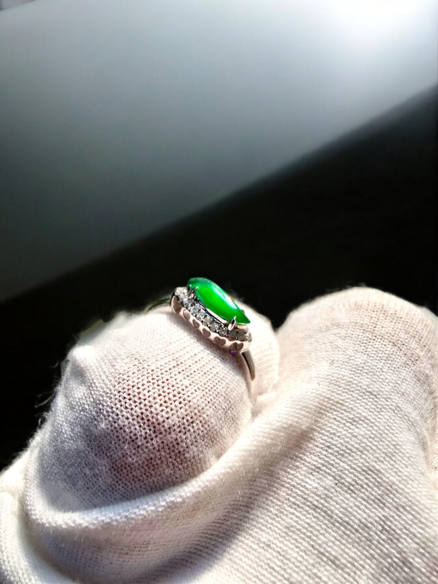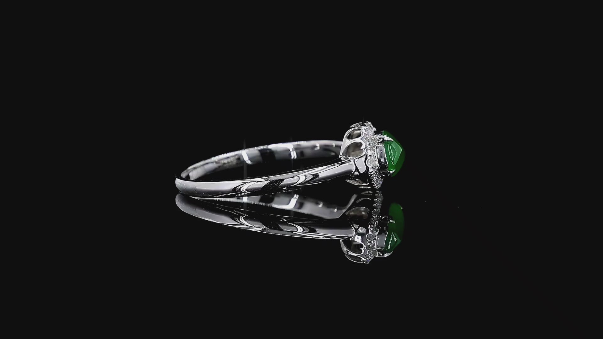 Materials: Vivid Imperial Green Burmese A-Jadeite Cabochon, Natural Round White Diamonds, 18K Solid White Gold