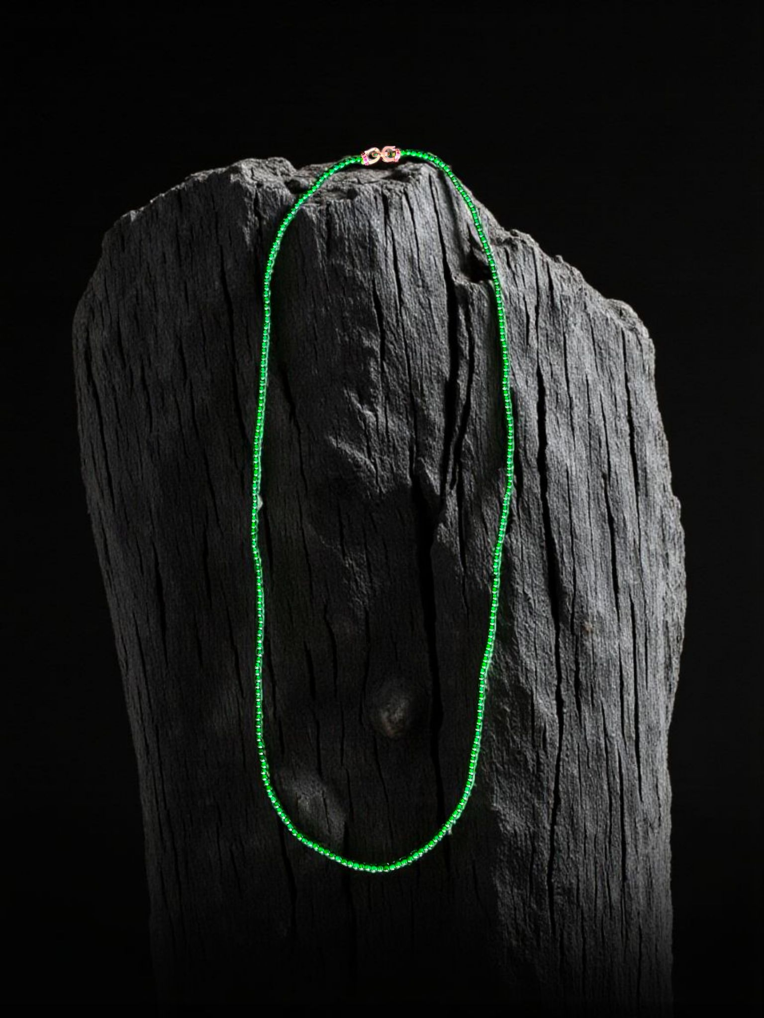 We use 2.80mm Beads to create a stunning and elongated effect. The Necklace evokes a sense of power. May be doubled for a two strand look (for smaller necklines, and a tighter fit). May also be triple folded to make for a stunning Bracelet look.