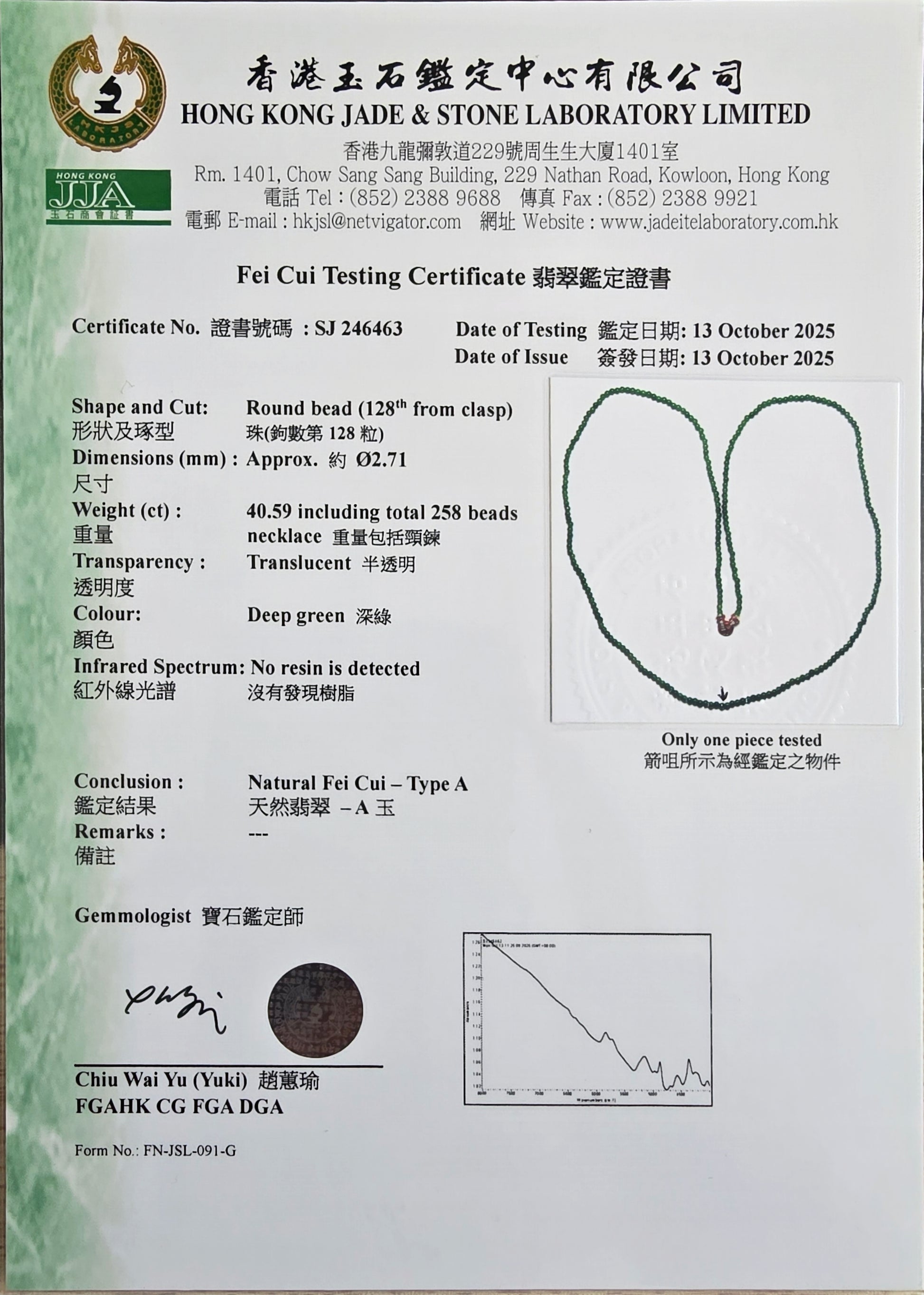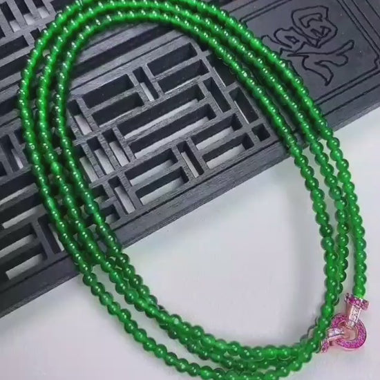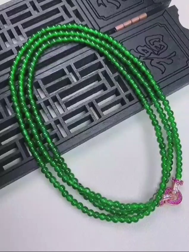 This unique beads Necklace is 100% cut, calibrated, strung, and Made in Hong Kong. Some of the rarest naturally occurring Intense Vivid-Imperial hues of A-Jadeite, calibrated Green Icy Water Shades creates a visually stunning Necklace. With vibrant optics and perfect translucency, the depth of each stone shines. With Deep Vivid Hues and 100% Eye Clean (no visible inclusions), the brilliance evokes an aura of strength and authority.