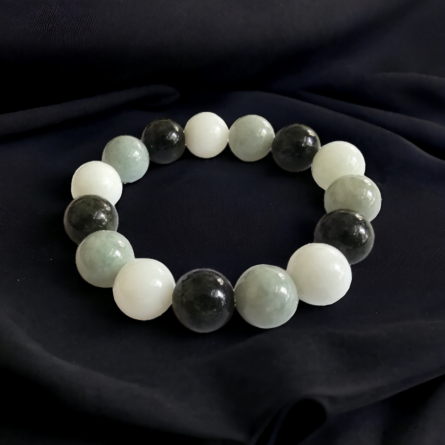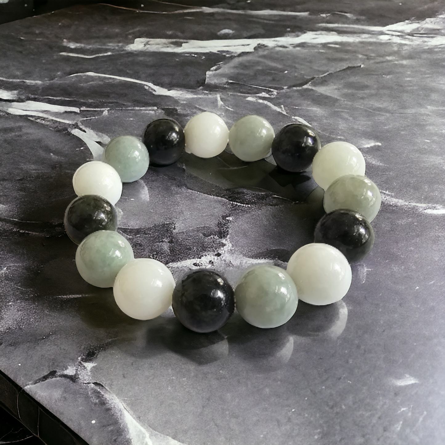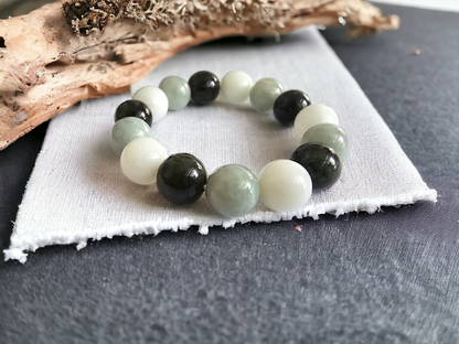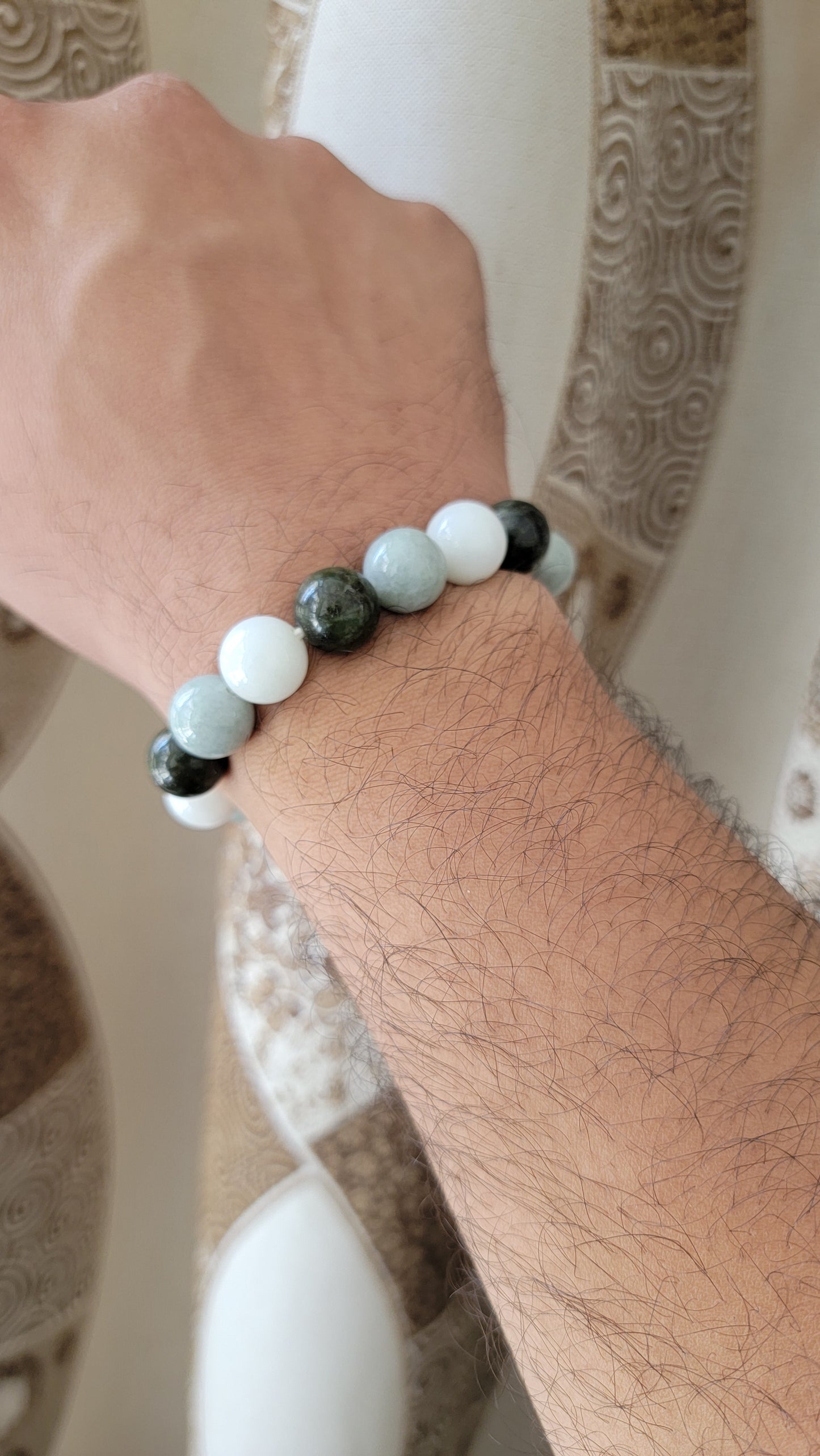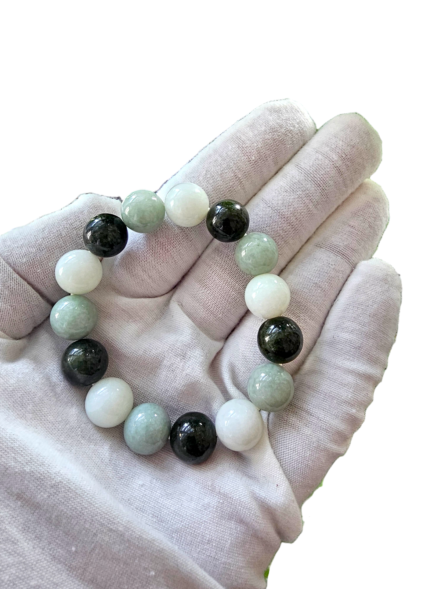 各 12 ~ 12.5 mm、完璧に調整された 15 個のジェダイト ビーズ。同じジェダイト原石から 3 つの独特なグリーンの色調を使用して、自然に発生する色調を対比させています。ジェダイトの中でも最も珍しい自然に発生する色調の 1 つであるこのビルマ産 A ジェダイト ビーズ ブレスレットは、豪華な外観に最適です。完全に未処理で 100% 天然のこのブレスレットは、フォーマルな場にもカジュアルな場にもぴったりです。ビーズ ブレスレットはどれも、ジェダイトの原石の自然な変化に基づいたユニークなものであり、それぞれが真にユニークで独自のストーリーを持っています。
