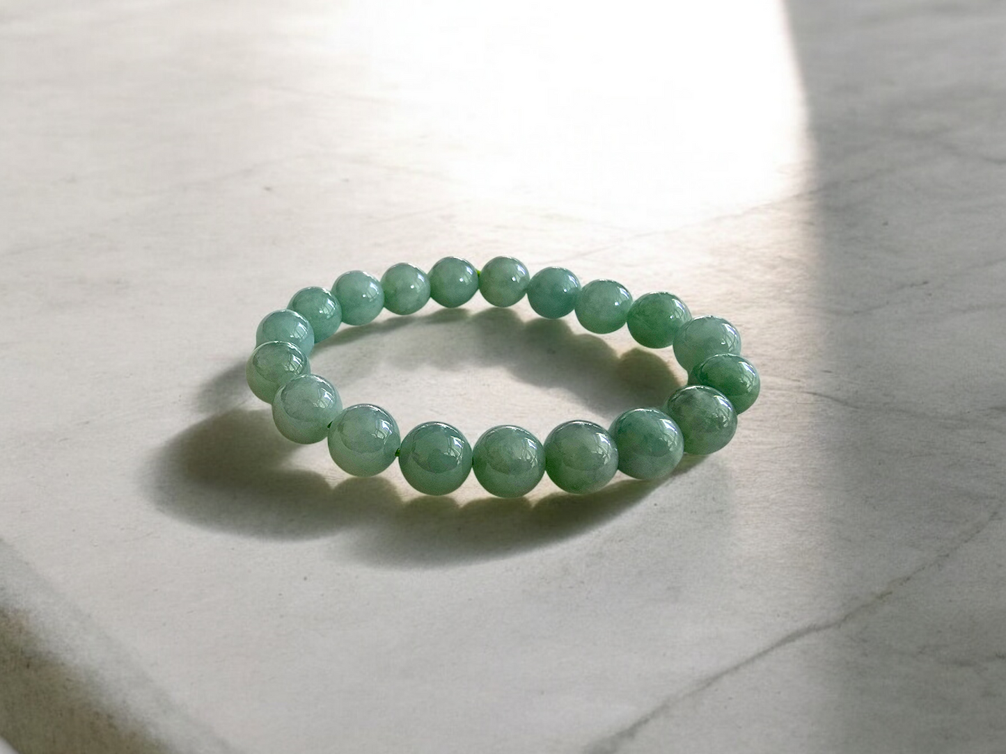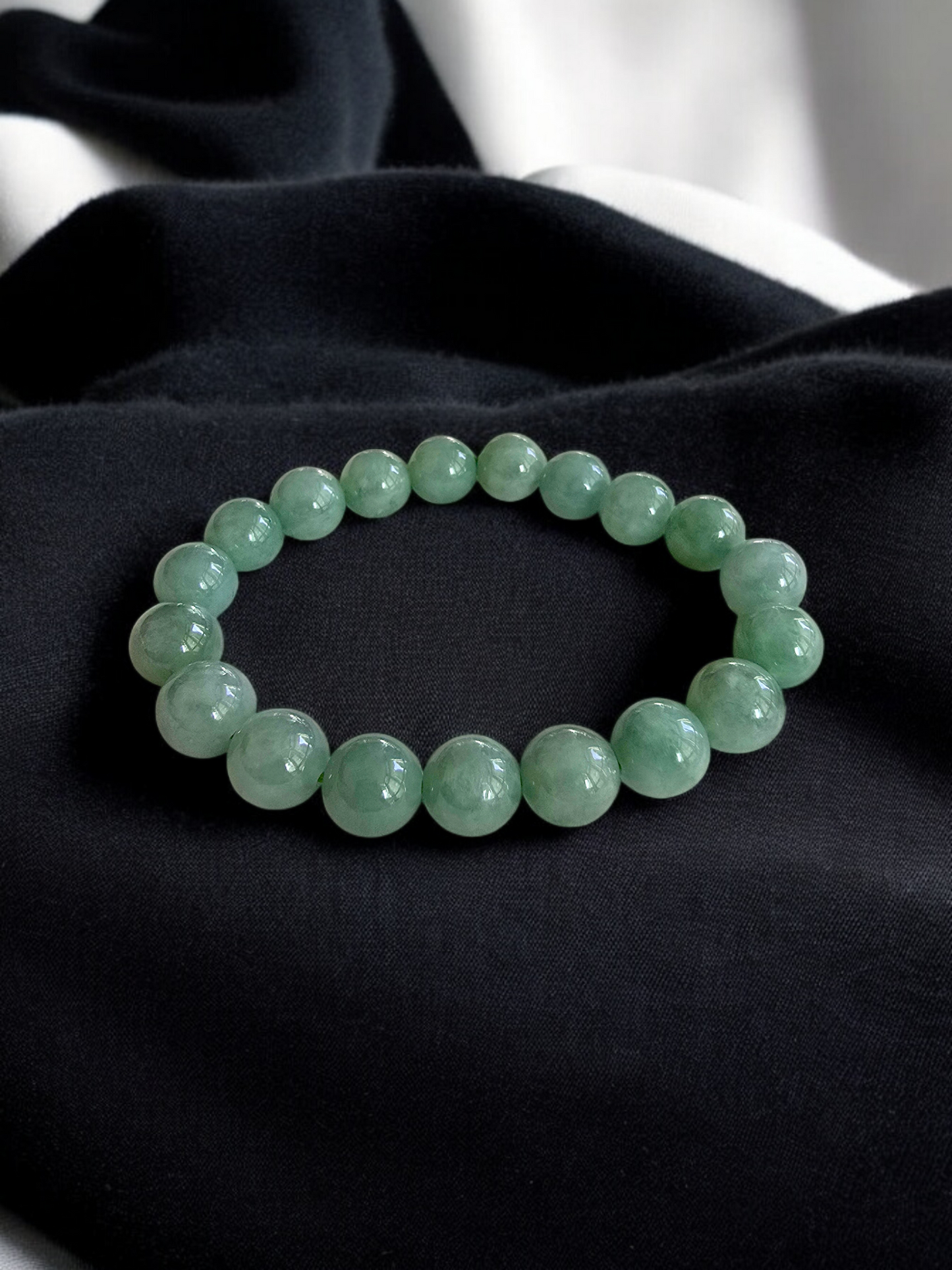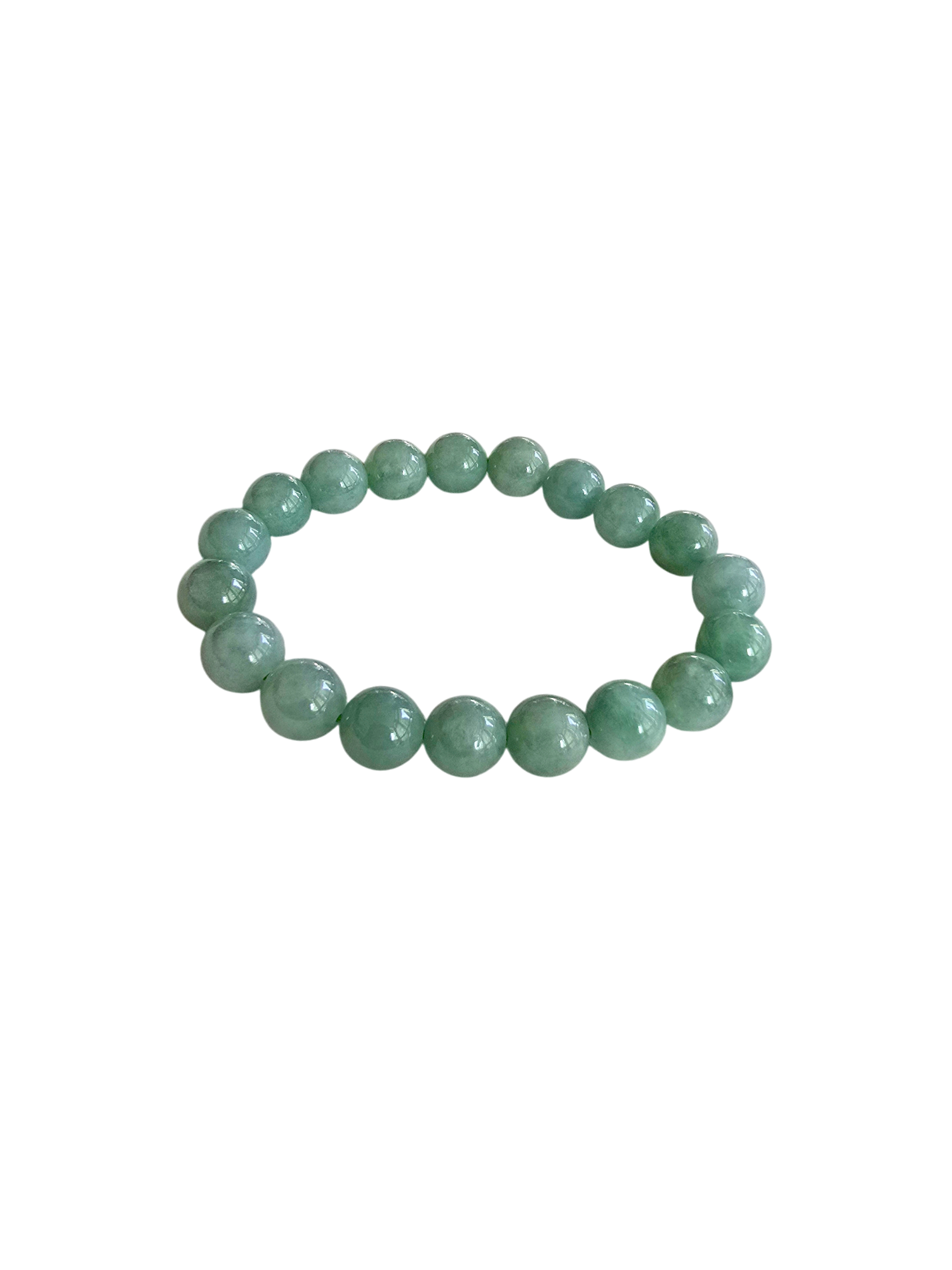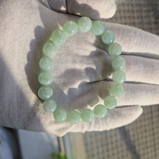 10.5 mm each, 19 perfectly calibrated Green Burmese A-Jadeite Beads. This unique beads bracelet is 100% cut, calibrated, strung, and MADE IN JAPAN. Some of the rarest naturally occurring hues of A-Jadeite, the calibrated Green beads create a visually stunning Bracelet. The Earthy green is interlaced with streaks of imperial green and patches of white jade. With vibrant optics and translucency, the depth of each stone shines.