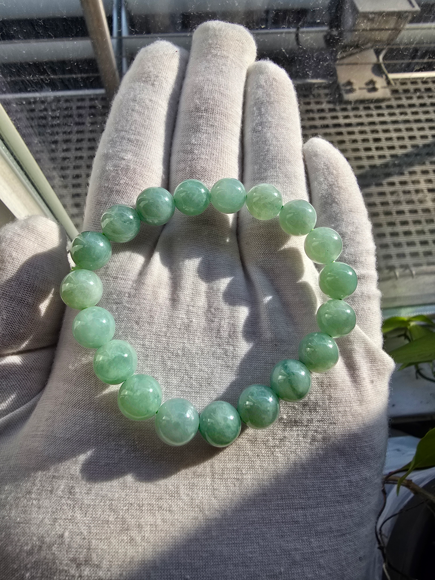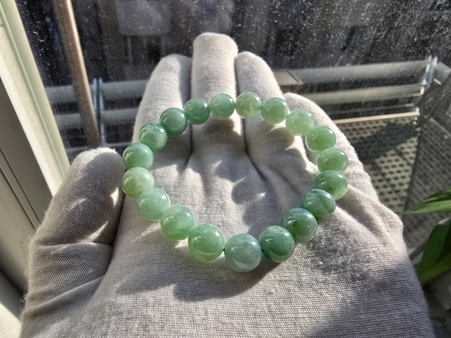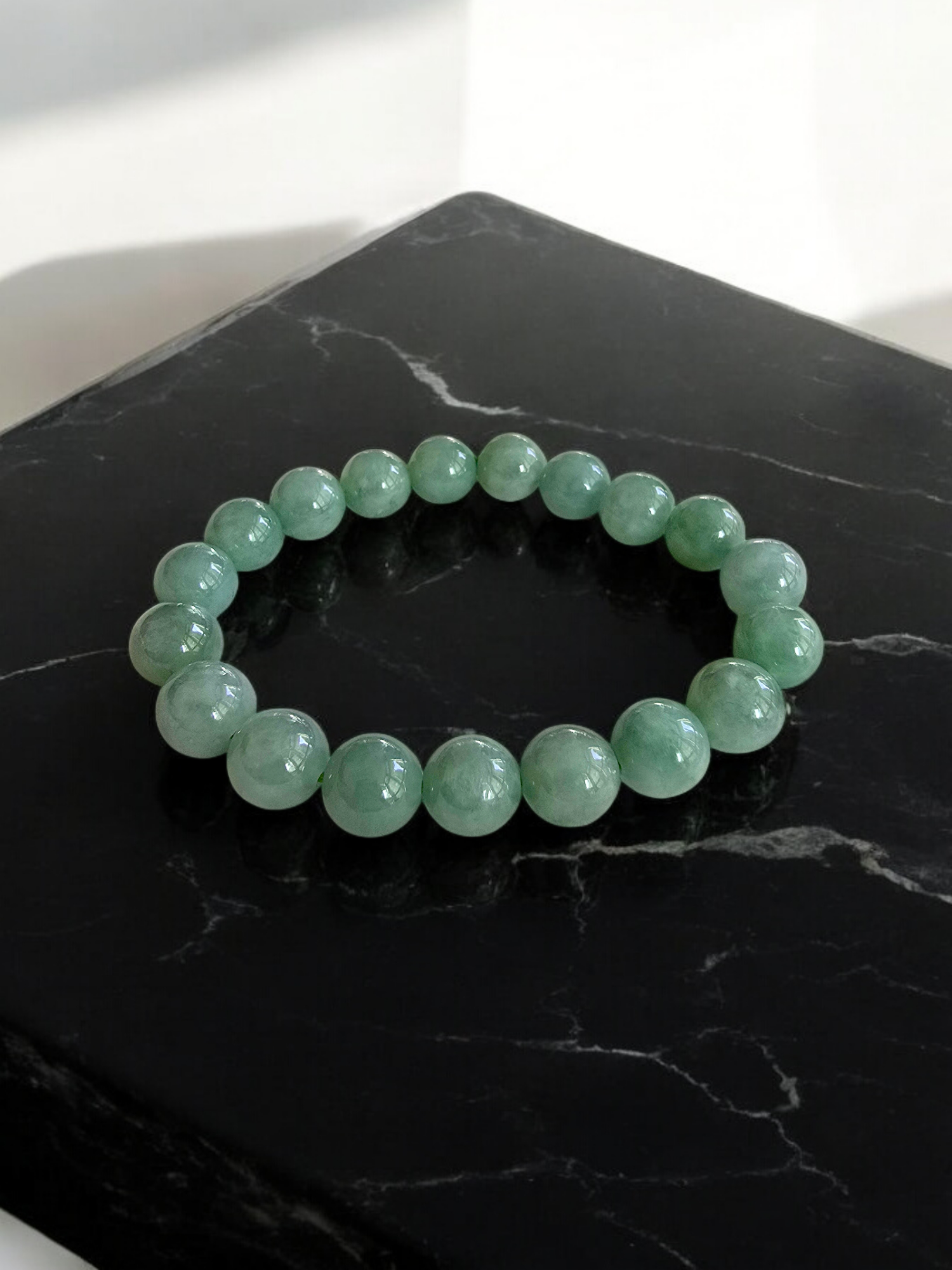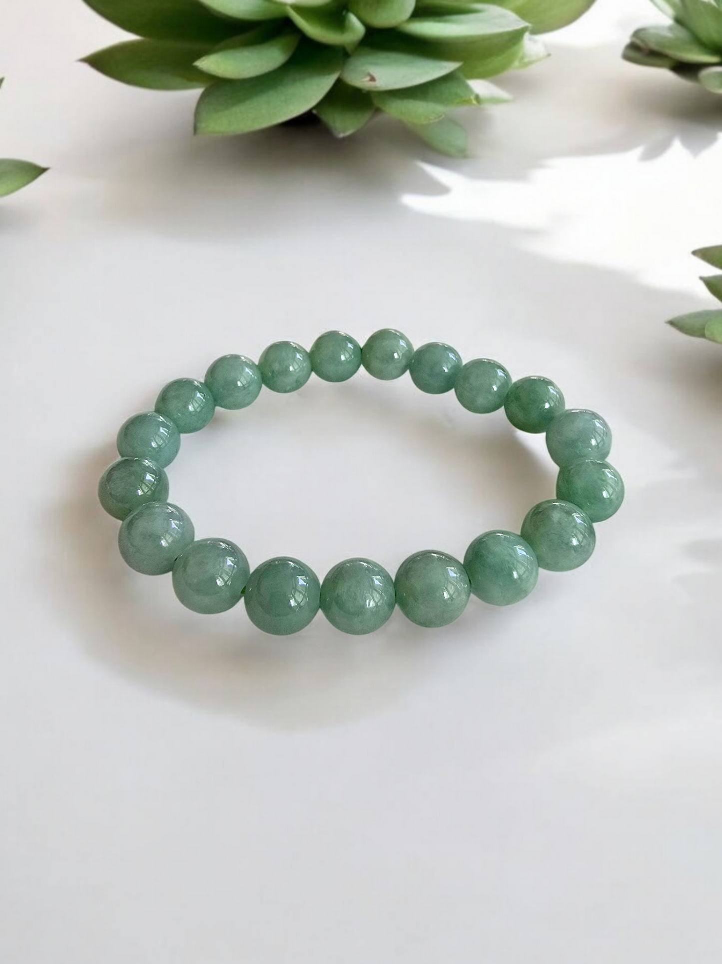 10.5 mm each, 19 perfectly calibrated Green Burmese A-Jadeite Beads. This unique beads bracelet is 100% cut, calibrated, strung, and MADE IN JAPAN. Some of the rarest naturally occurring hues of A-Jadeite, the calibrated Green beads create a visually stunning Bracelet. The Earthy green is interlaced with streaks of imperial green and patches of white jade. With vibrant optics and translucency, the depth of each stone shines.