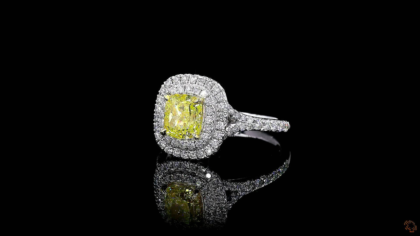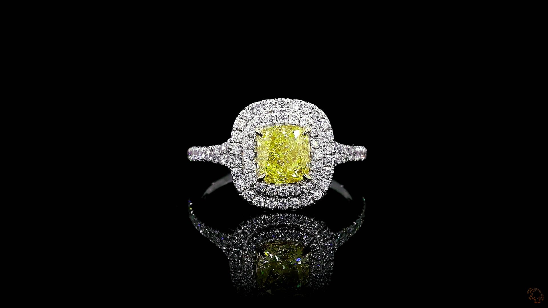 We present to you a top hue Fancy Yellow Cushion Cut Diamond, certified by the GIA Laboratory. The 1.54cts of natural perfection represents Japanese divinity, or 'Kami'. The center stage jewel is surrounded by Round Brilliant White diamonds, with VVS purity. The halo's optical interplay with the center stones brings out the best scintillation and color. We used a white double halo for this ring to contrast the saturation of the yellow center-stone. All of our signature creations are made in Hong Kong with our signature Finishings.