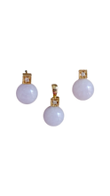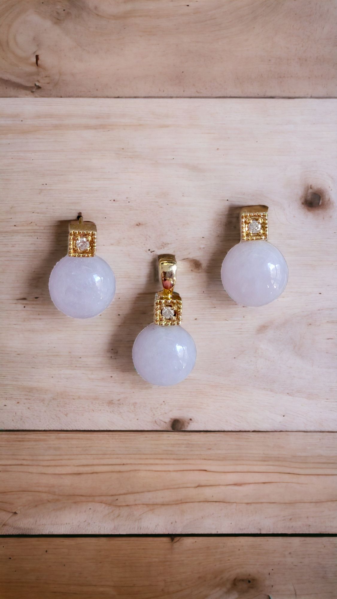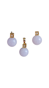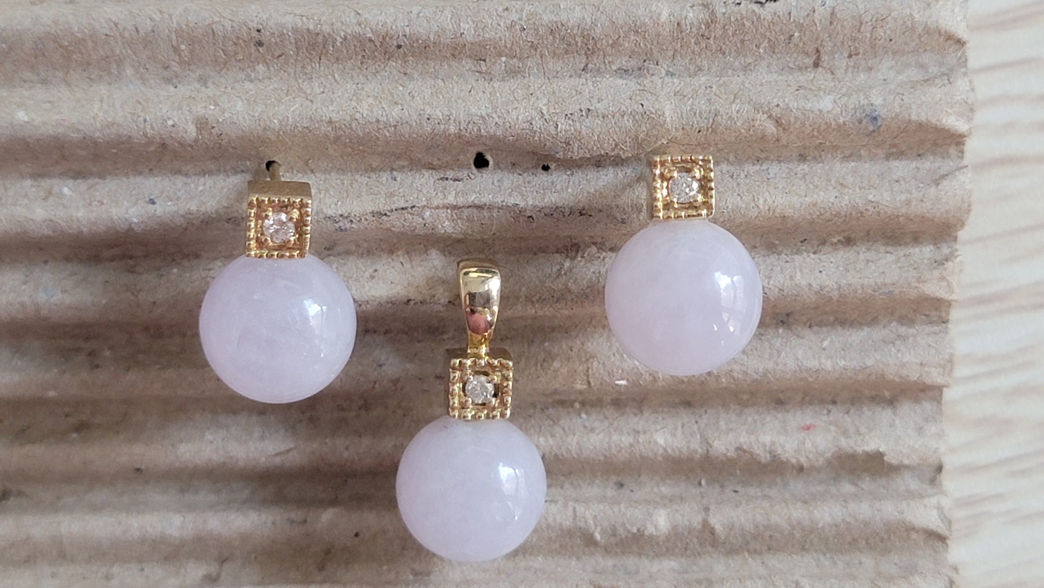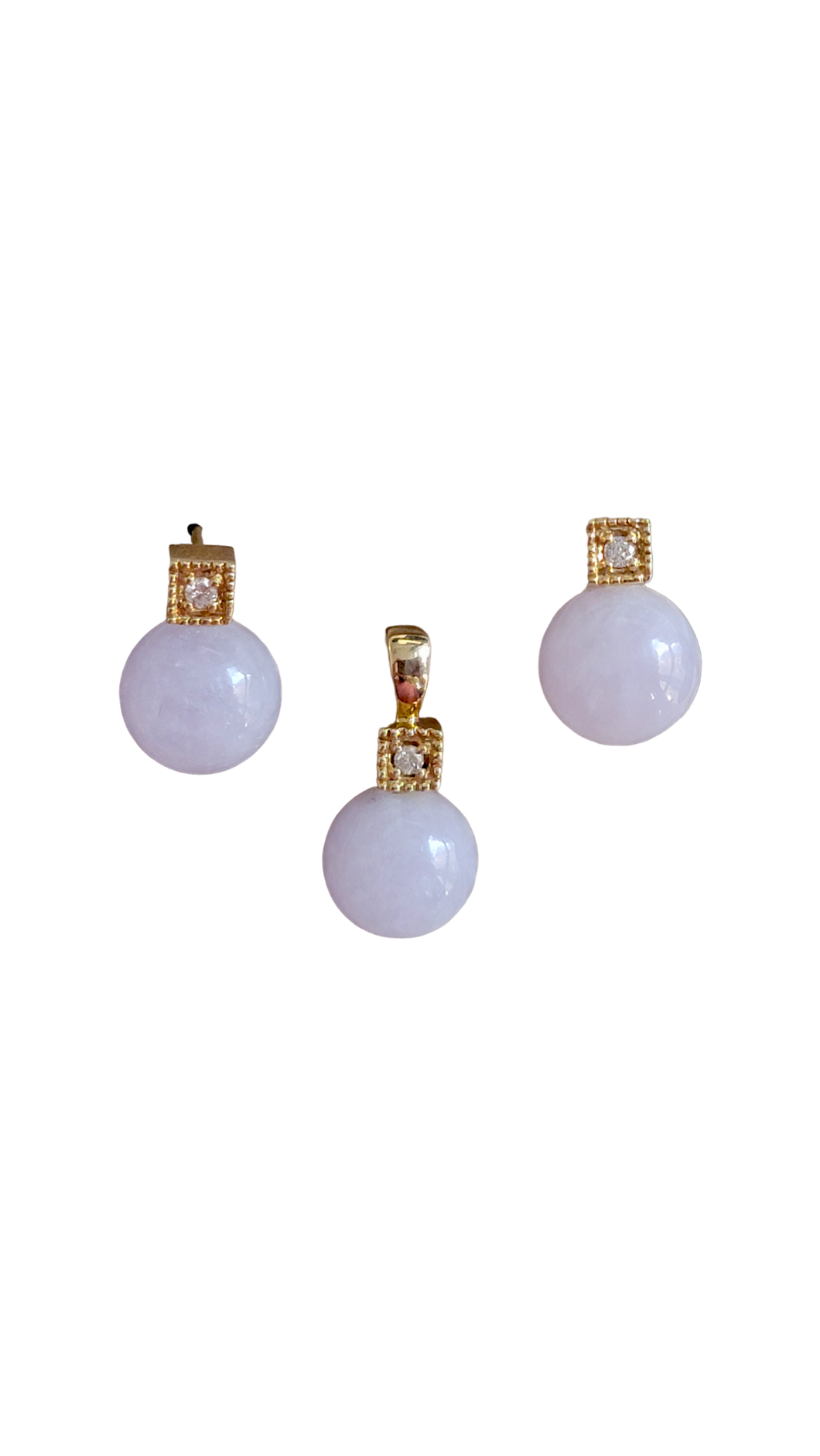 京都産ビルマ産ラベンダー翡翠の球根イヤリングとペンダントセット、14Kイエローゴールドとホワイトラウンドダイヤモンド付き