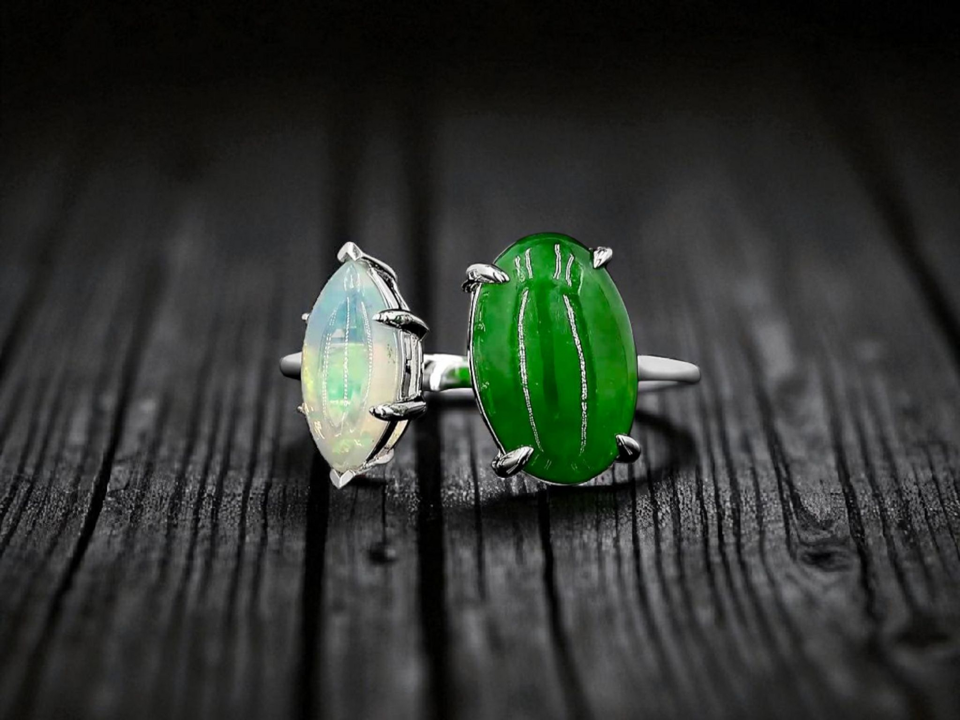 Materials: Burmese A-Jadeite (3.00 cts.,12 x 8 mm), Australian Opal (0.83cts., 10 x 5 mm), 14K Solid White Gold (3.09g)