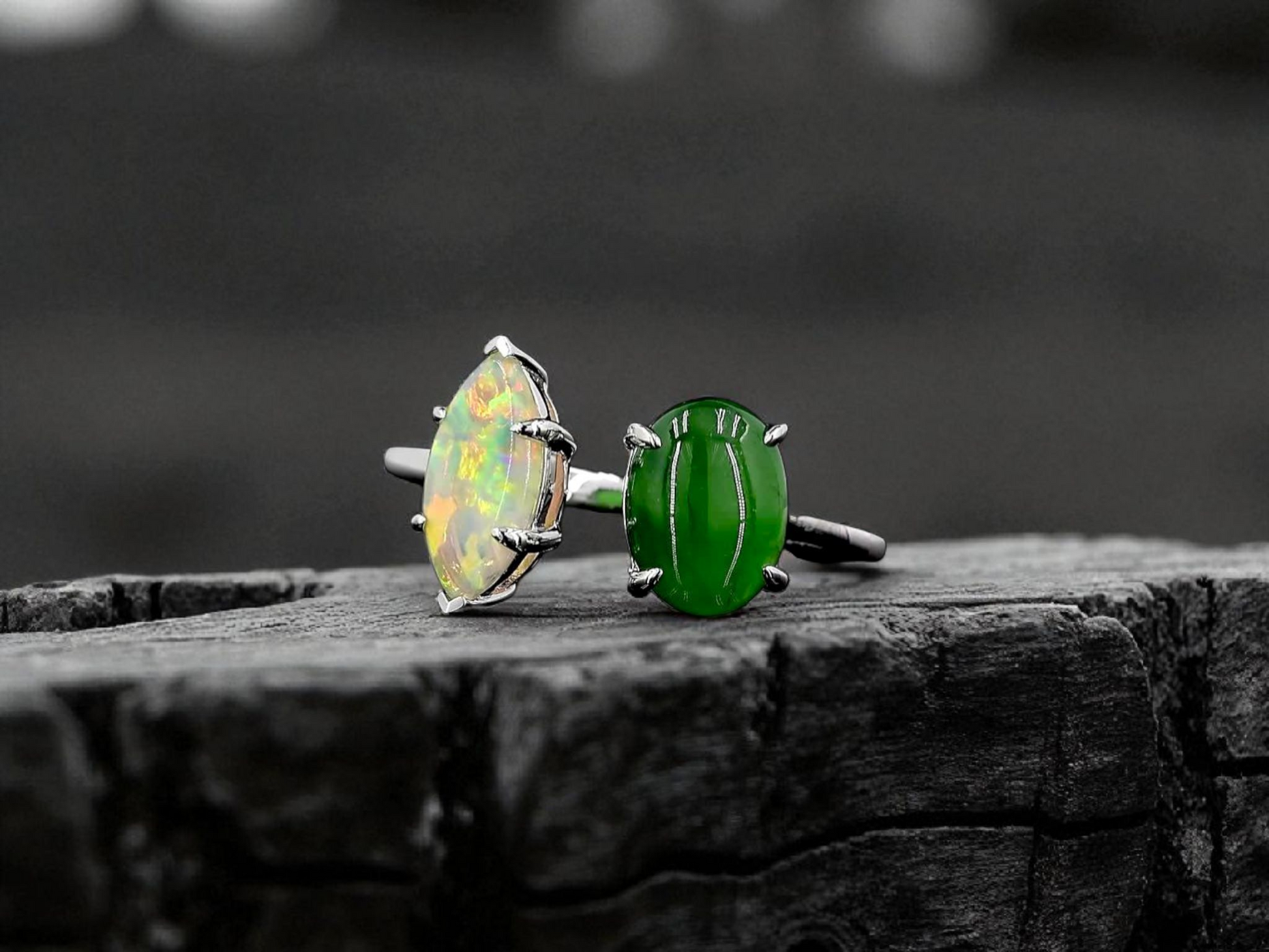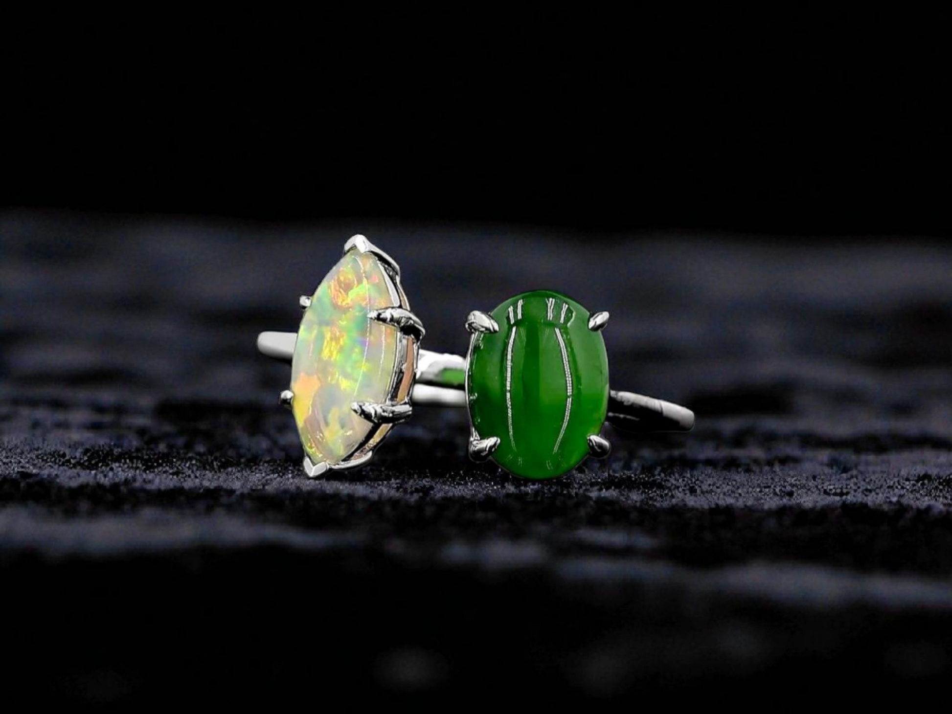 Materials: Burmese A-Jadeite (1.53 cts.,8.88 x 6.88 mm), Australian Opal (0.59 cts.,10 x 5 mm), 14K Solid White Gold (2.79g)