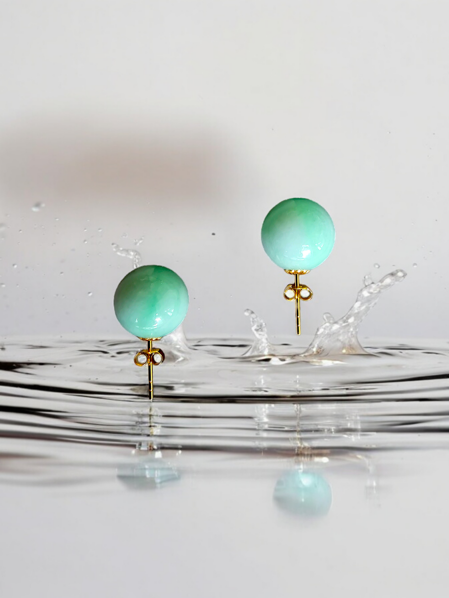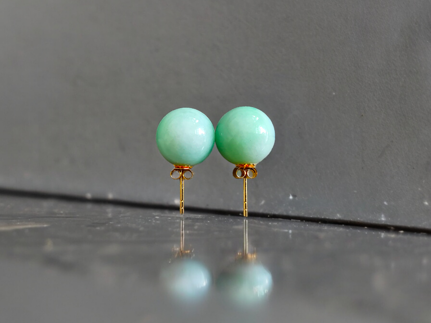 Our 12mm Beads of Eternity Burmese A-Jadeite Stud Earrings are made from handpicking the rarest Burmese A-Jadeite, with the best translucency, hues, tones and saturation of green. We use the natural and most desirable imperial green streaks within to create stunning beads, paired with 18K Solid Yellow Gold Clasps.