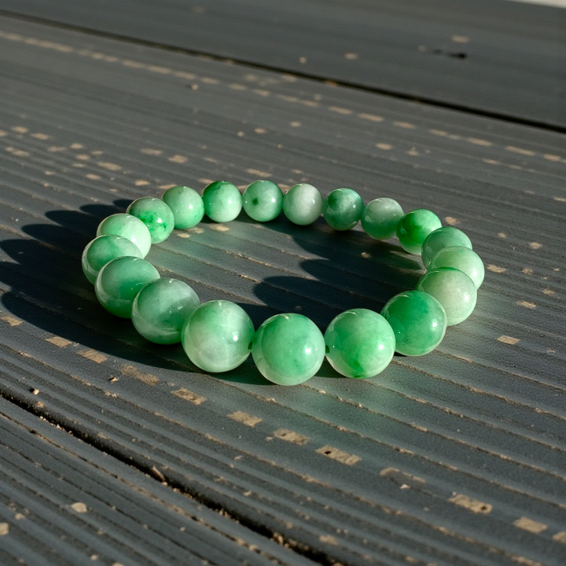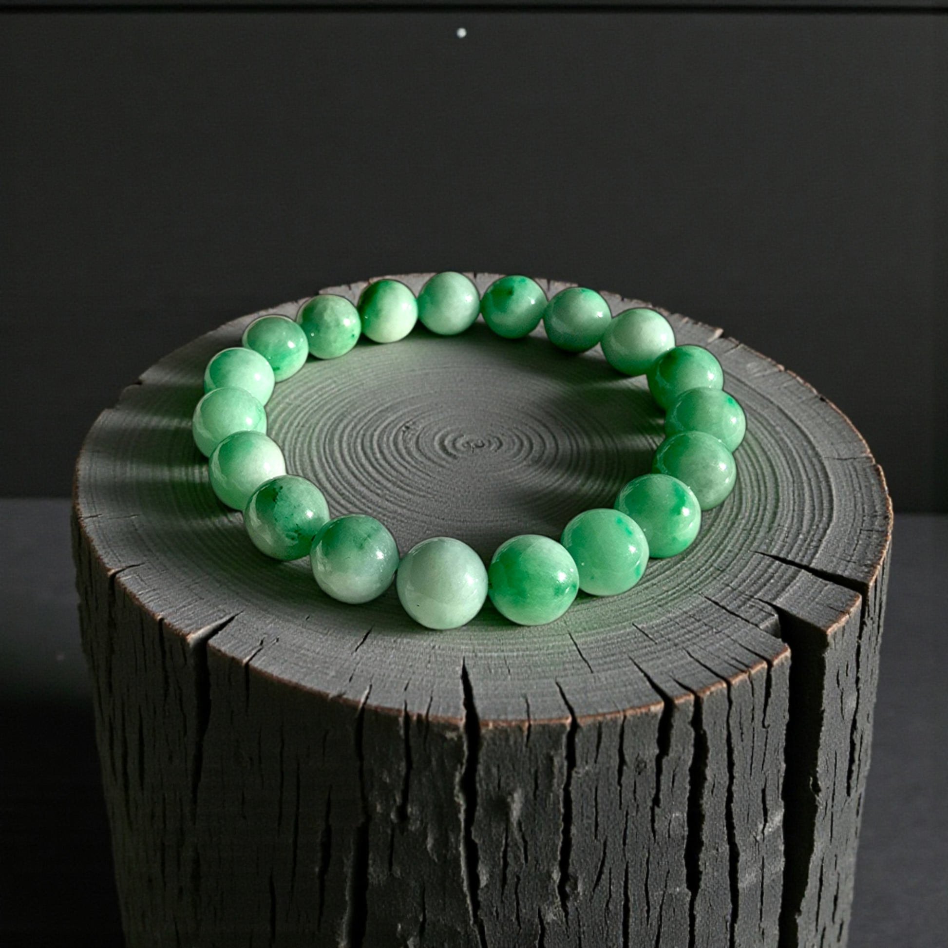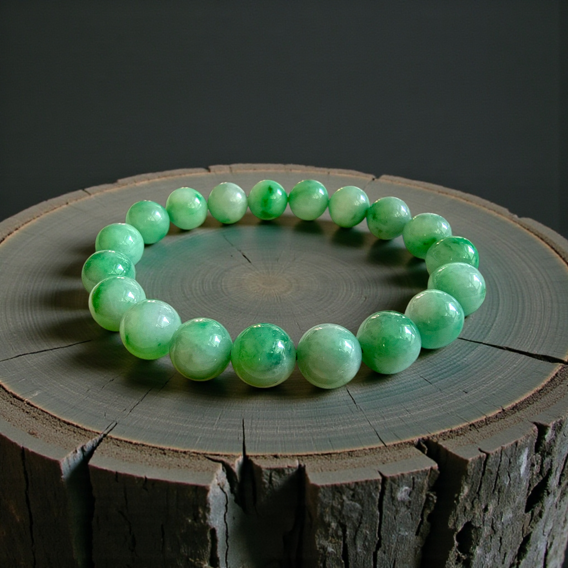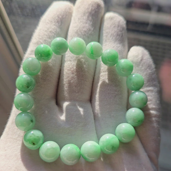 10.50 mm each, 19 perfectly calibrated Green Burmese A-Jadeite Beads. This unique beads bracelet is 100% cut, calibrated, strung, and MADE IN JAPAN. Some of the rarest naturally occurring hues of A-Jadeite, the calibrated Green beads create a visually stunning Bracelet. The Bright Green is interlaced with streaks of Imperial Green, Vivid-Intense Green, Deep green and patches of white jade. With vibrant optics and translucency, the depth of each stone shines.