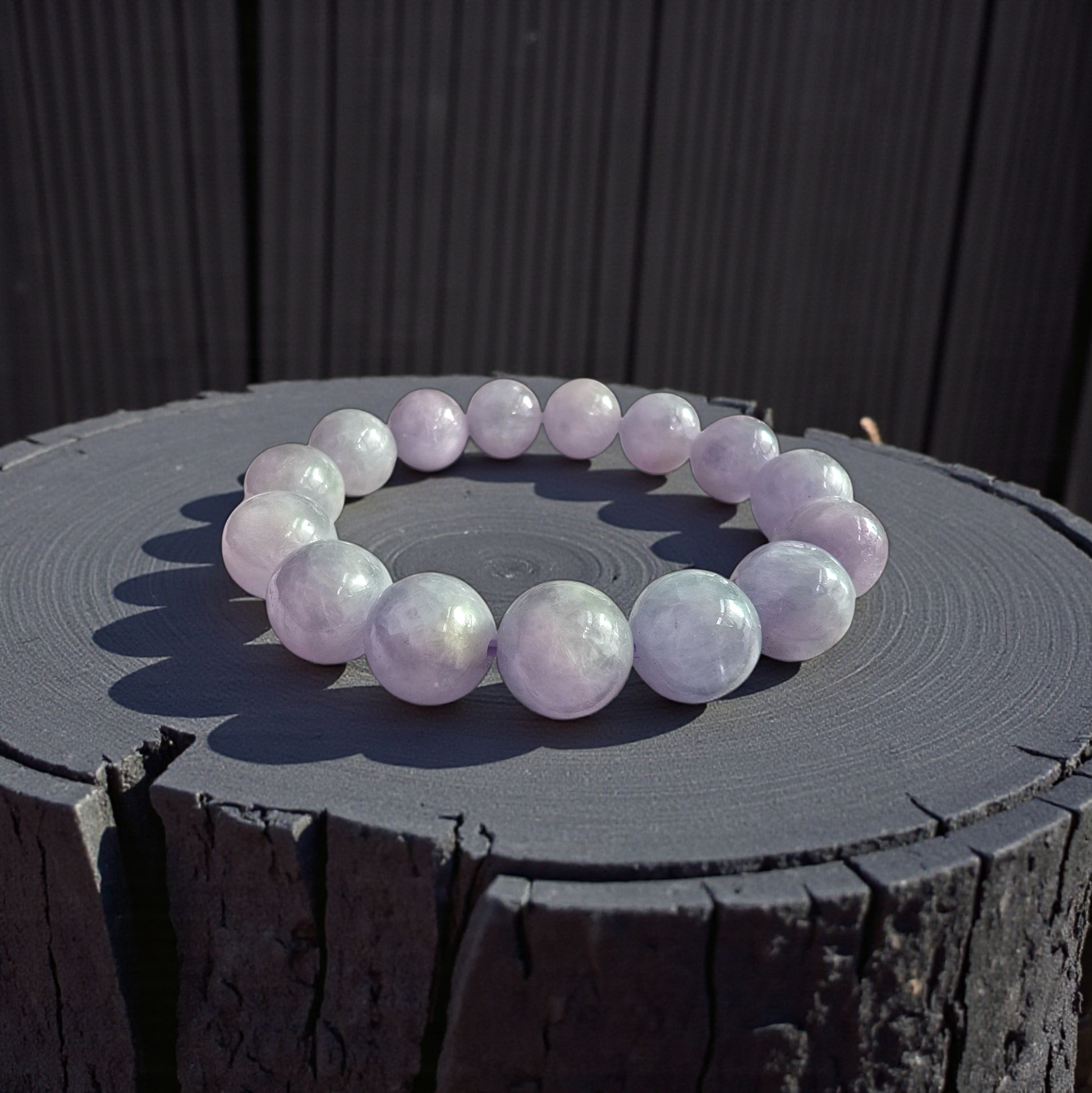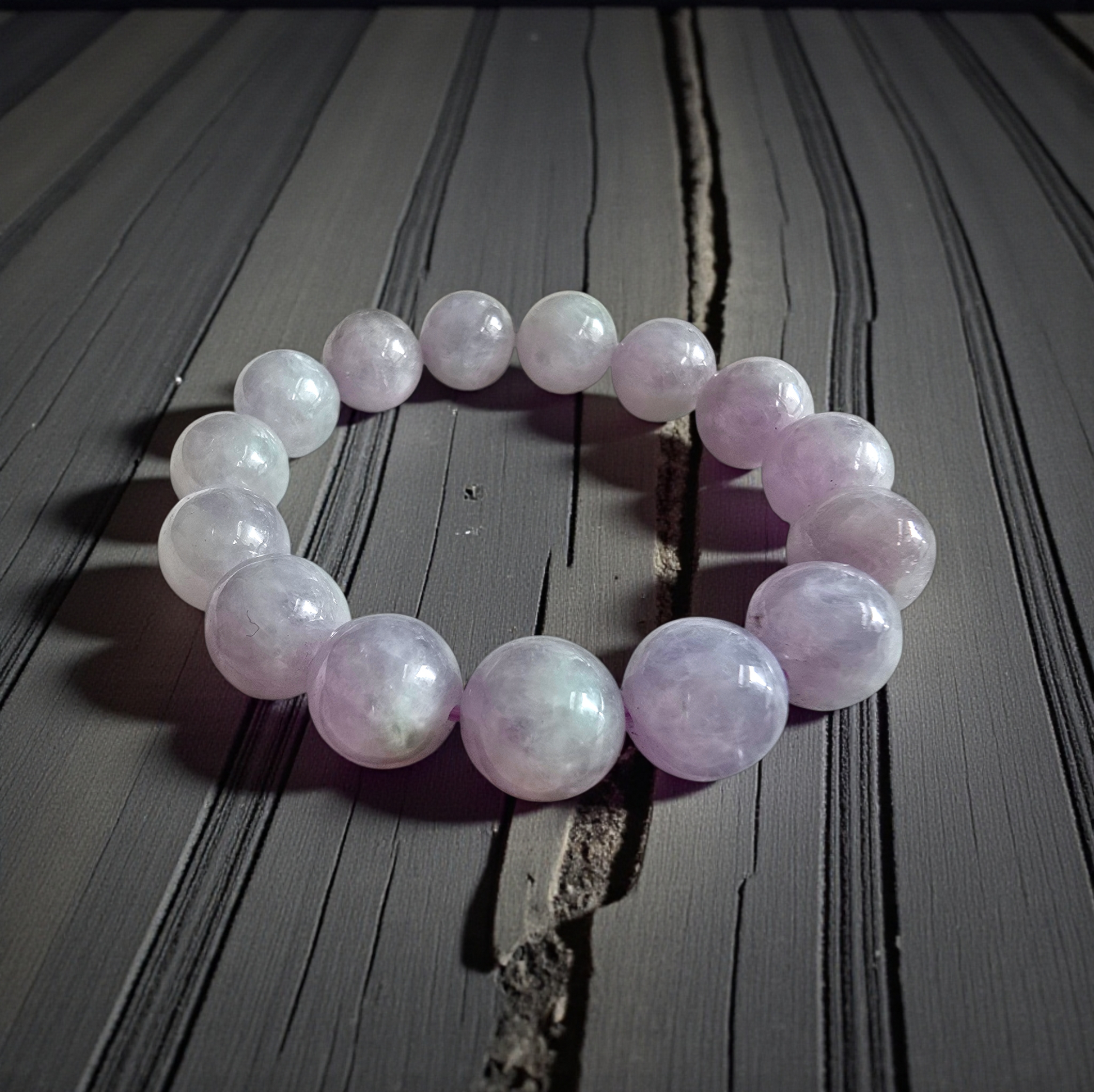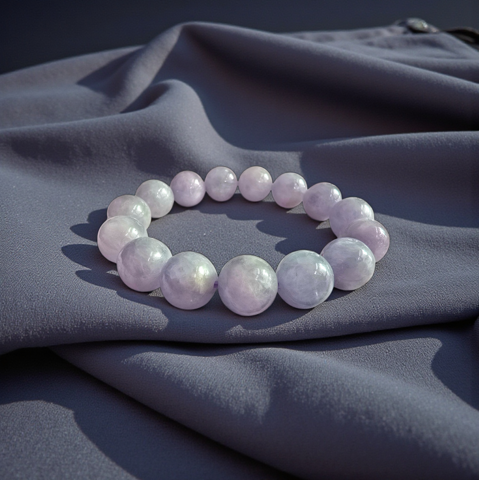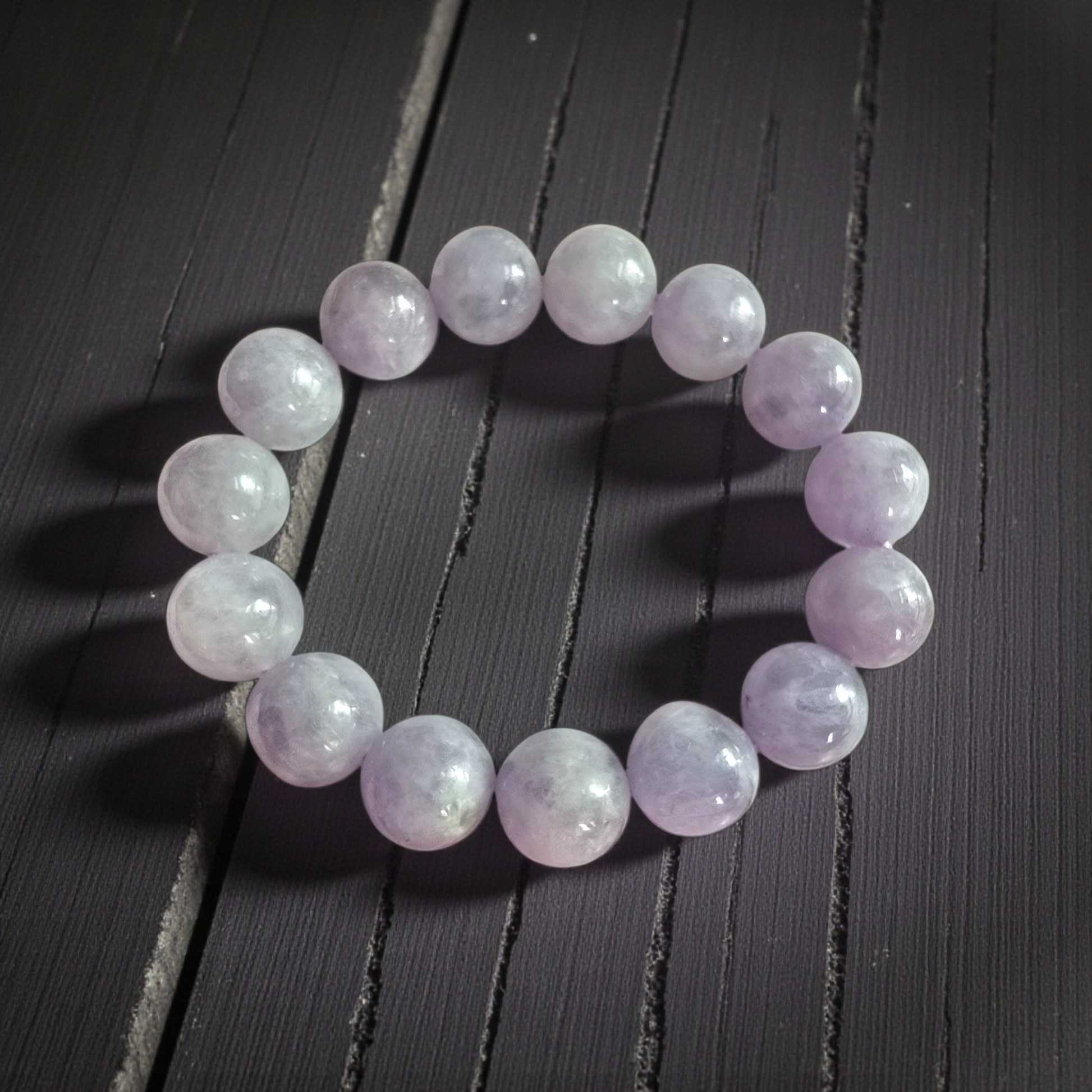 12.50 mm each, 15 perfectly calibrated Lavender Burmese A-Jadeite Beads. This unique beads bracelet is 100% cut, calibrated, strung, and MADE IN JAPAN. Some of the rarest naturally occurring hues of A-Jadeite, the calibrated Purple Lavender beads create a visually stunning Bracelet. The Pale Lavender is interlaced with streaks of Green and patches of white jade; the single block of Jadeite came in a natural two tone block, creating a cohesive yet contrasting effect. With vibrant optics and translucency, the depth of each stone shines.