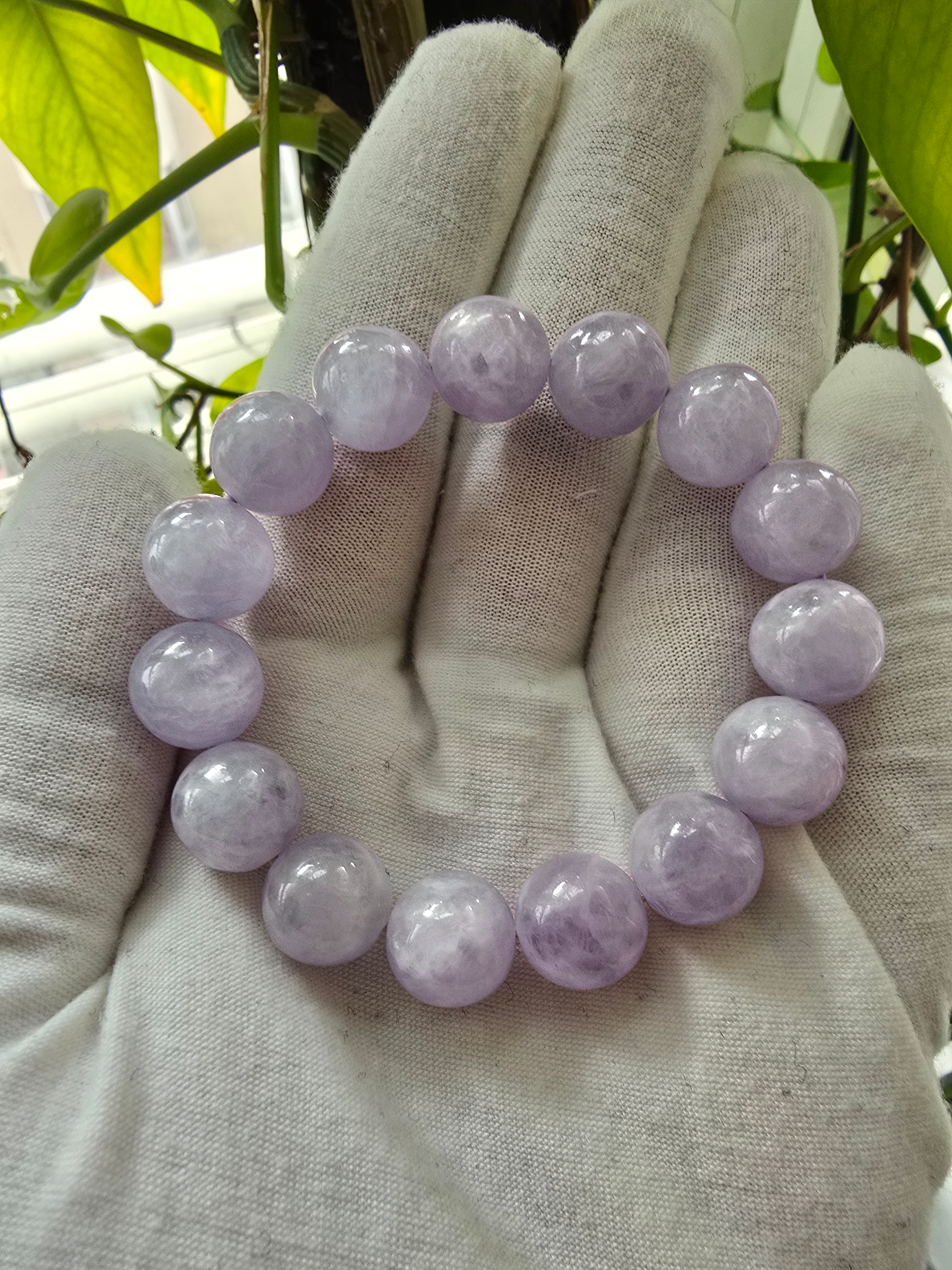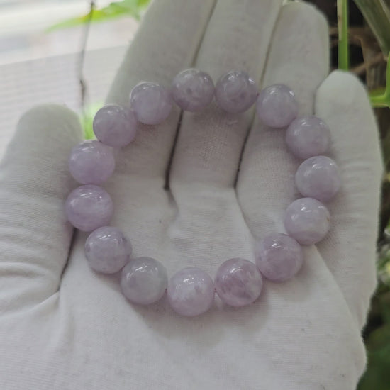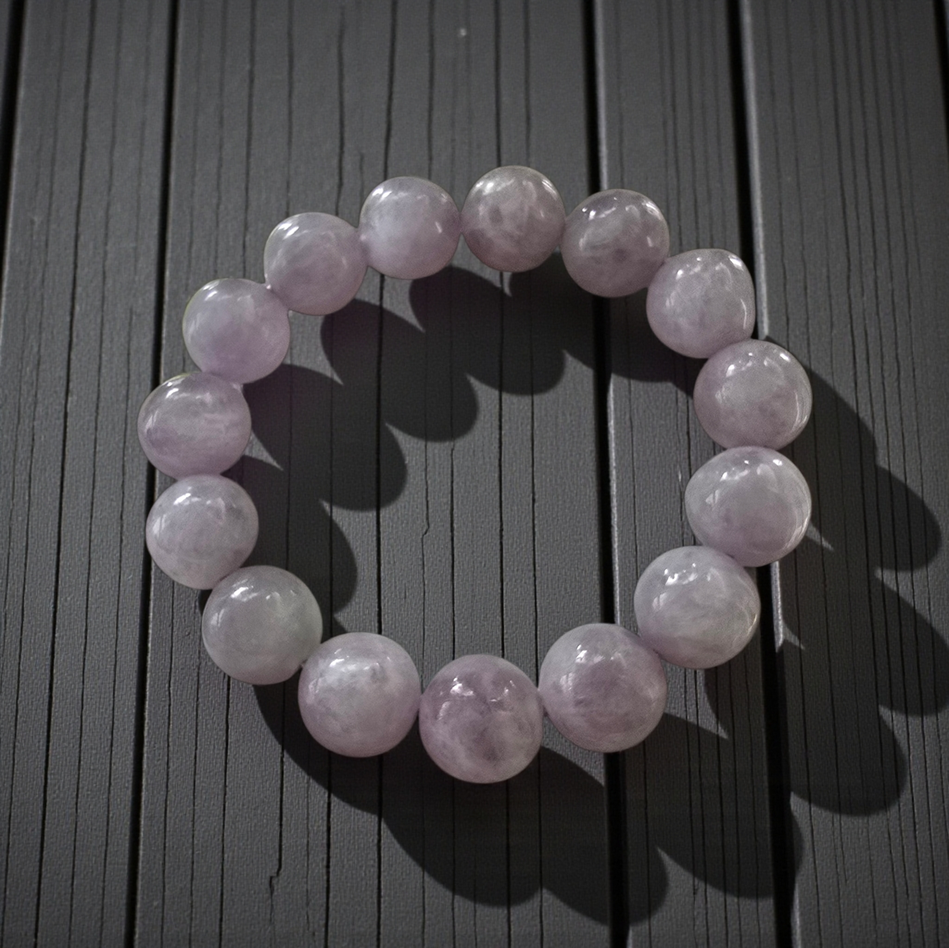 12.50 mm each, 15 perfectly calibrated Lavender Burmese A-Jadeite Beads. This unique beads bracelet is 100% cut, calibrated, strung, and MADE IN JAPAN. Some of the rarest naturally occurring hues of A-Jadeite, the calibrated Purple Lavender beads create a visually stunning Bracelet. The Pale Lavender is interlaced with patches of White Jade and a few spots of Red Jade.With vibrant optics and translucency, the depth of each stone shines.