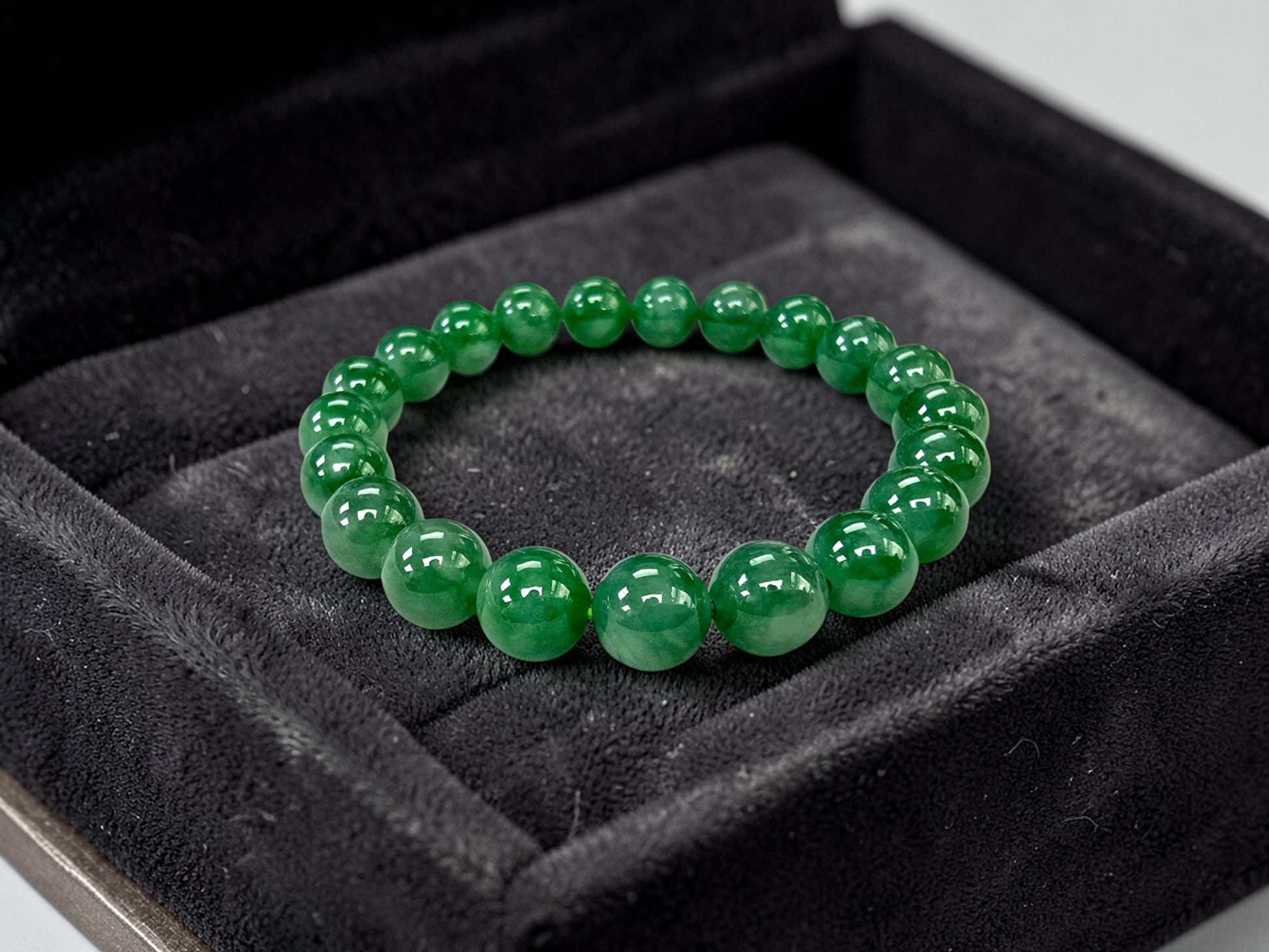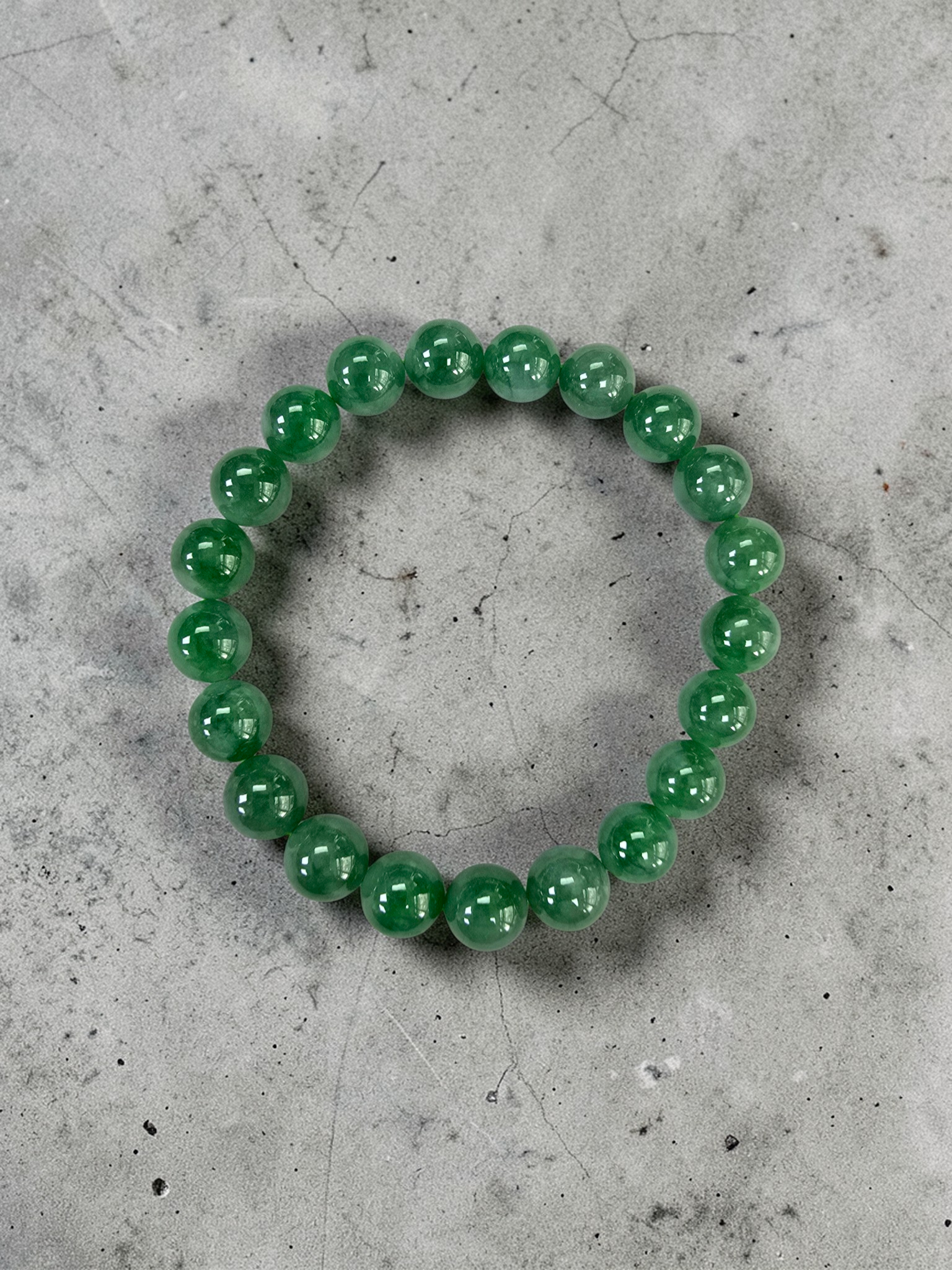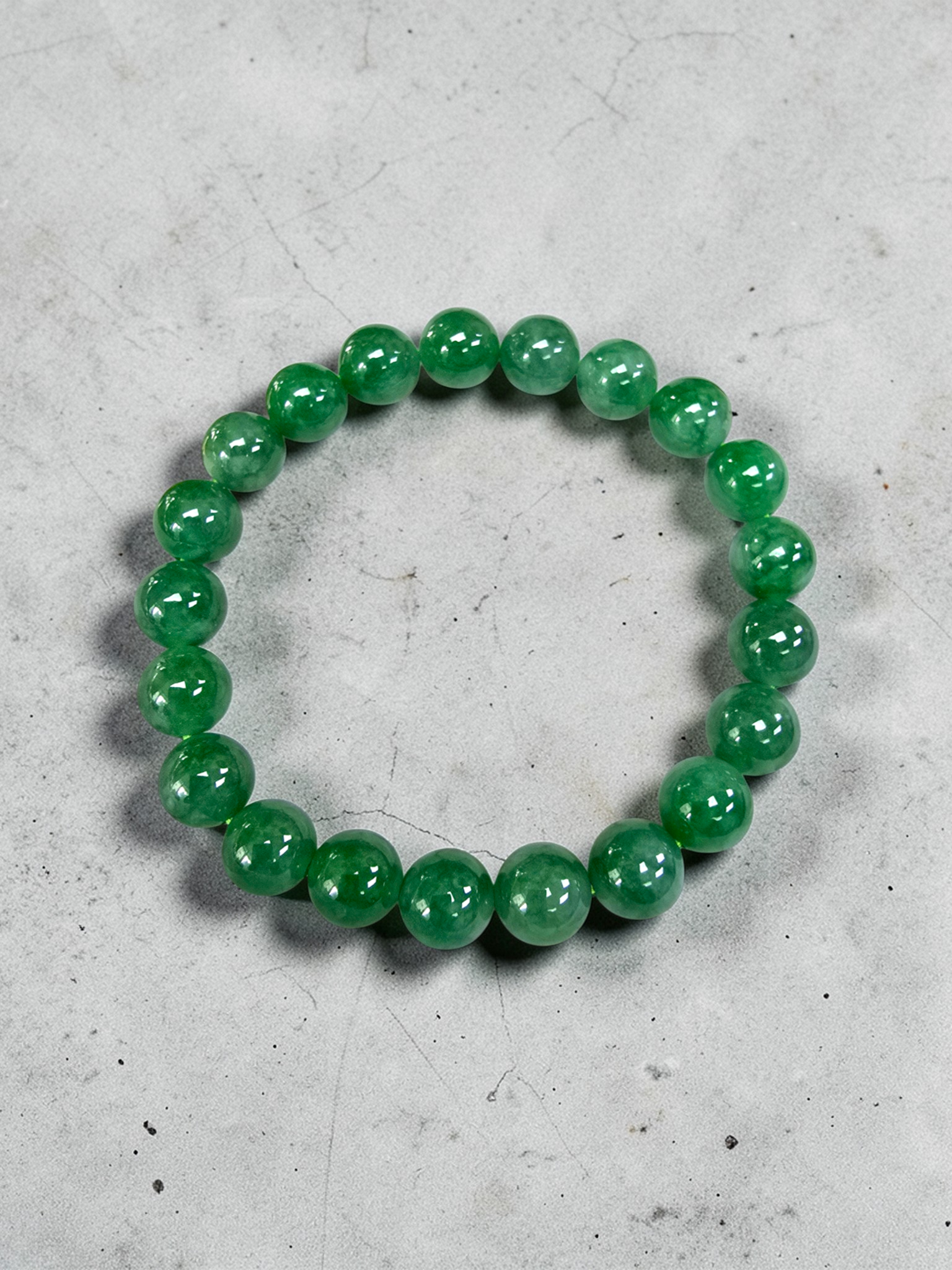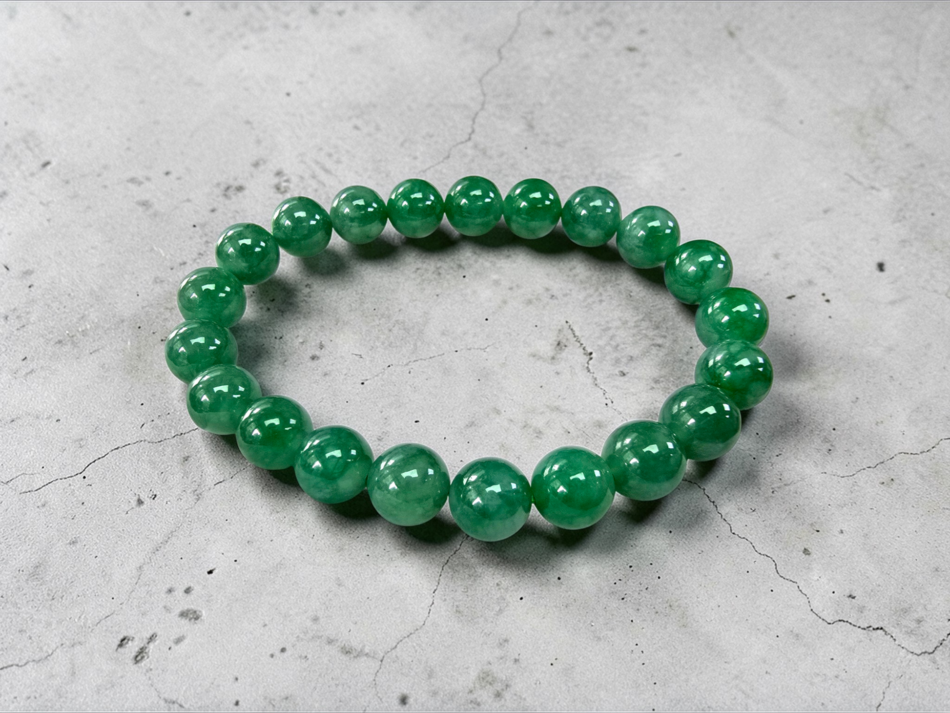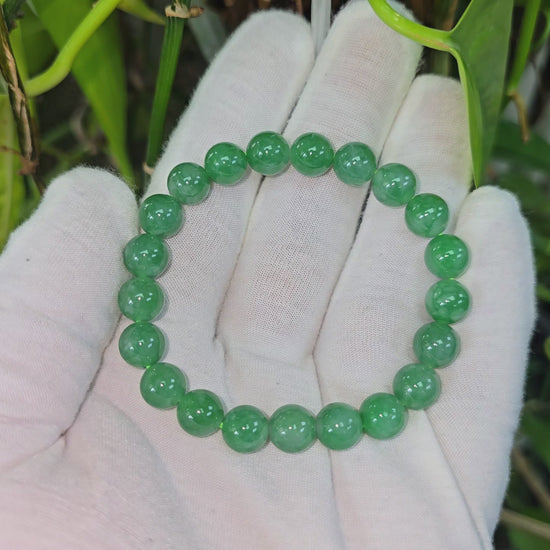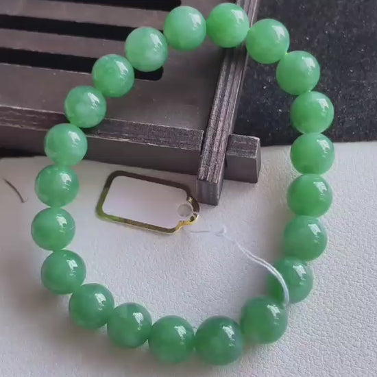 9.50mm each, 21 perfectly calibrated Vivid Imperial Green Burmese A-Jadeite Beads. This unique beads bracelet is 100% cut, calibrated, strung, and MADE IN JAPAN. Some of the rarest naturally occurring hues of A-Jadeite, the calibrated Green beads create a visually stunning Bracelet. The Vivid color is consistent and clean, with patches and streaks of Imperial, Vivid, Bright, and Deep Green. With excellent translucency and depth. With vibrant optics and translucency, the depth of each stone shines