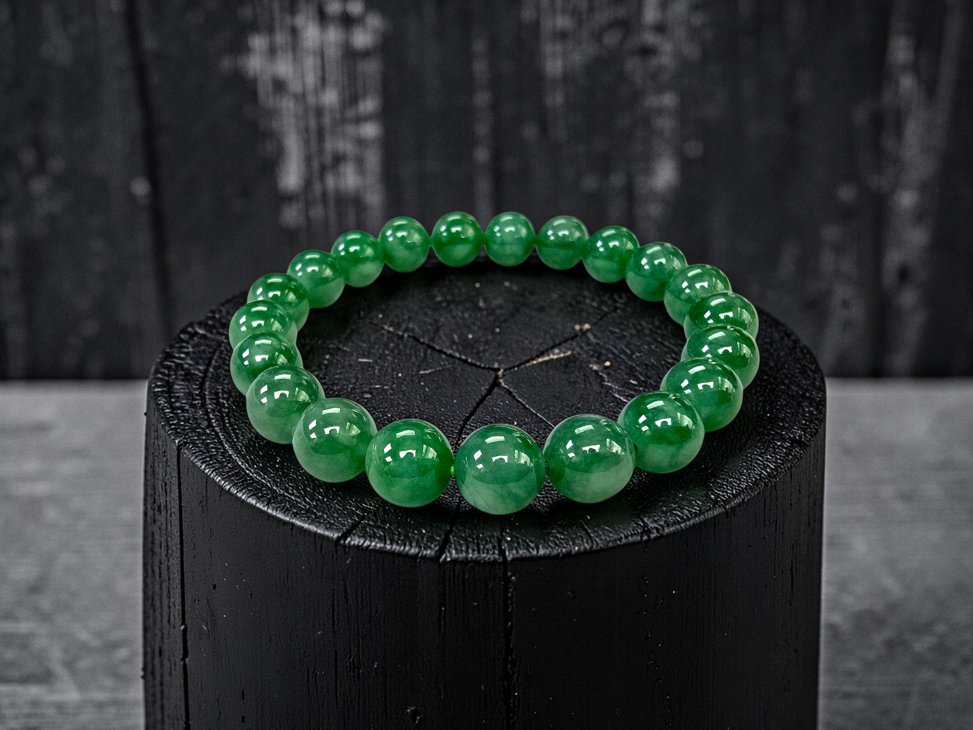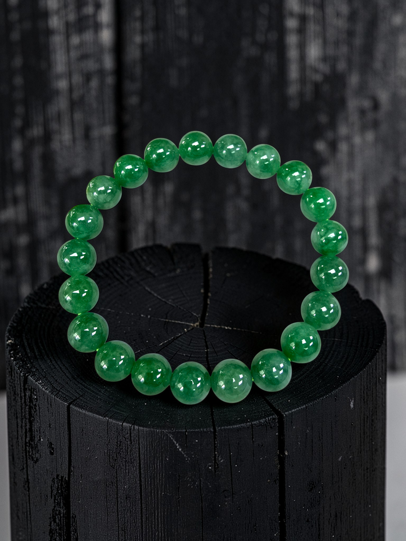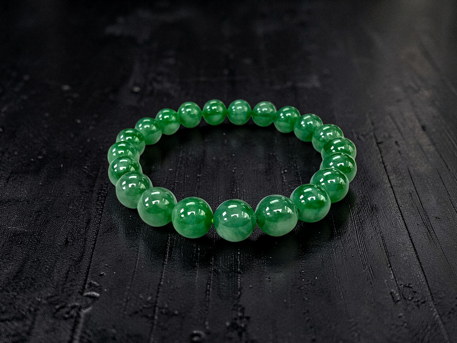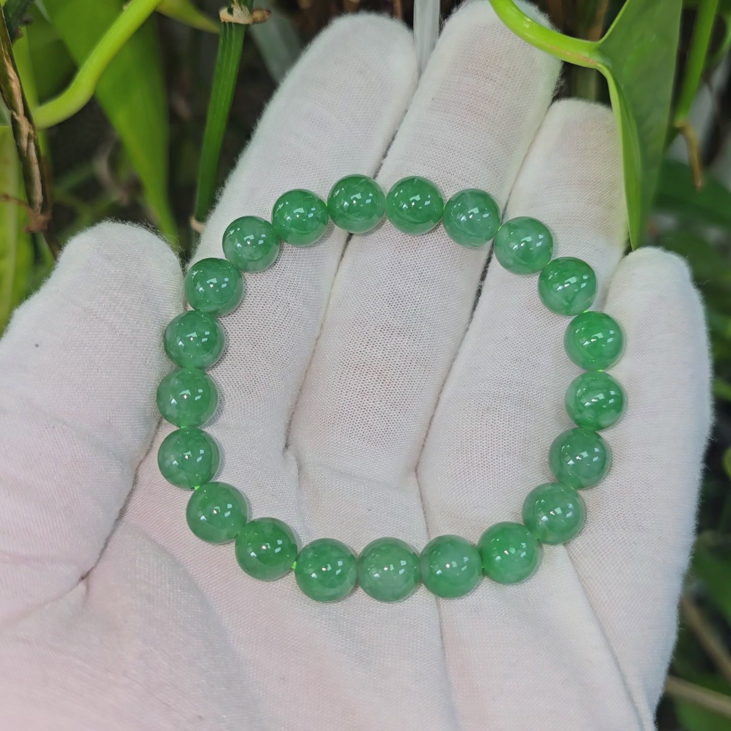 9.50mm each, 21 perfectly calibrated Vivid Imperial Green Burmese A-Jadeite Beads. This unique beads bracelet is 100% cut, calibrated, strung, and MADE IN JAPAN. Some of the rarest naturally occurring hues of A-Jadeite, the calibrated Green beads create a visually stunning Bracelet. The Vivid color is consistent and clean, with patches and streaks of Imperial, Vivid, Bright, and Deep Green. With excellent translucency and depth. With vibrant optics and translucency, the depth of each stone shines