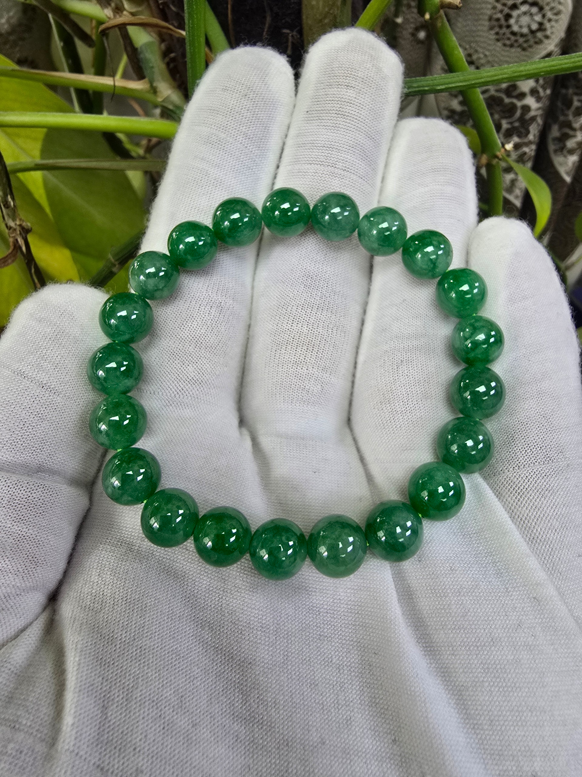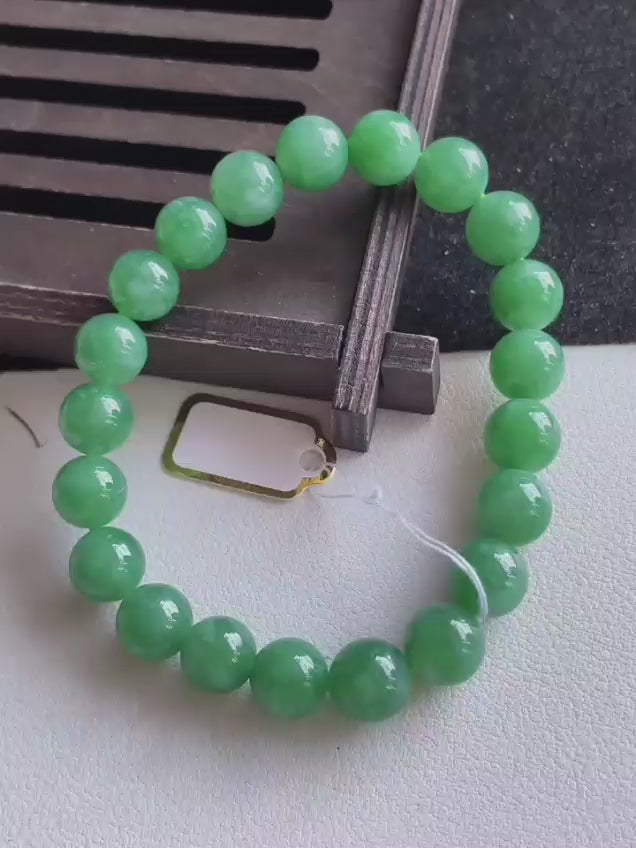 Certified Japanese Vivid Imperial Green Burmese A-Jade Beaded Bracelet (MADE IN JAPAN) (9.50 mm Each x 21 beads) 05050