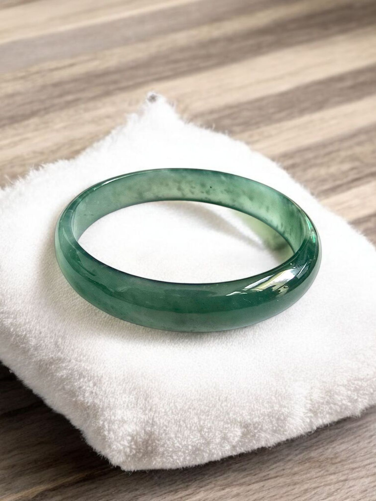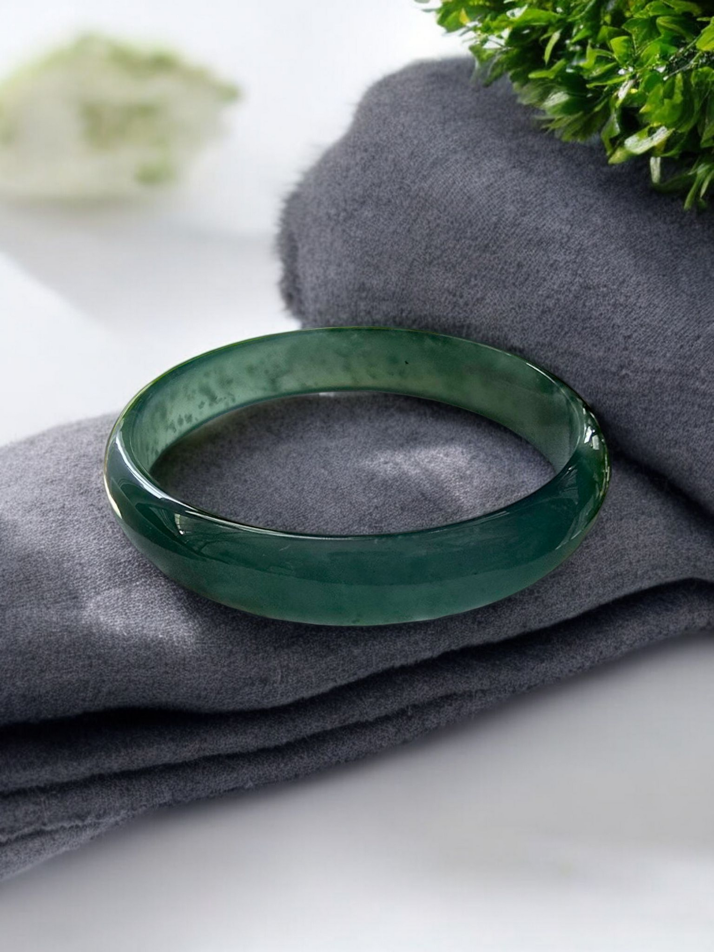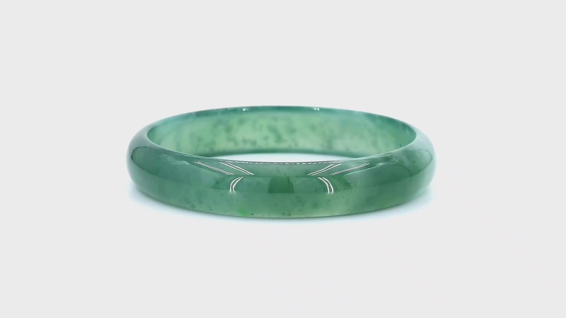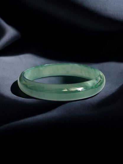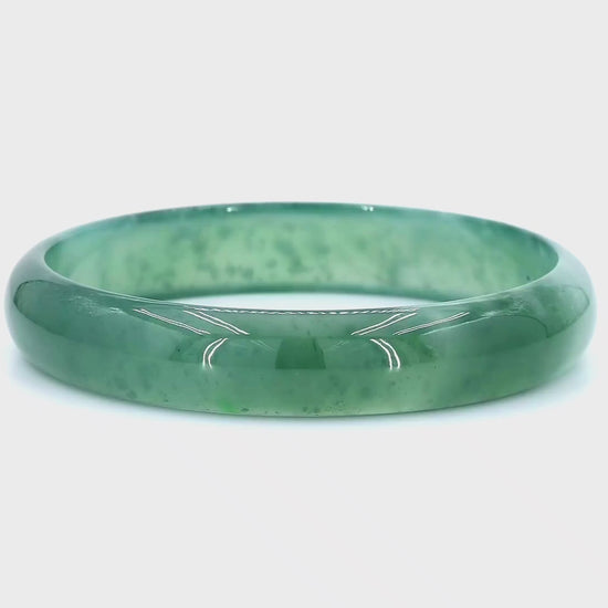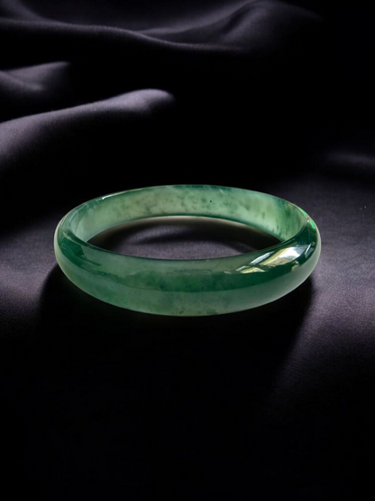 Using the best Handpicked untreated natural A-Jadeite from Burma, we created an authoritative and classy statement bangle bracelet. This unique block of Jadeite has Vivid Blue-Green marbling, patches and splashes of Vibrant Green, Deep Green and White. Interlaced with fibrous white patterns, the optical effect is stunning. The watery texture and icy translucency in parts, are blended with depth of color and splashes of pattern.
