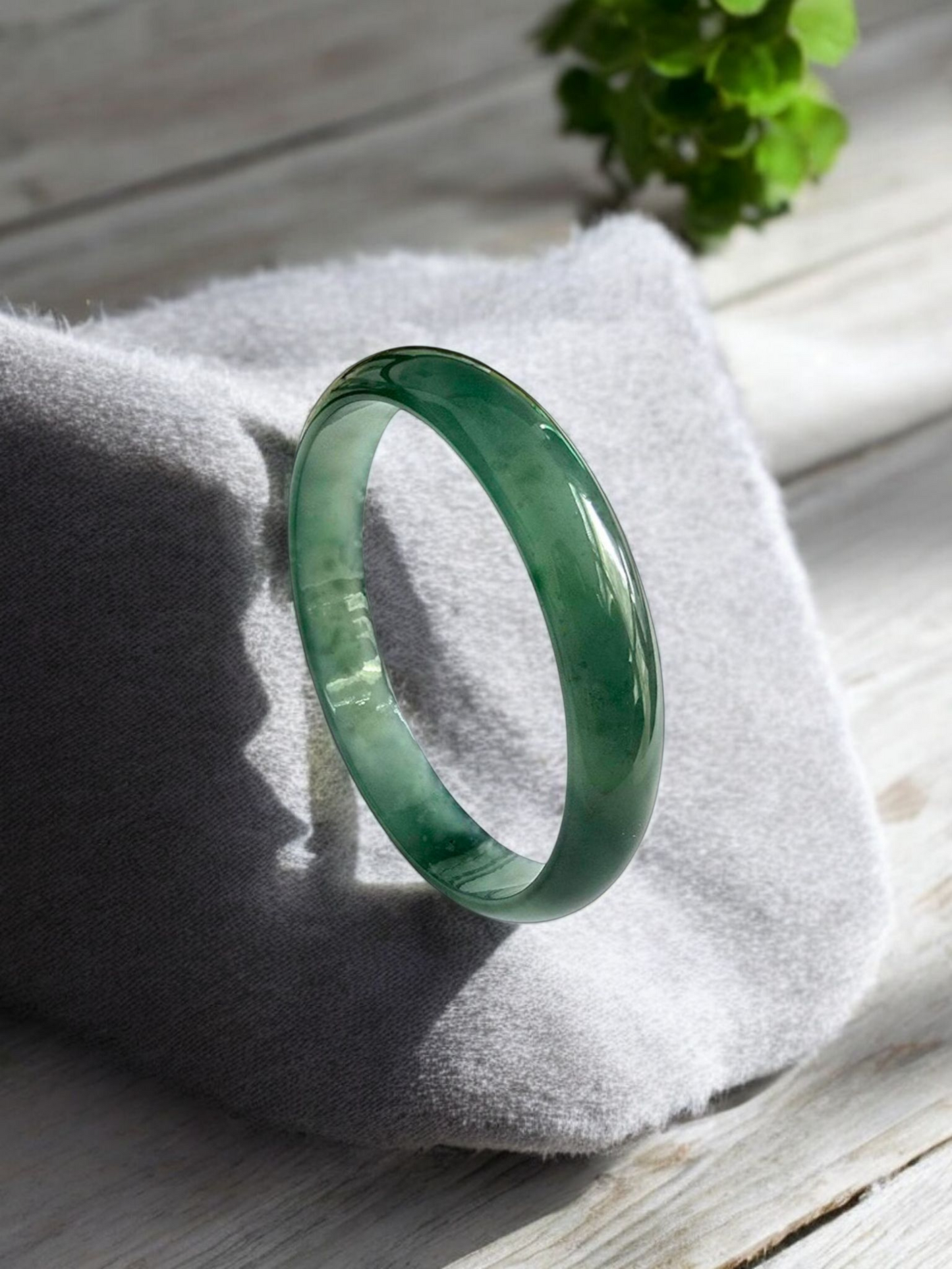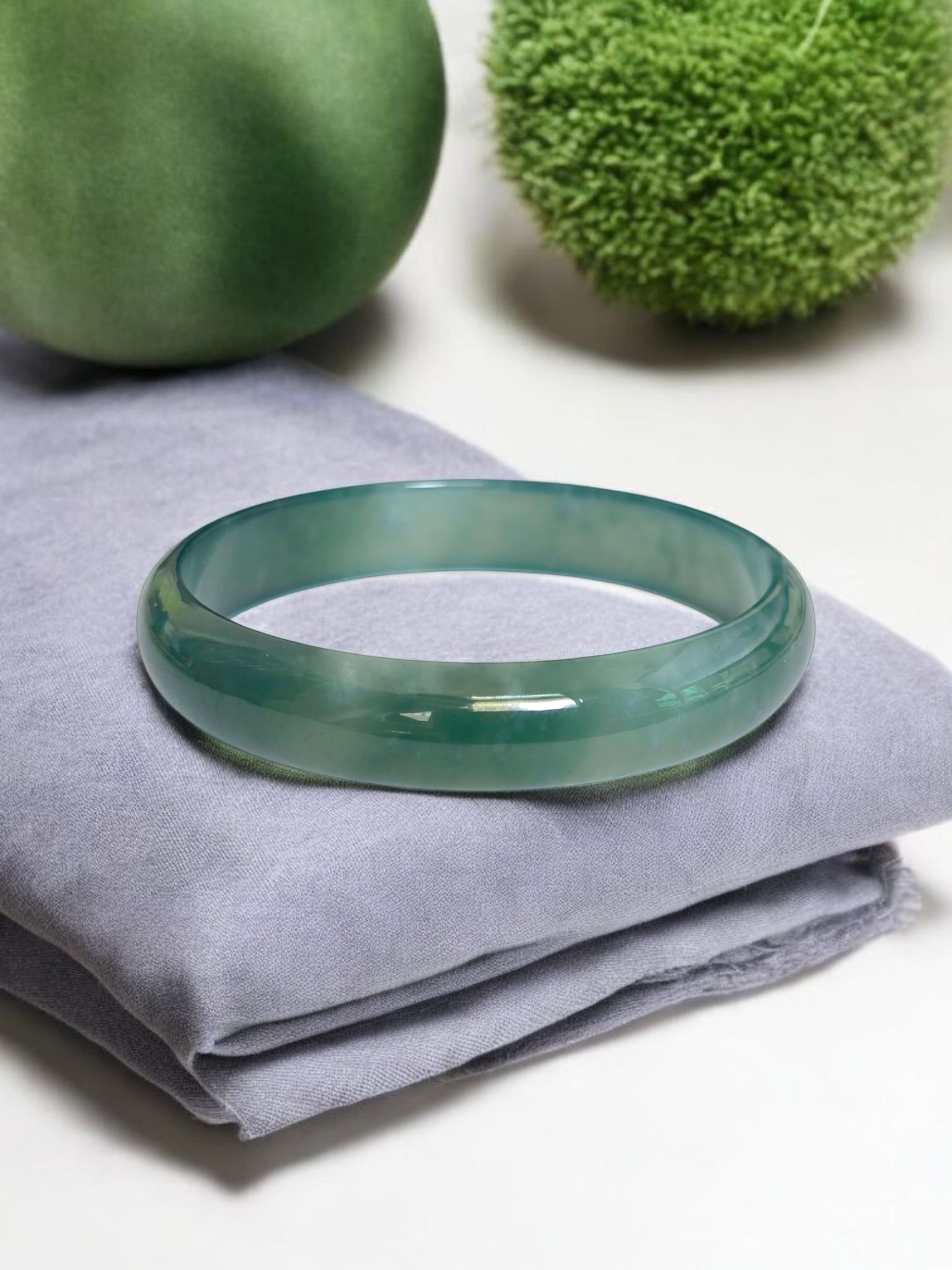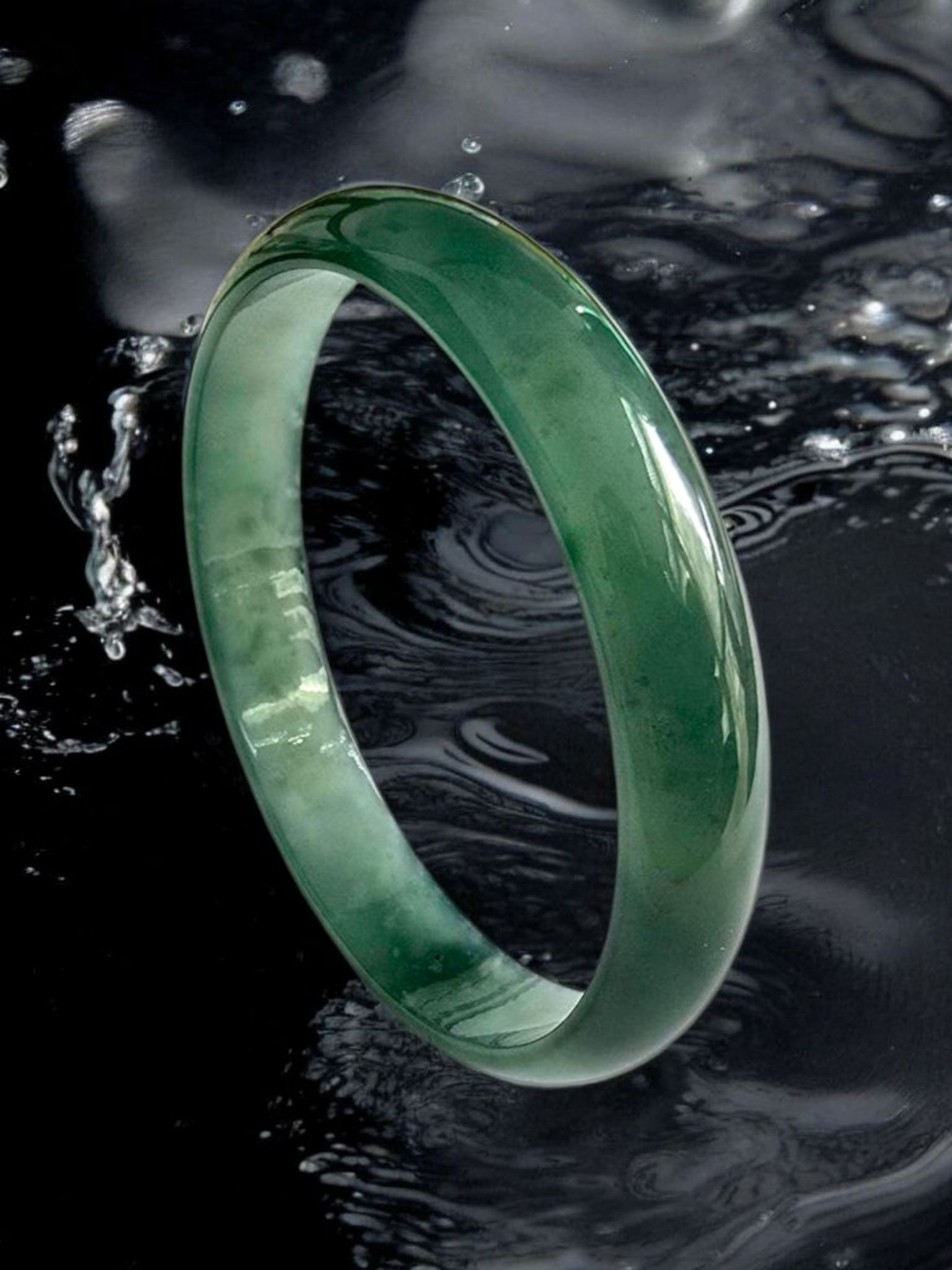 Using the best Handpicked untreated natural A-Jadeite from Burma, we created an authoritative and classy statement bangle bracelet. This unique block of Jadeite has Vivid Blue-Green marbling, patches and splashes of Vibrant Green, Deep Green and White. Interlaced with fibrous white patterns, the optical effect is stunning. The watery texture and icy translucency in parts, are blended with depth of color and splashes of pattern.