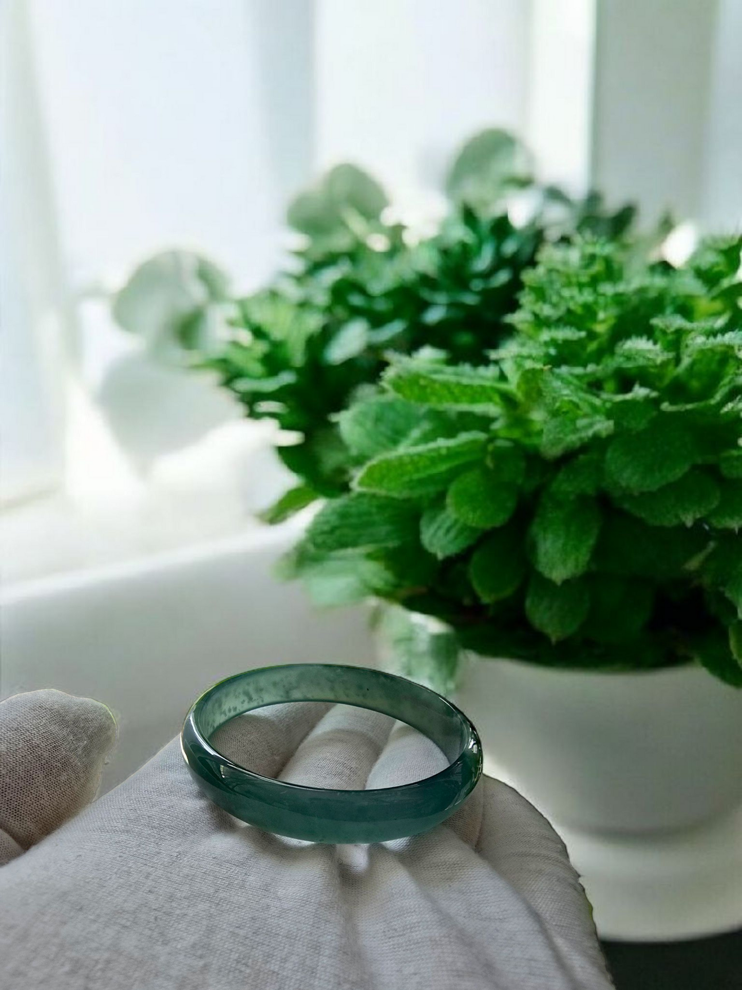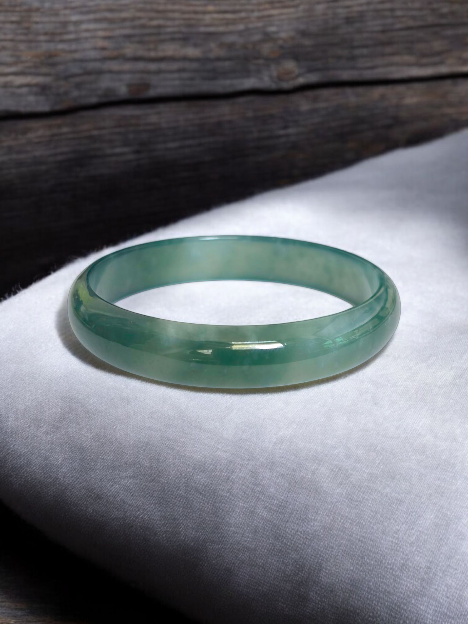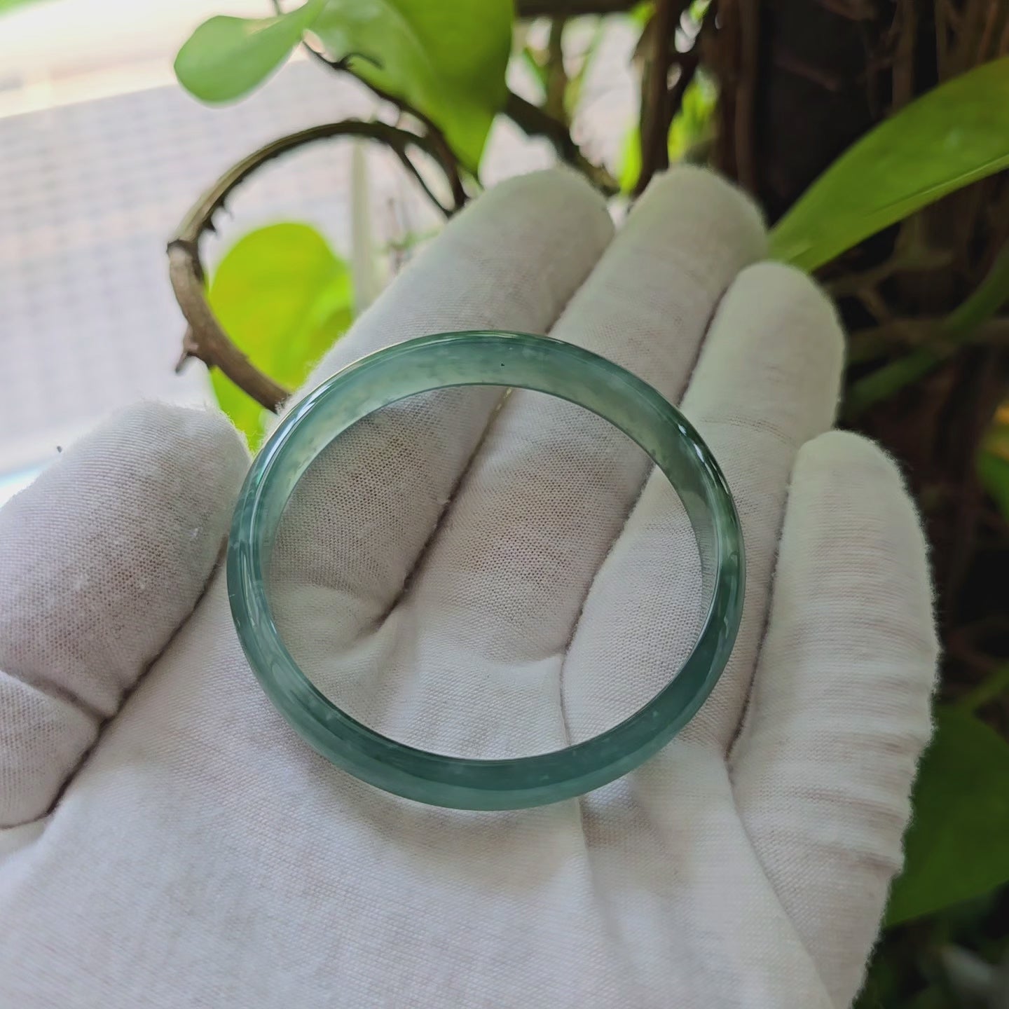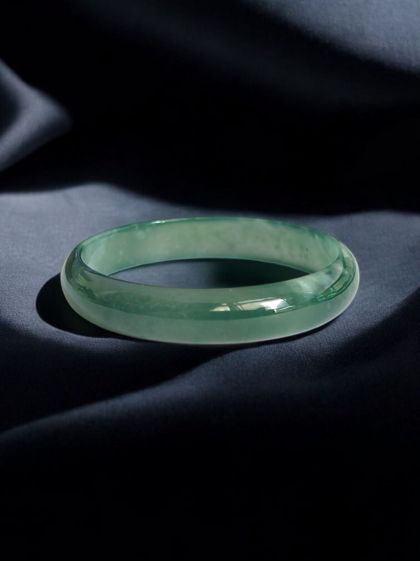 Using the best Handpicked untreated natural A-Jadeite from Burma, we created an authoritative and classy statement bangle bracelet. This unique block of Jadeite has Vivid Blue-Green marbling, patches and splashes of Vibrant Green, Deep Green and White. Interlaced with fibrous white patterns, the optical effect is stunning. The watery texture and icy translucency in parts, are blended with depth of color and splashes of pattern.