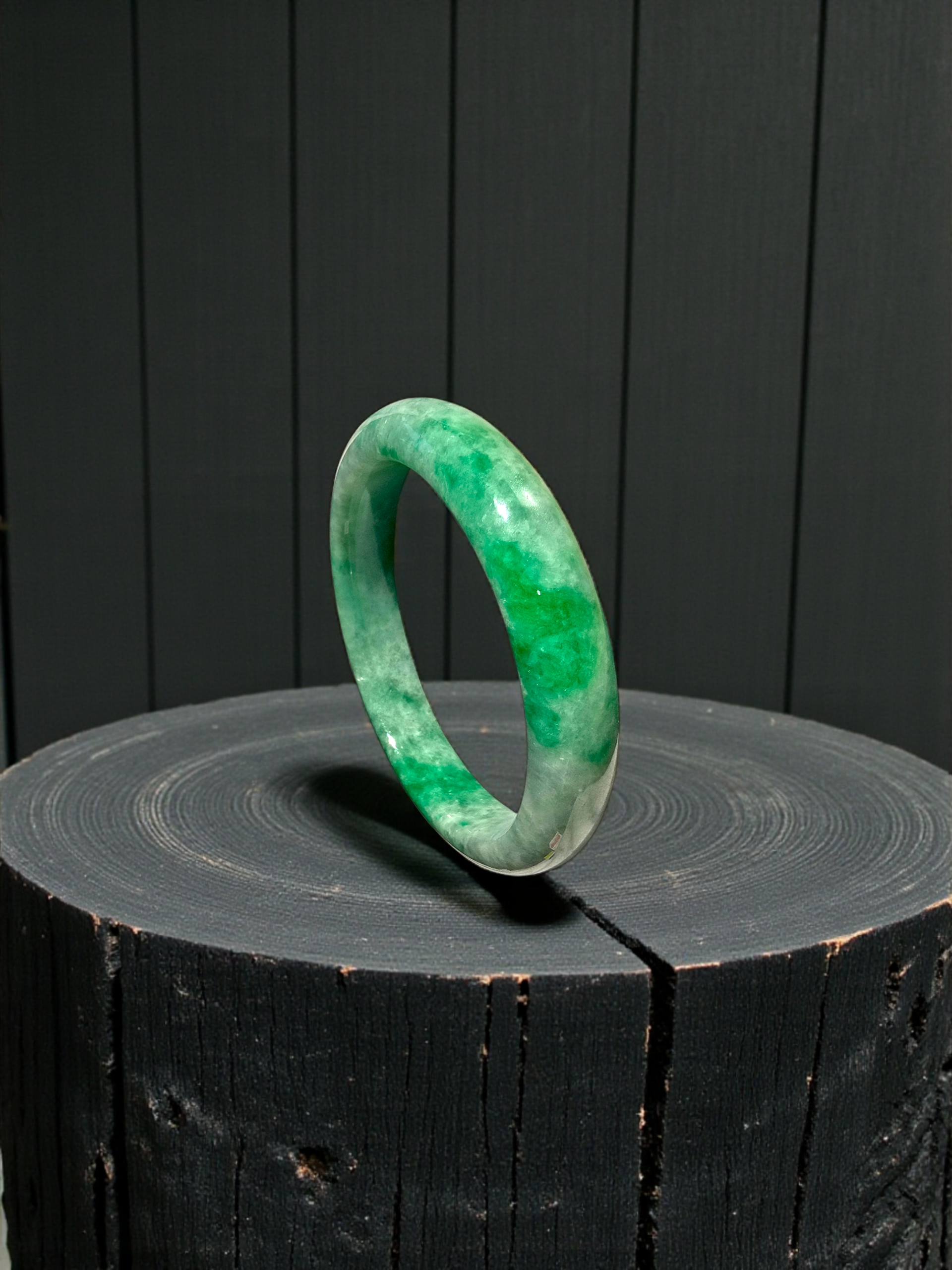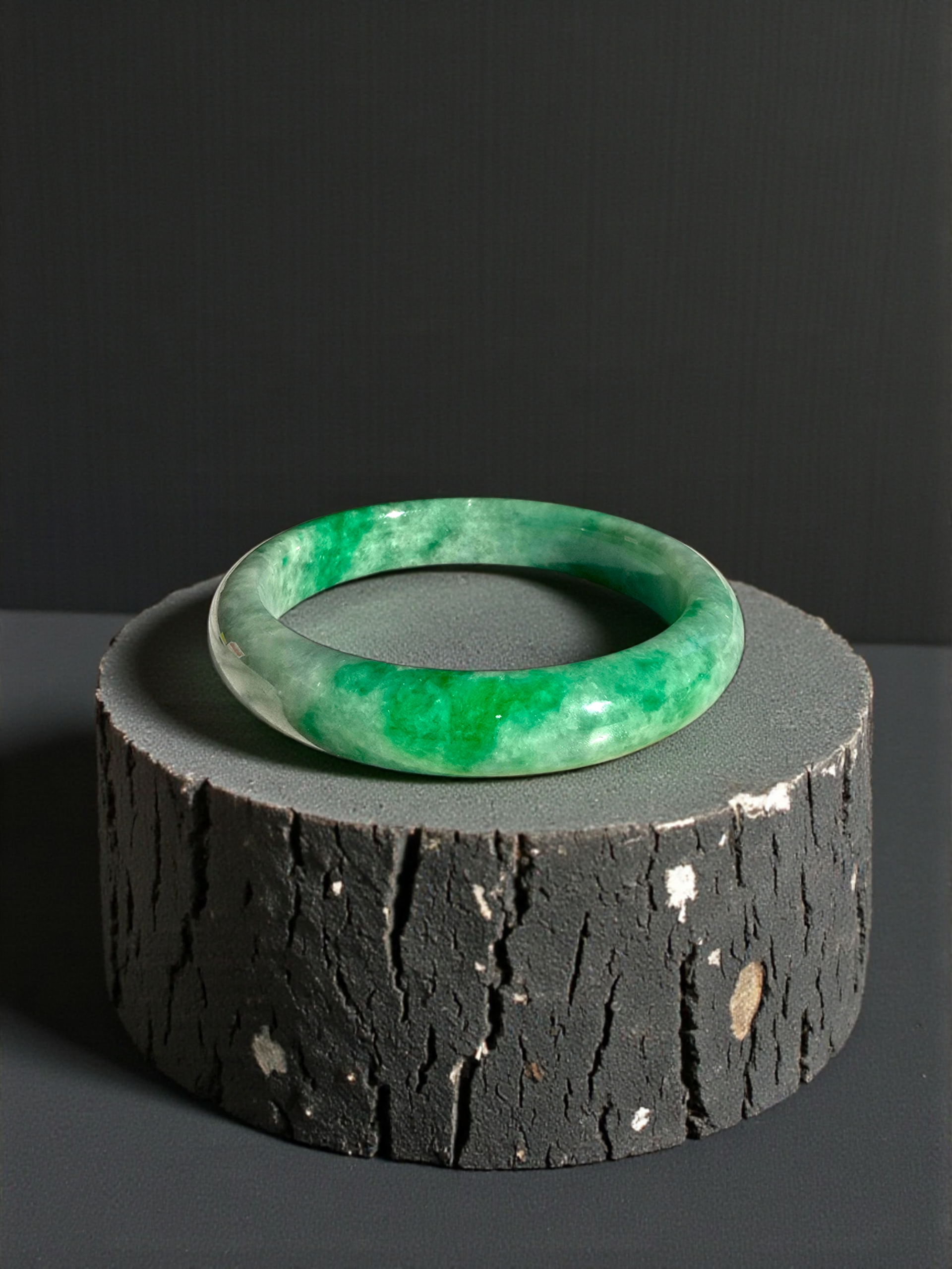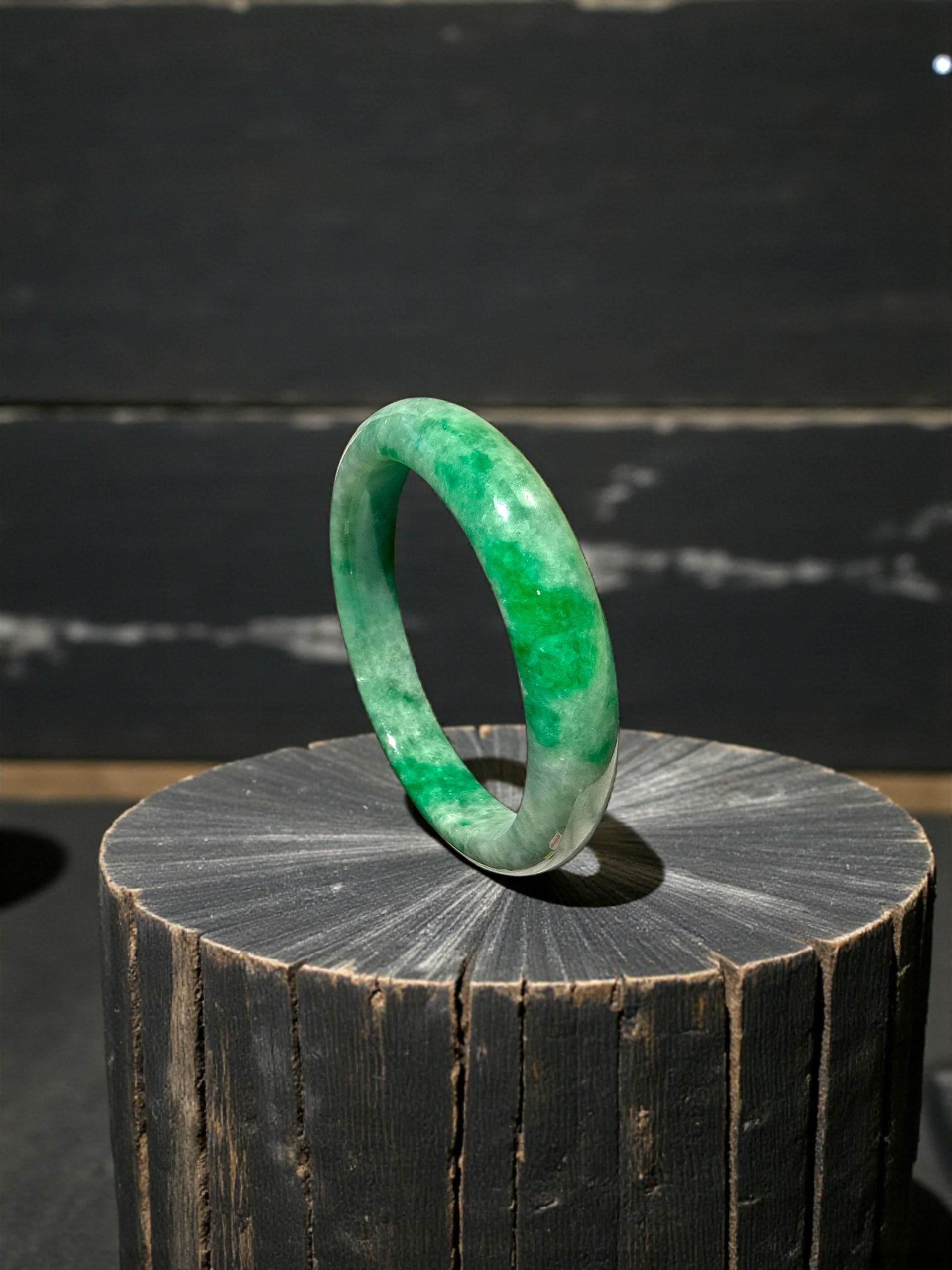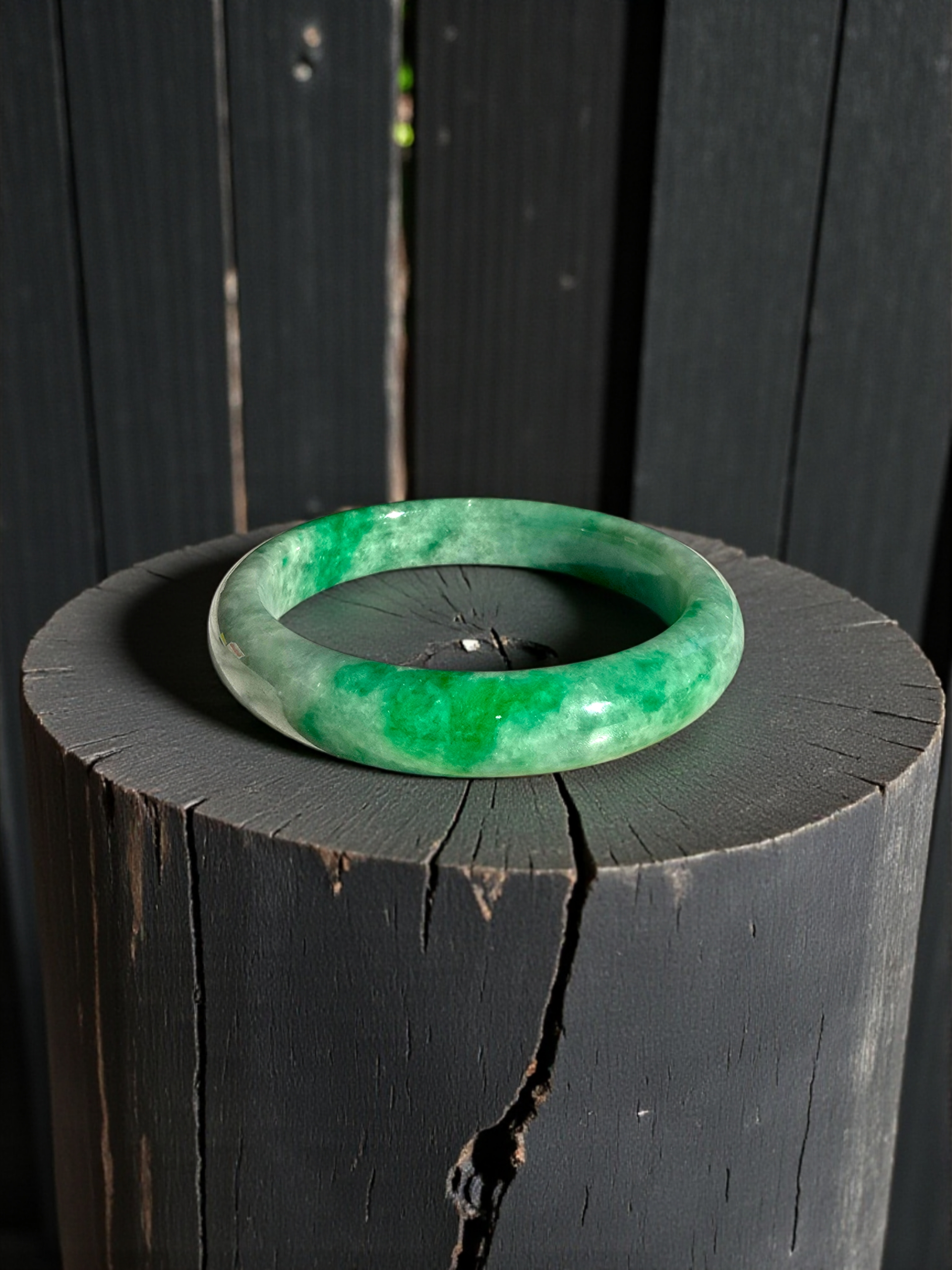 Using the best Handpicked untreated natural A-Jadeite from Burma, we created an authoritative and classy statement bangle bracelet. This unique block of Jadeite has a Green base hue, with marbling, patches and splashes of Imperial Intense Green, Vivid-Vibrant Green, Deep Green, and White. Interlaced with fibrous and patchy interwoven green patterns, the optical effect is stunning. The Fibrous texture and icy translucency in parts, are blended with depth of color and splashes of pattern.